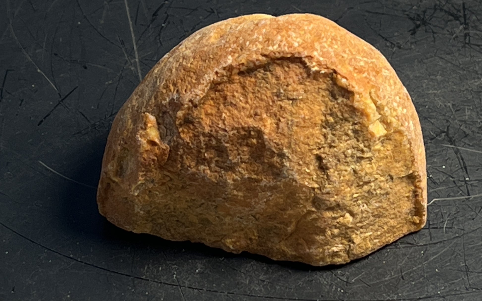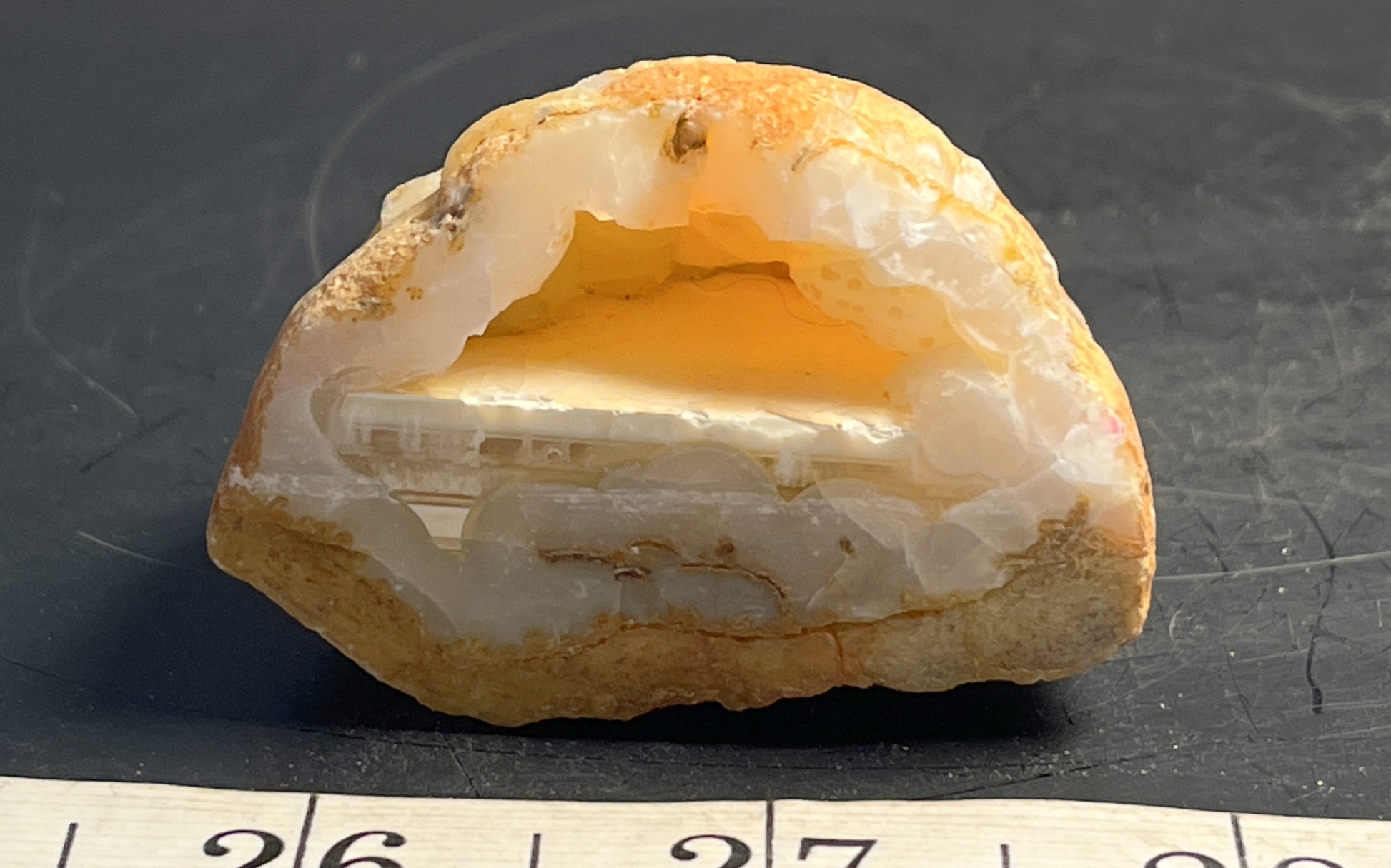 This striking Agate Geode Half 050 boasts a stunning combination of yellow-orange and white colors. The polished surface accentuates the exquisite agate that encompasses the quartz and chalcedony filled cavity. This half measures 2" x 1.5" and weighs 2.50 ounces, making it a valuable piece for any collection.