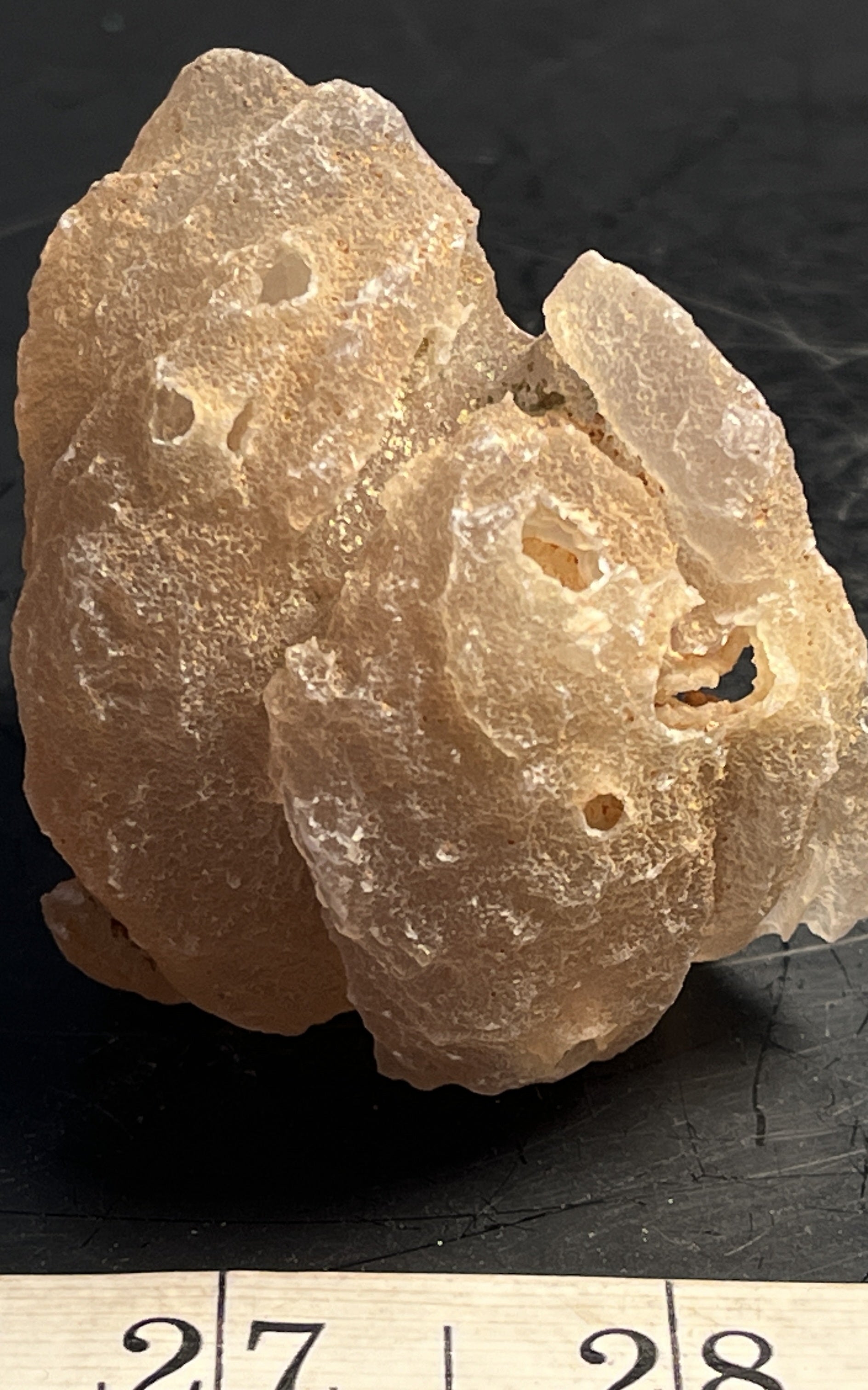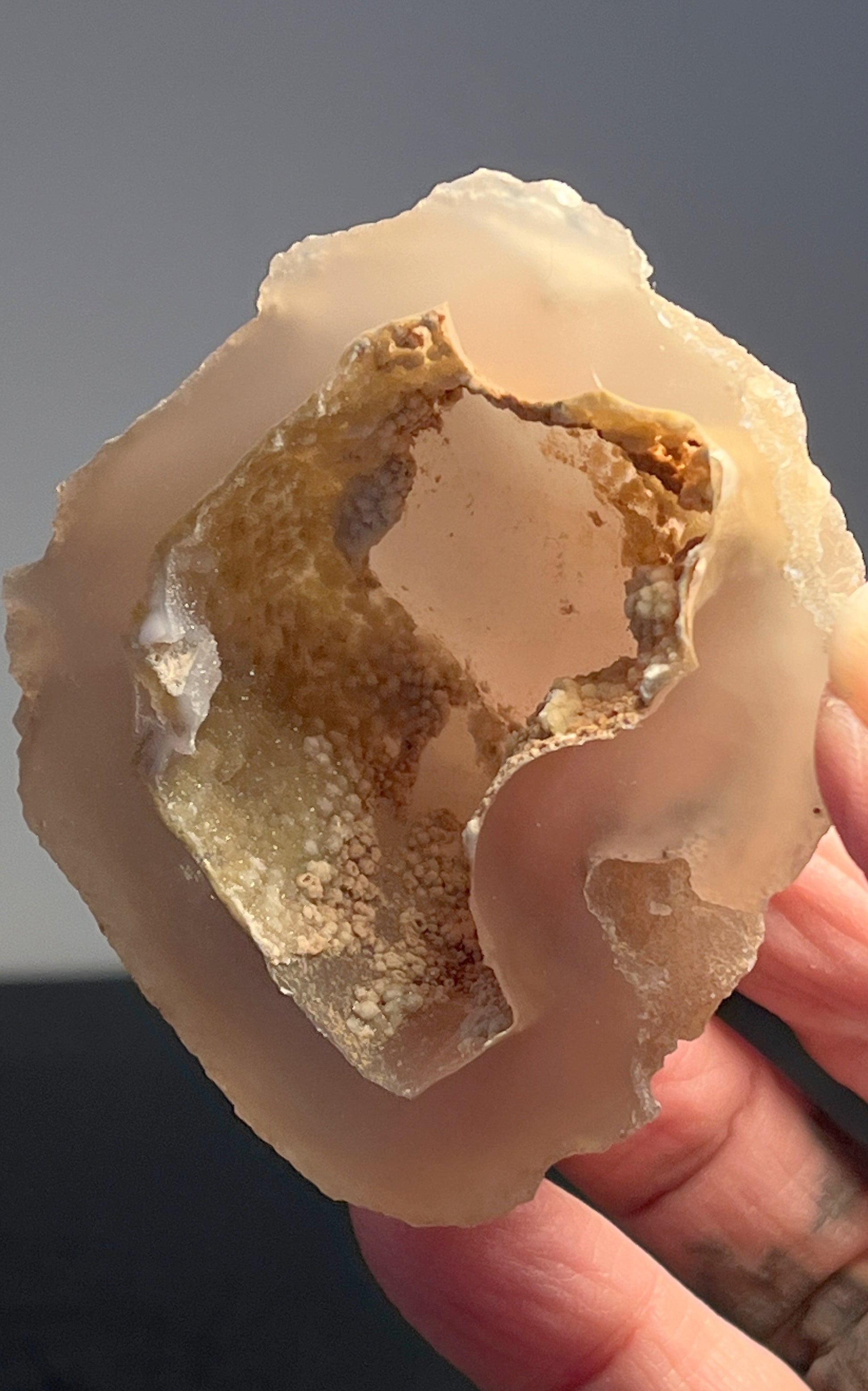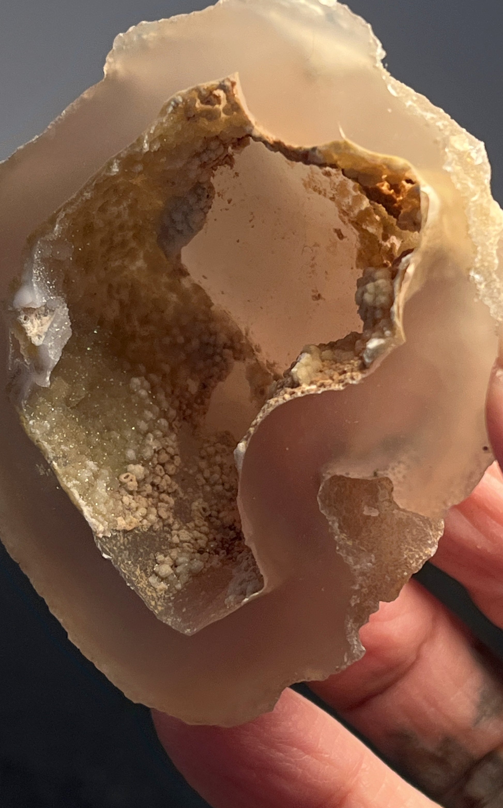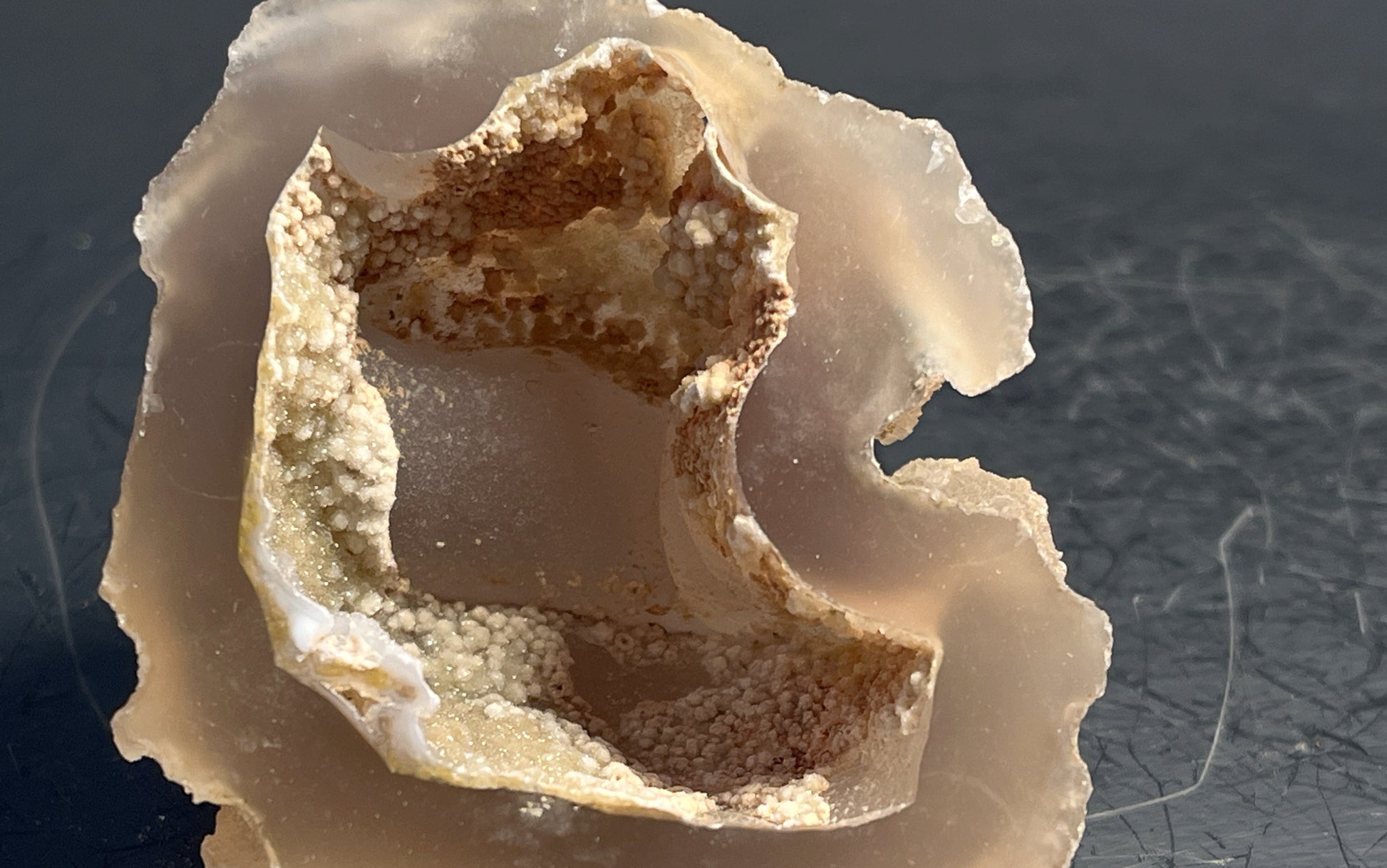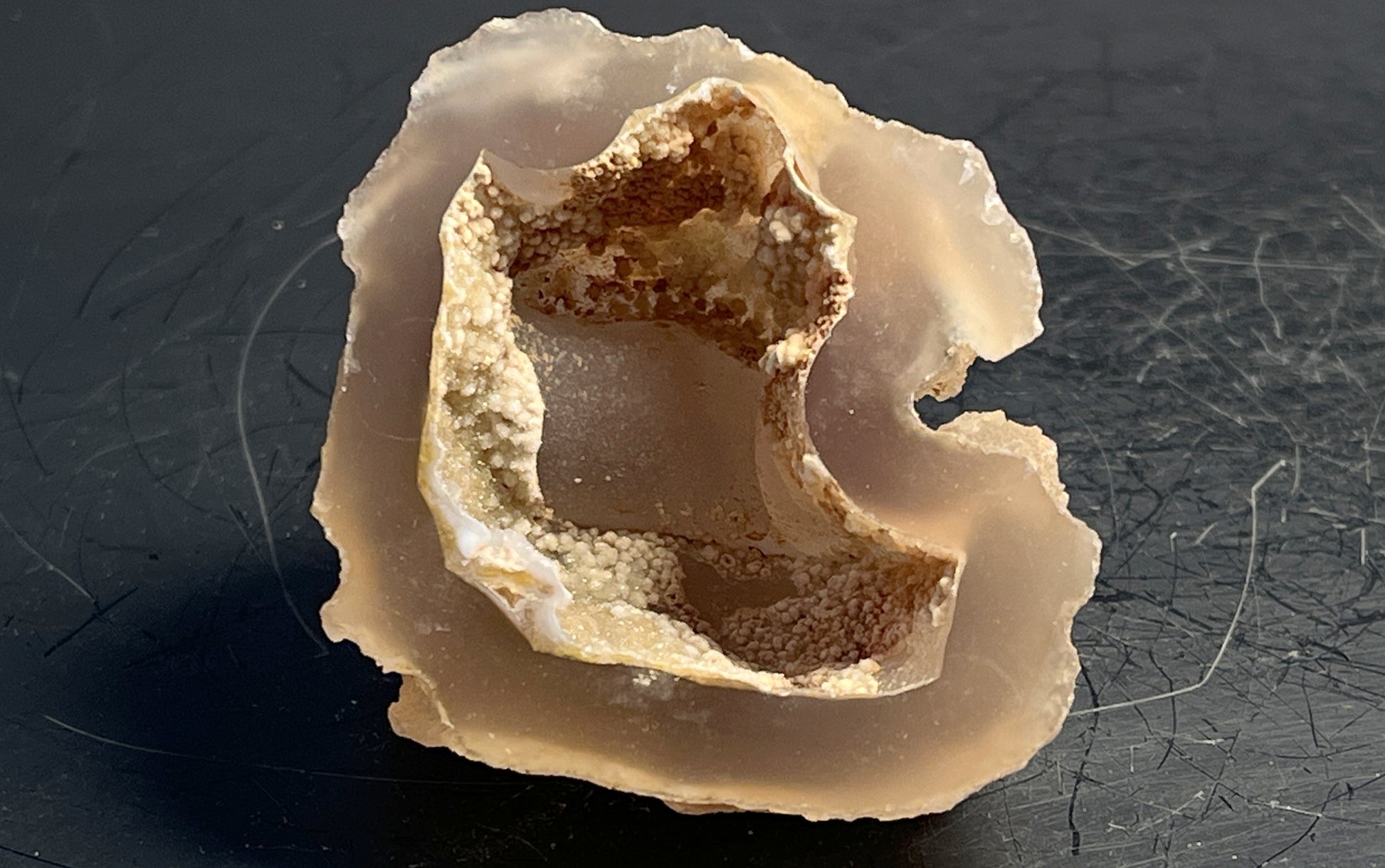 This Agate Geode Half 051 displays a remarkable mineralization within its pale, semi-translucent, bubbly outer surface. The unique interior features a few openings where other minerals have been able to seep in and form on top of the agate and chalcedony. Measuring 2.5" x 2" x 1.5" and weighing 3.43 ounces.