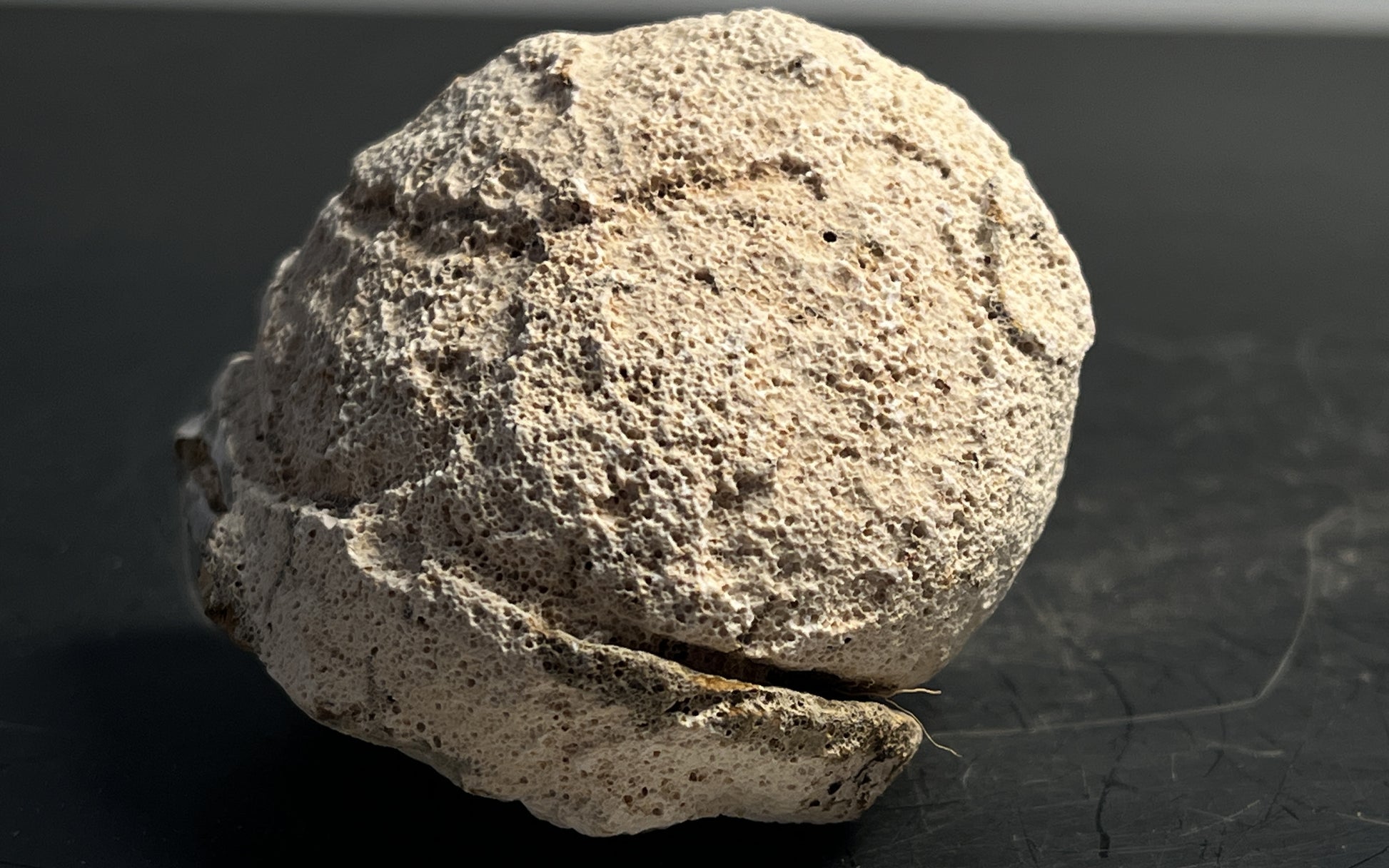 The outer crust of Agate Geode Half 054 is a chalky white, drawing attention to the dark agate that encases the quartz and chalcedony, dusted with a secondary mineralization. Measuring at 2.25" x 1.5" and weighing 3.11 ounces, this geode is a stunning and alluring addition to any collection.