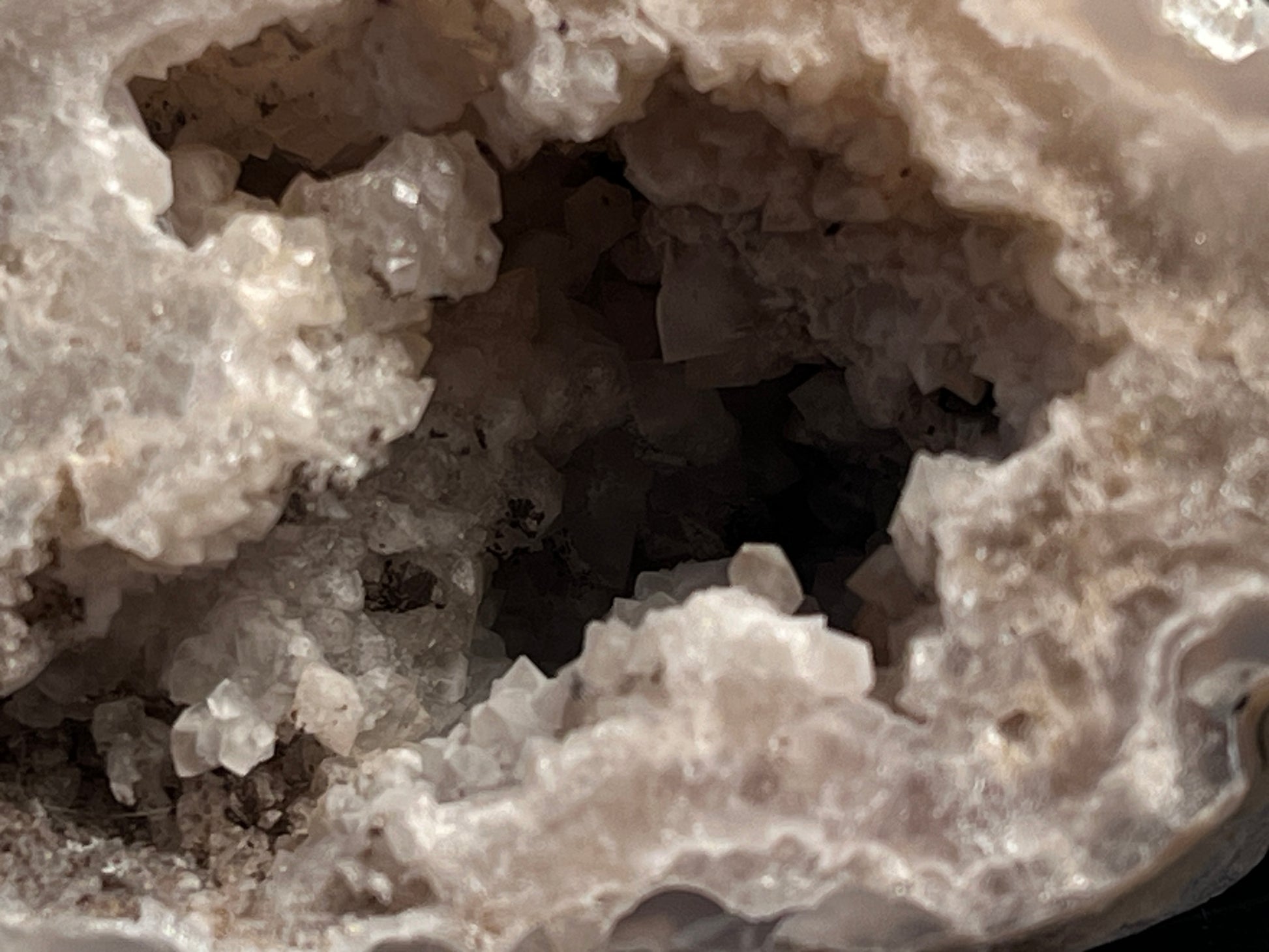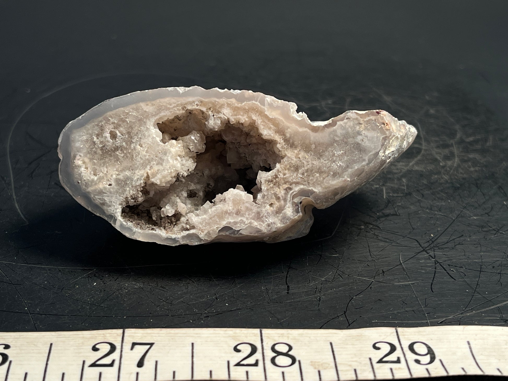 The Agate Geode Half 058 has an intriguing look, showcasing a blend of translucent and chalky white exteriors. Its interior consists of gorgeous agate in varying shades of gray and white, encompassing a cavity filled with chalcedony and quartz, and topped with a second layer of mineralization. This Brazilian agate specimen measures 3 inches in length and 1 inch in width, weighing a total of 3.03 ounces.