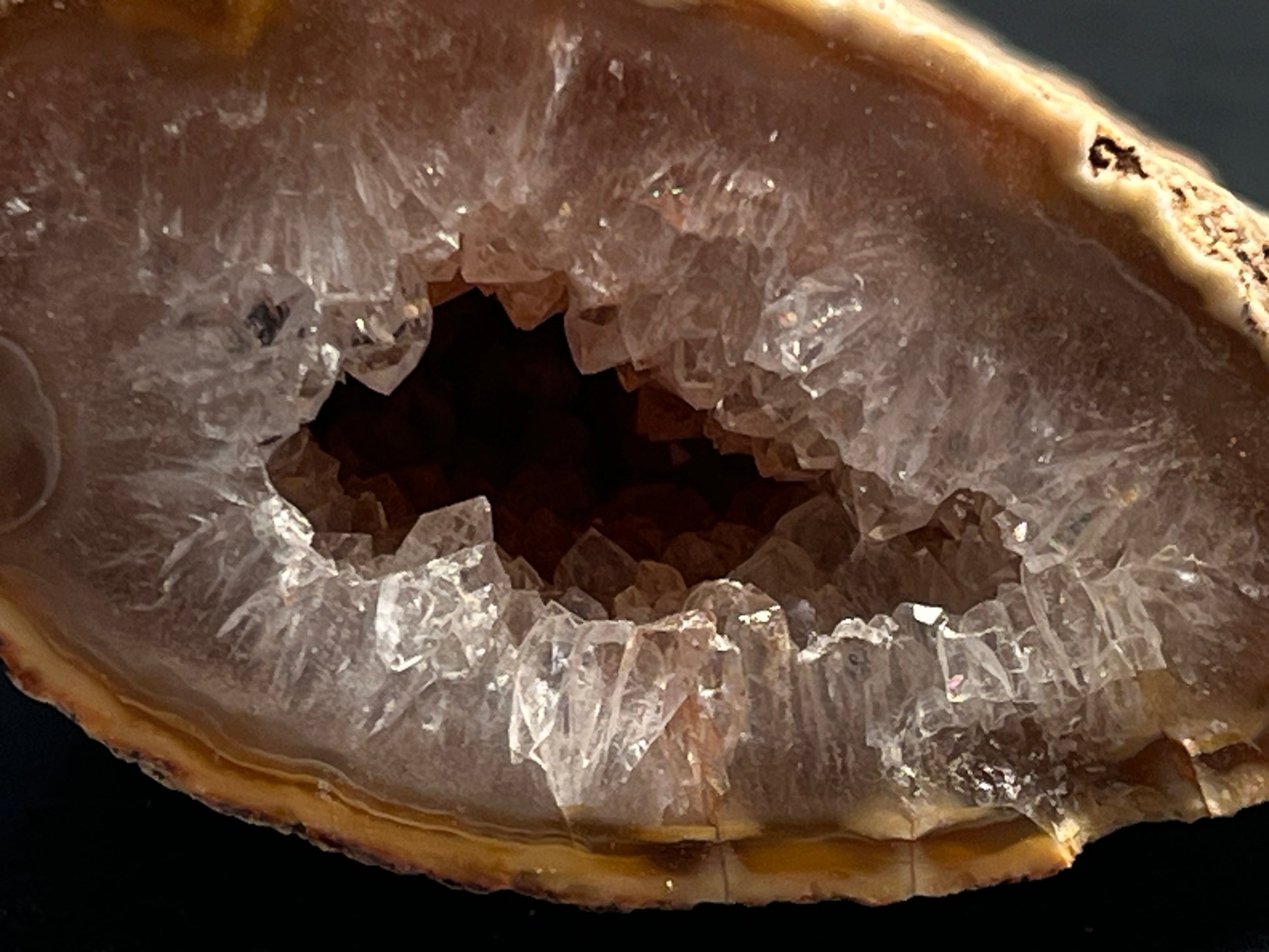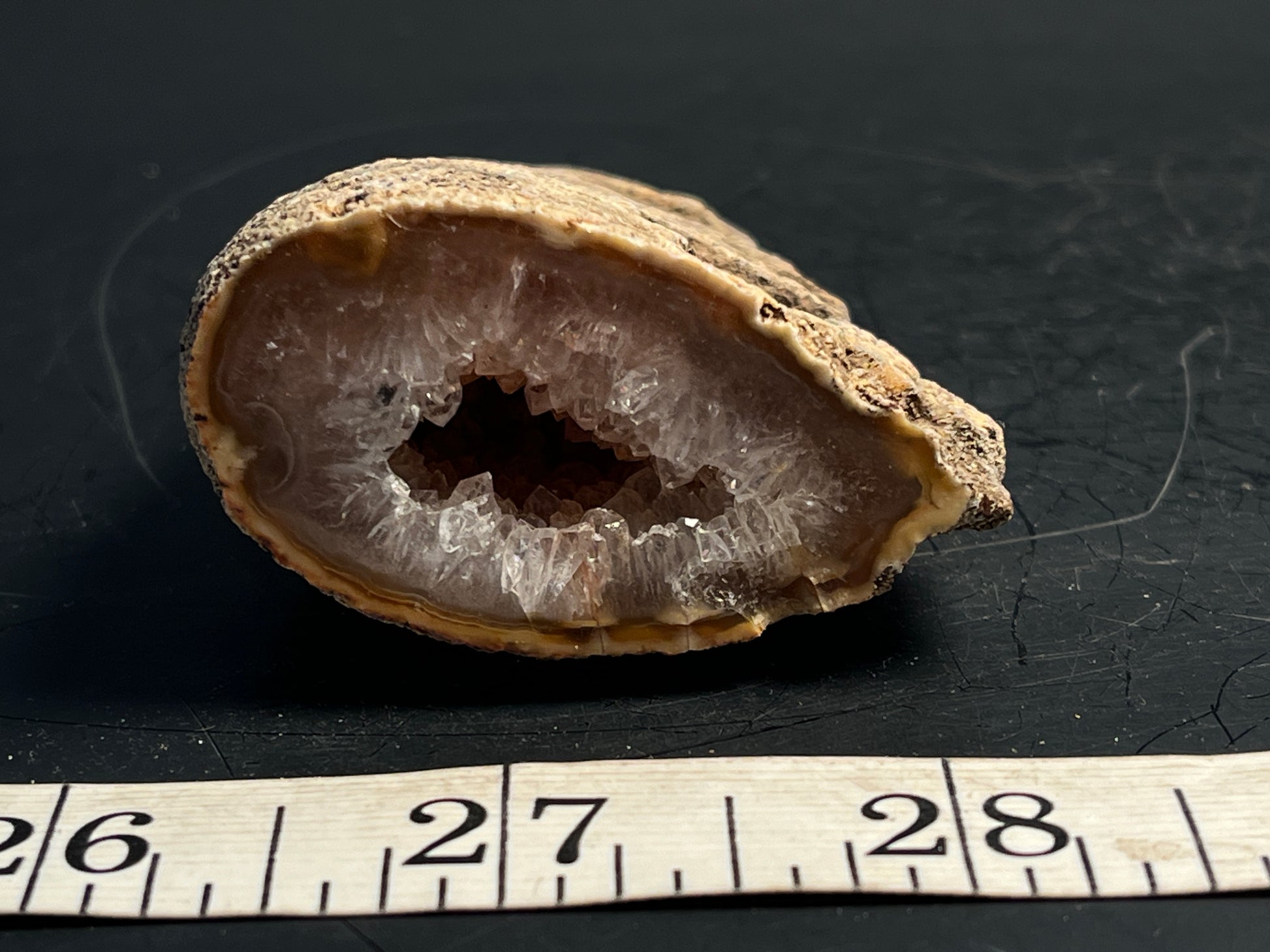 This striking specimen, Agate Geode Half 067, boasts a textured outer crust that exposes a quartz point-studded cavity enveloped by a light agate. Measuring 2" x 1" x 2.5" and weighing in at 3.20 ounces, this remarkable piece is a must-have for any collection.