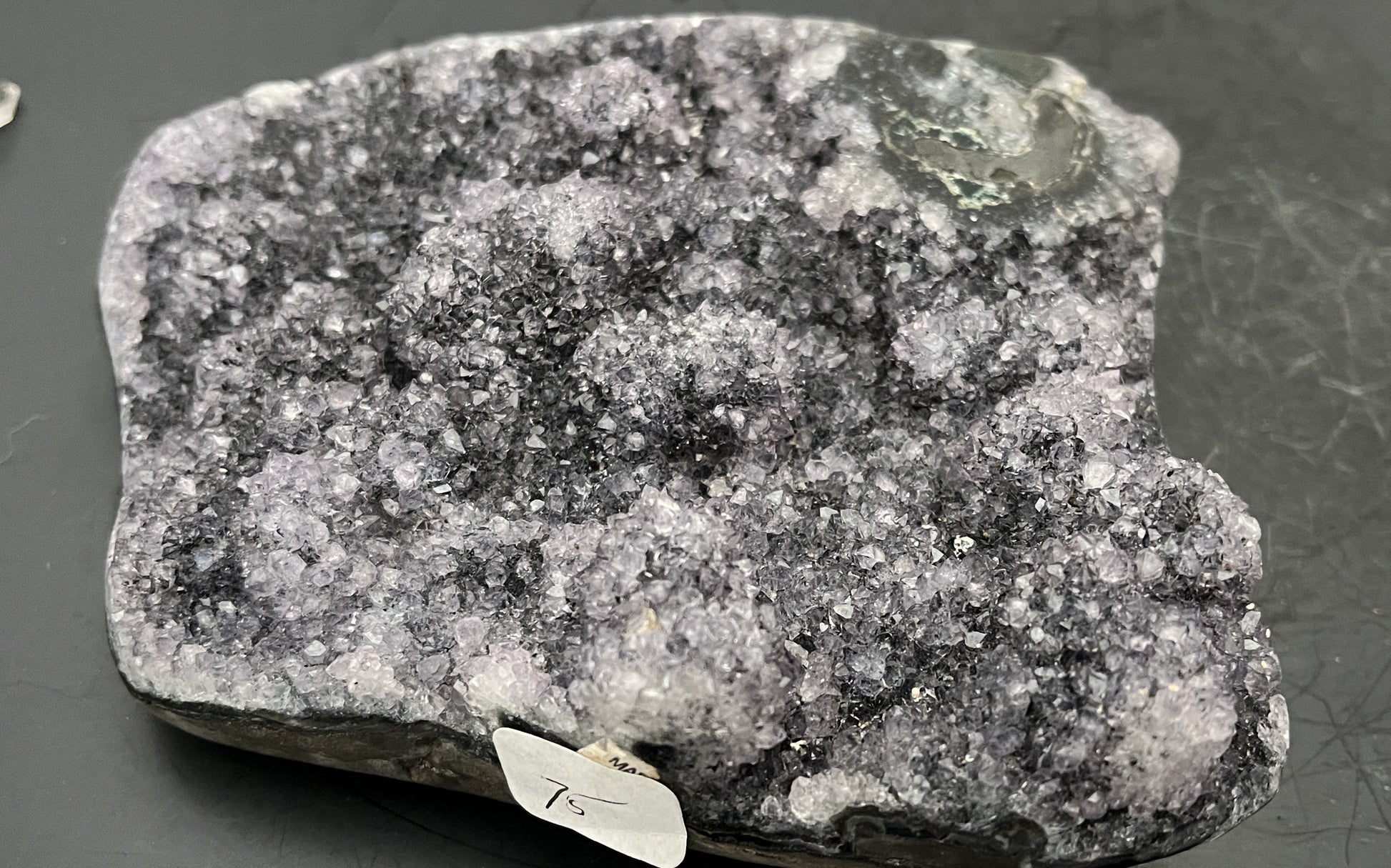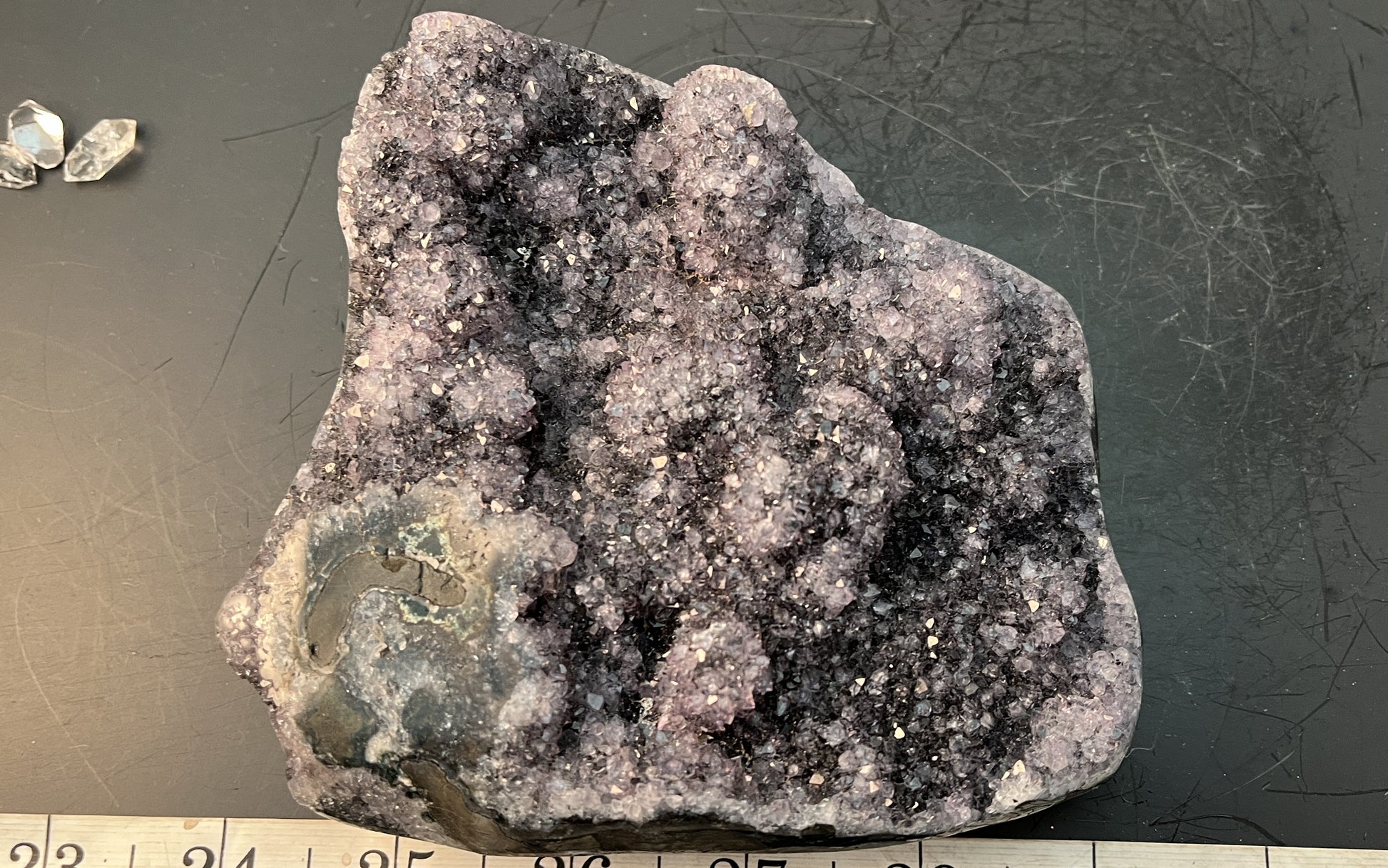 This amethyst, featuring sparkling crystals and a partially polished matrix, showcases a beautiful "flower" formation on one corner. Its natural hills and valleys create a shifting effect in the light, giving the gemstone a unique appearance. With a base hardness of 7 out of 10, this durable yet vibrant gem is a perfect addition to any collection. It weighs 1.58 lbs and measures 5.5".
