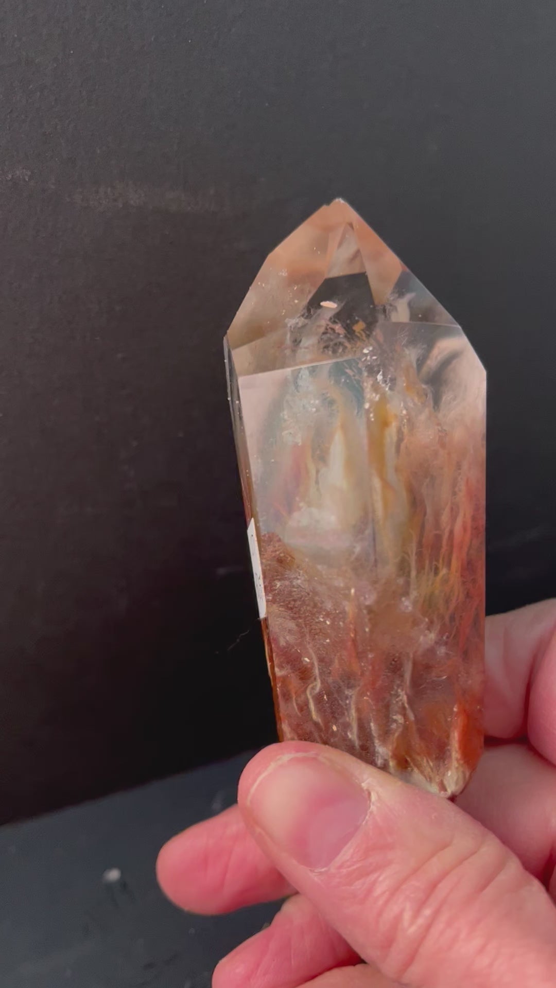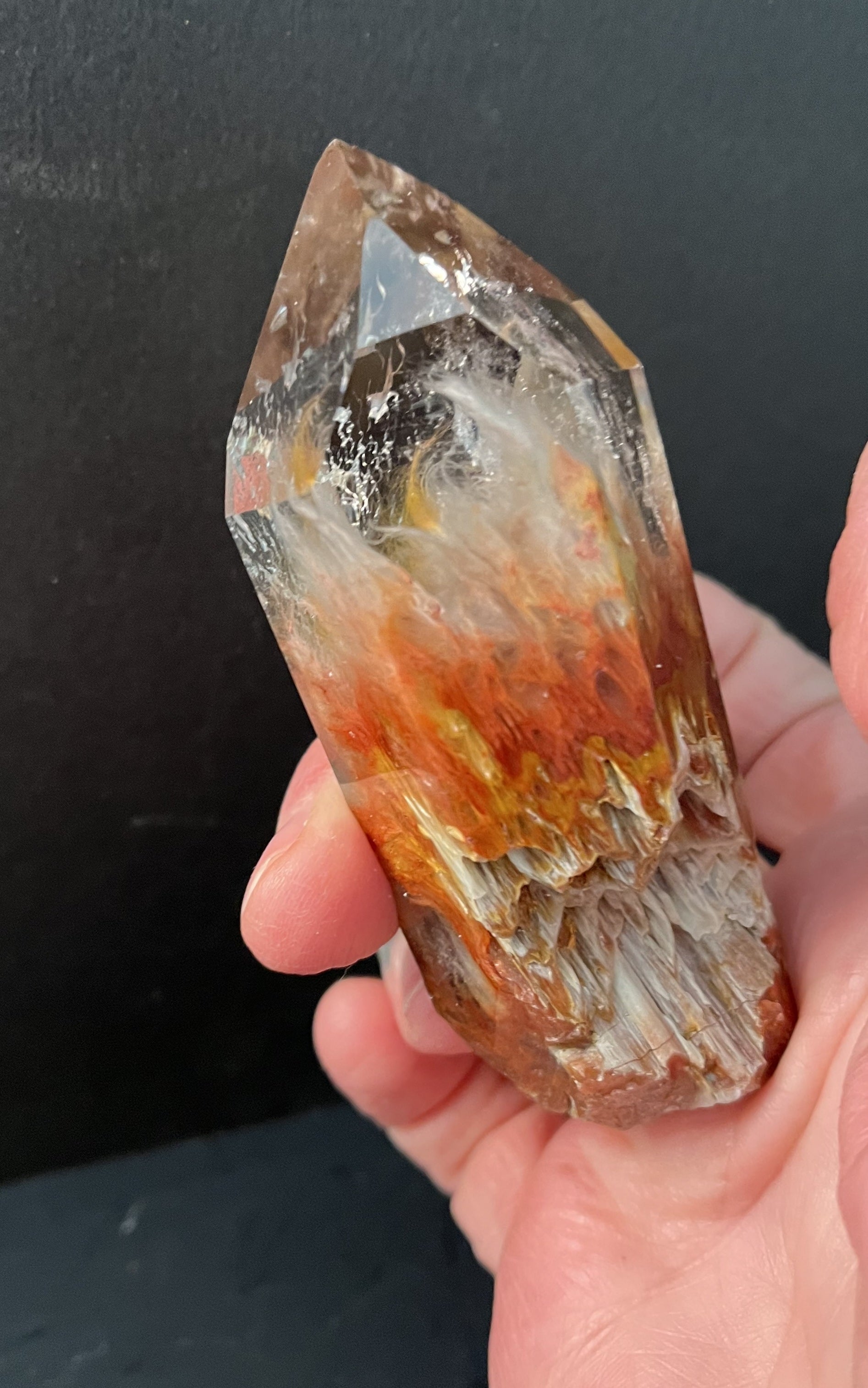This is a very dramatic specimen with wisps of red, white, and clear ice like formations. The bottom of the piece is rough so you can actually see and feel what is going on inside. Beautiful water clear tip. It measures 3.5" and weighs 4.43 oz.