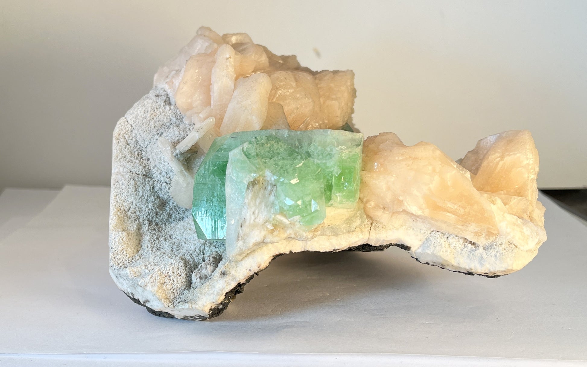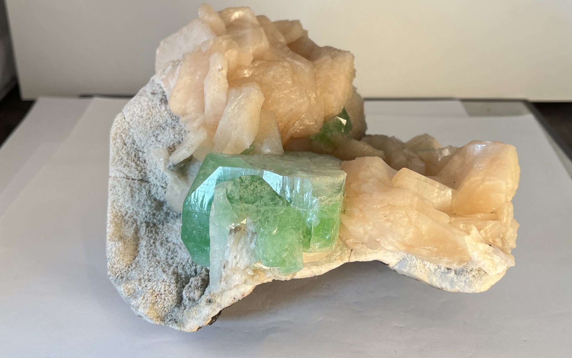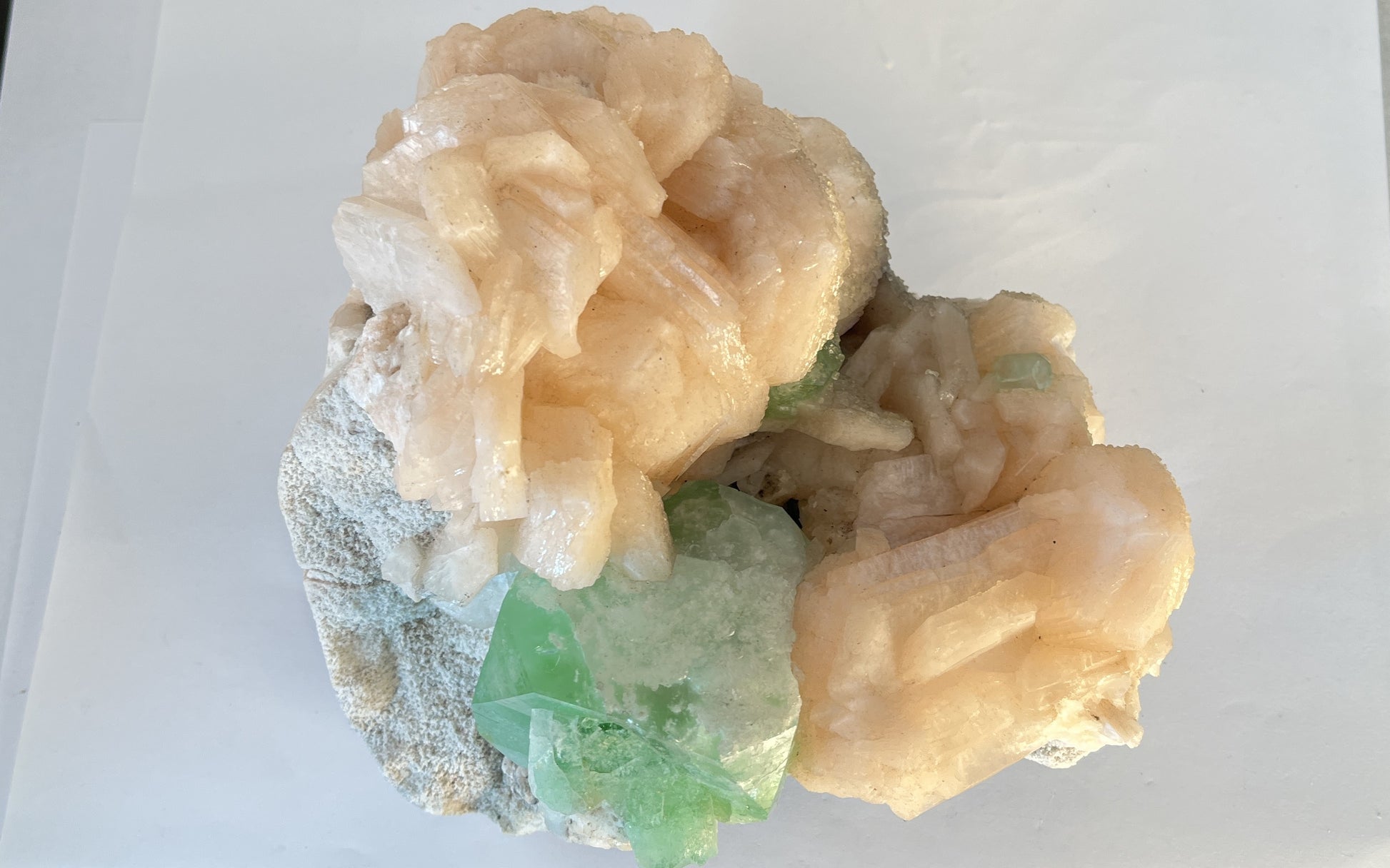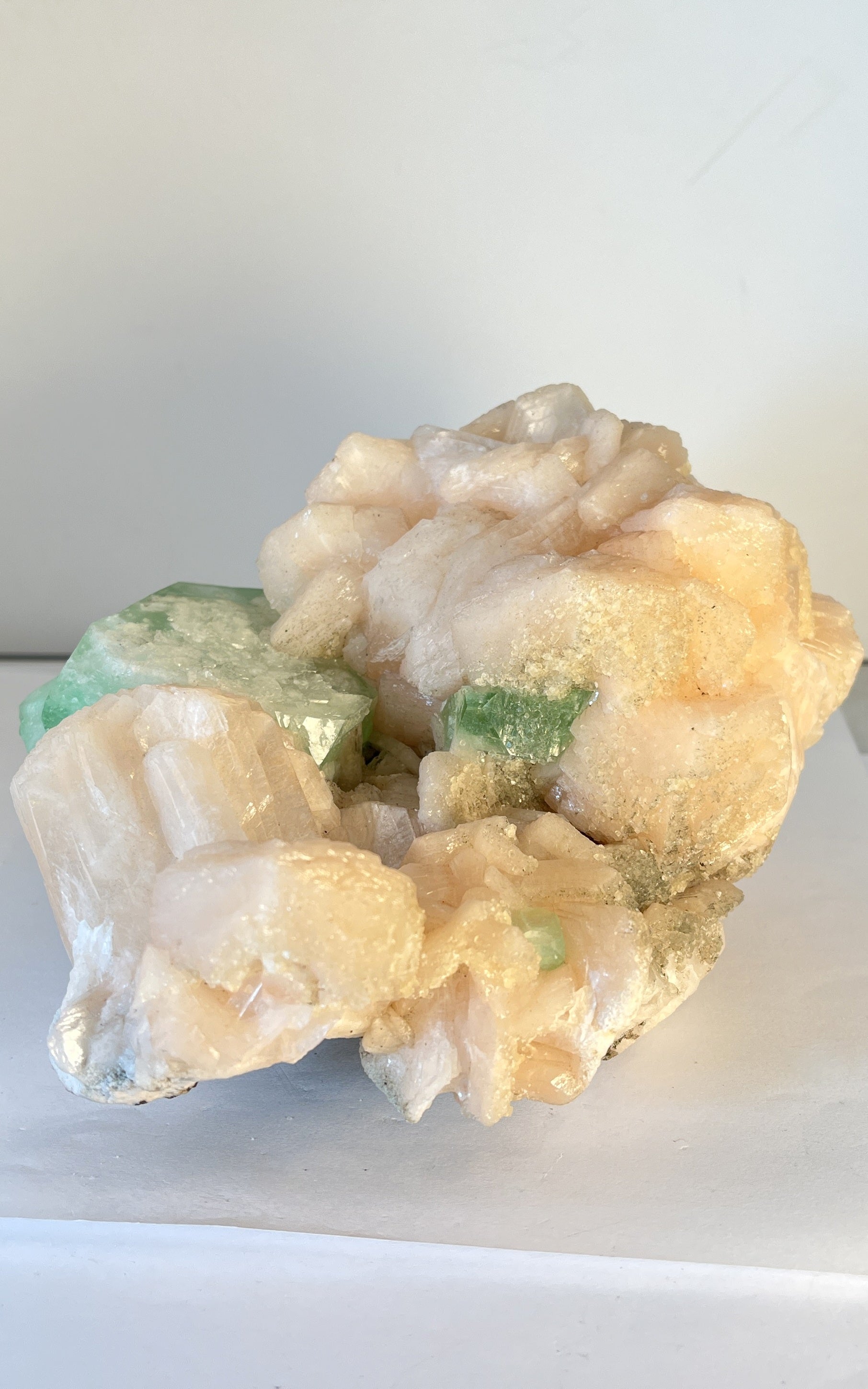 This stunning piece of natural beauty features magnificently large, well-formed stilbite crystals with a large deep green apophyllite and multiple smaller ones. Perfect for the collector who appreciates natural geometry, these apophyllite crystals represent an optimal example of the mineral's crystallizing habits. 3.5 lbs, 6" x 4"