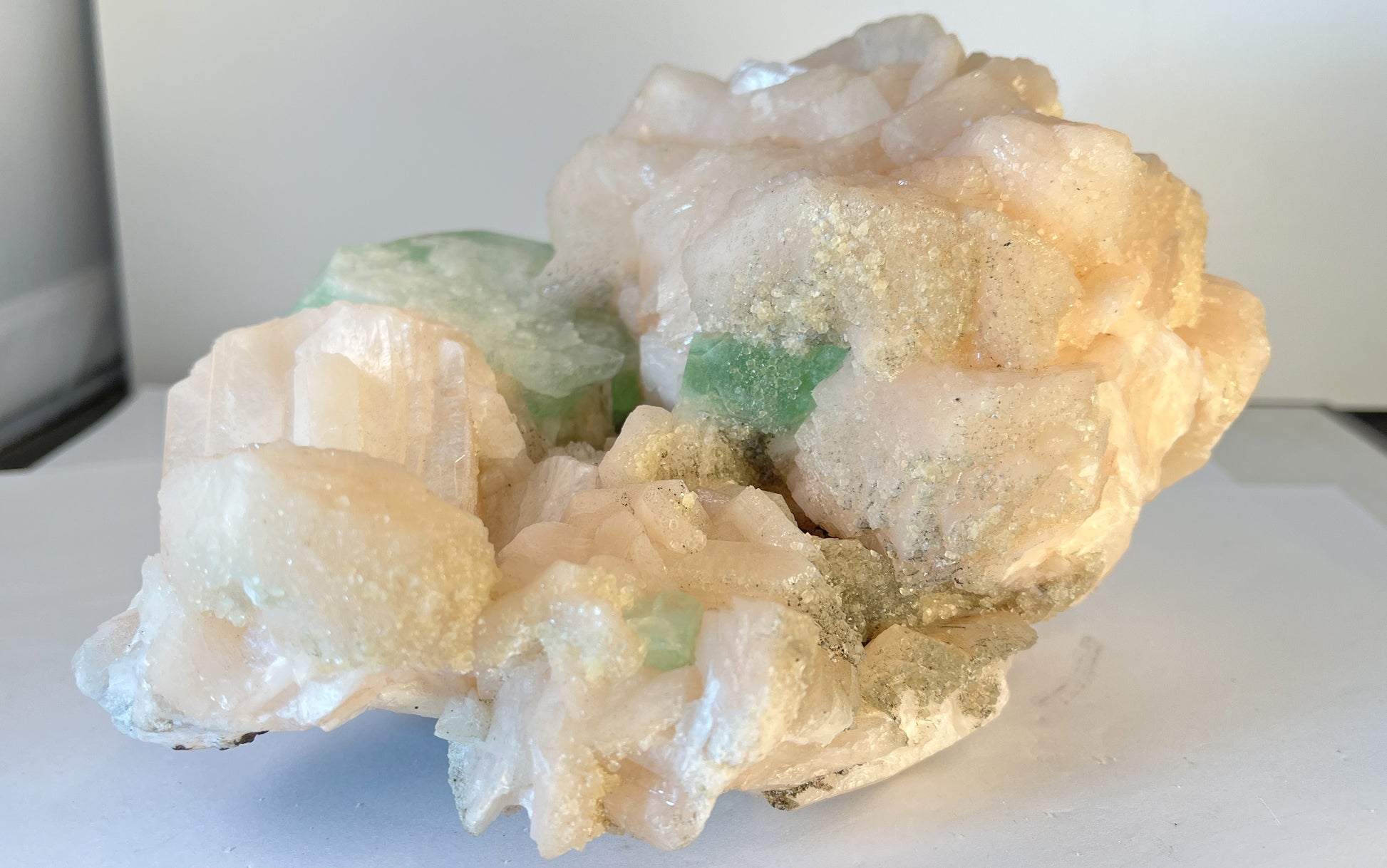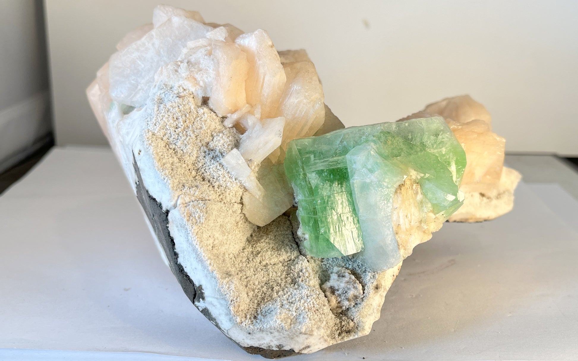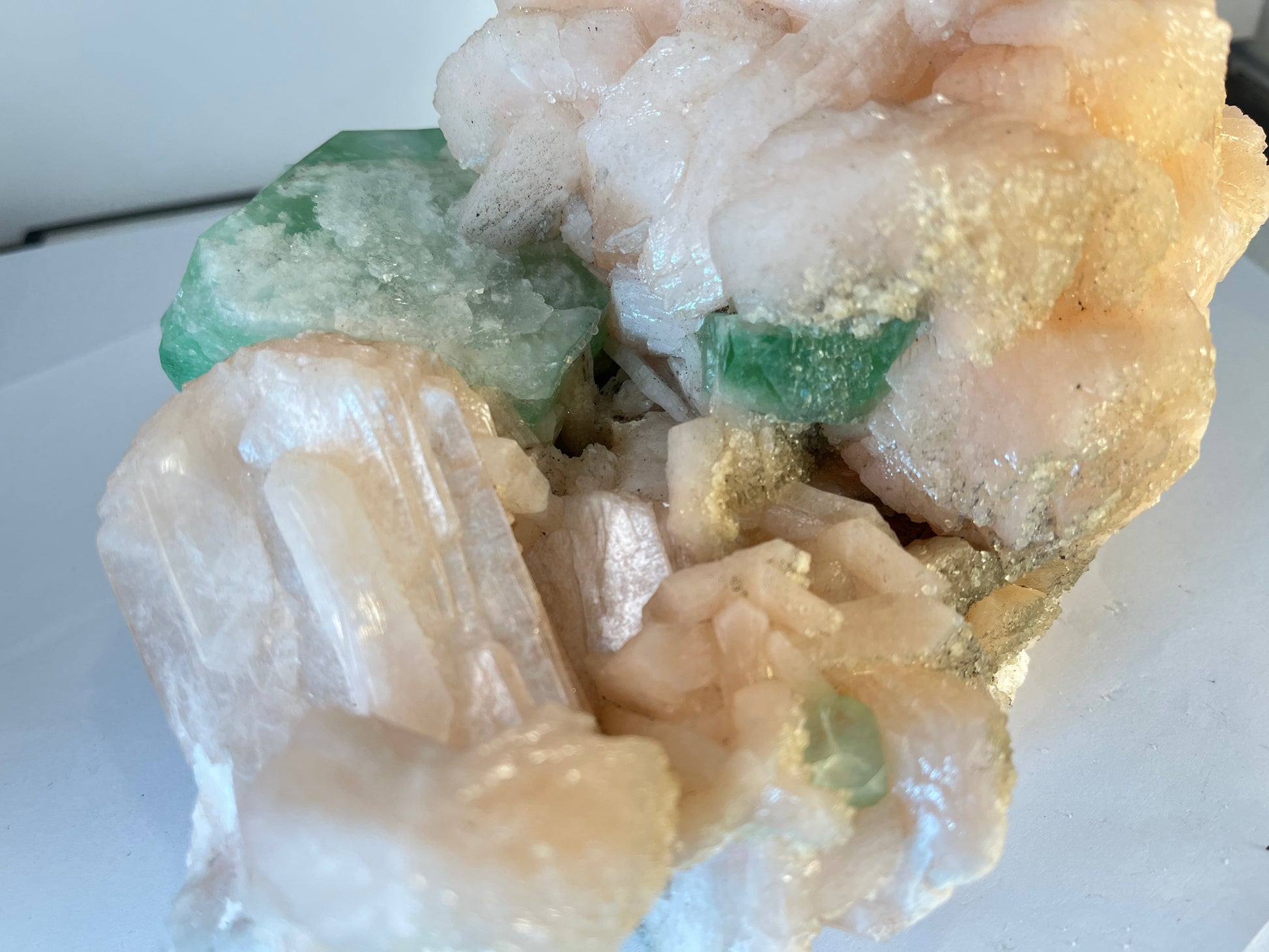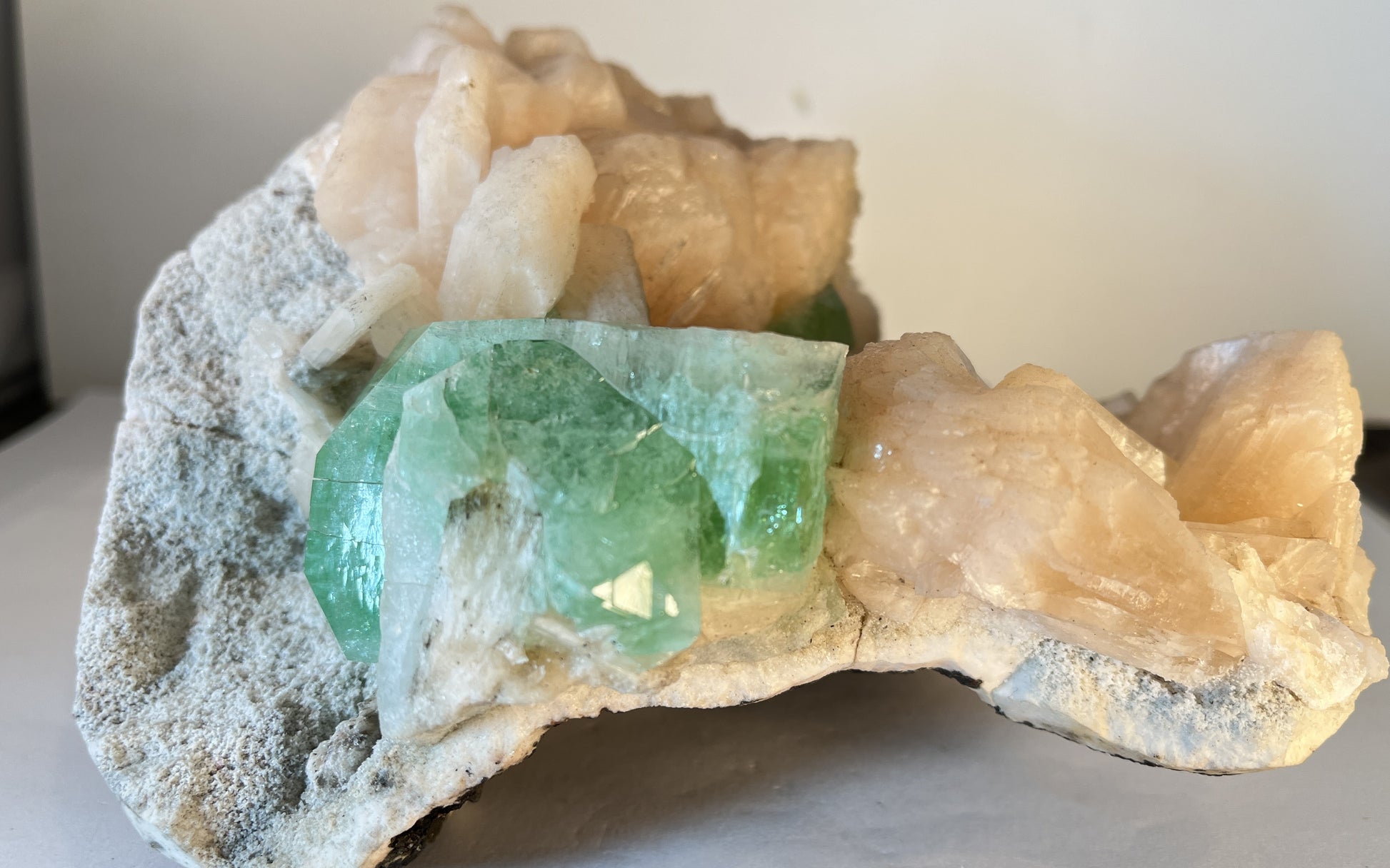 This stunning piece of natural beauty features magnificently large, well-formed stilbite crystals with a large deep green apophyllite and multiple smaller ones. Perfect for the collector who appreciates natural geometry, these apophyllite crystals represent an optimal example of the mineral's crystallizing habits. 3.5 lbs, 6" x 4"