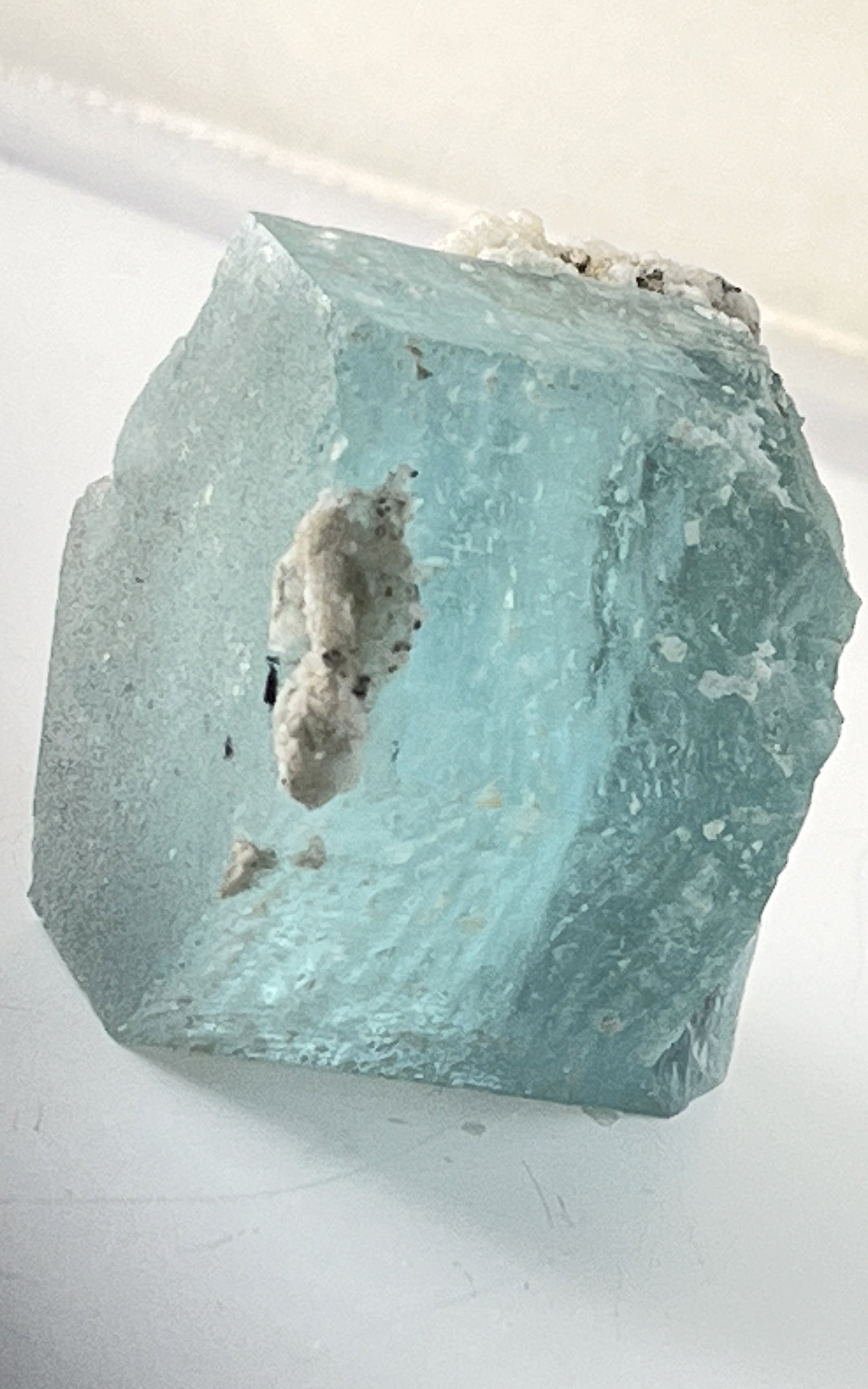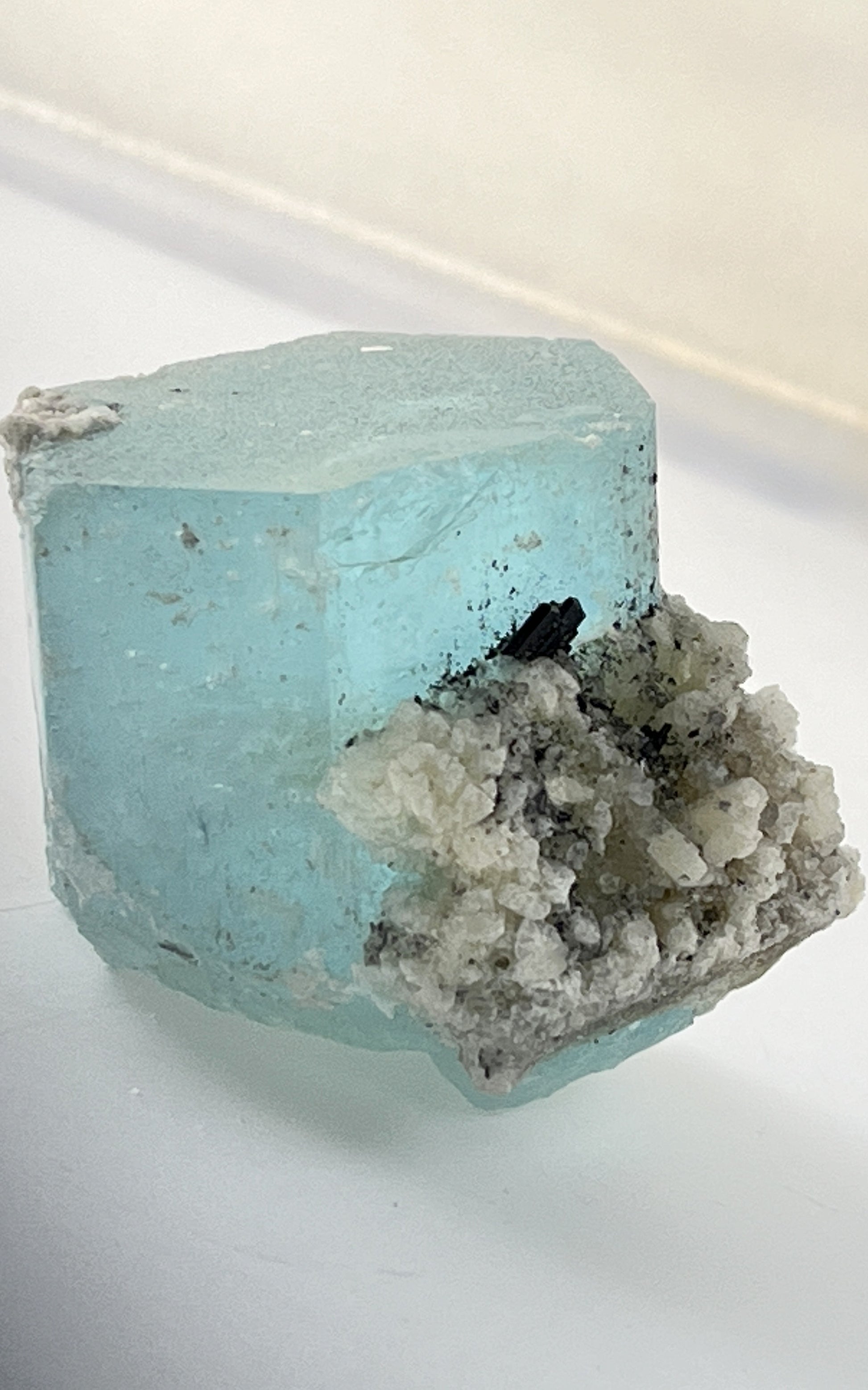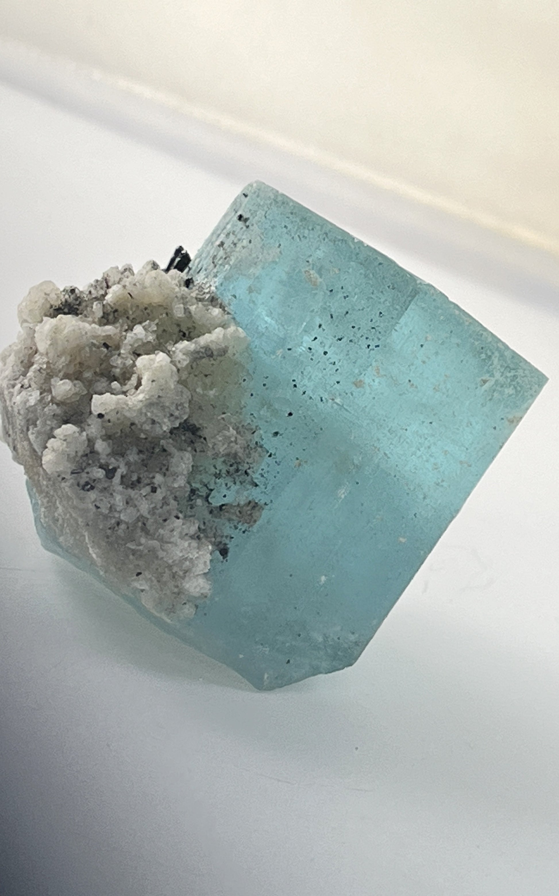 This large, richly colored aquamarine crystal is studded with sparkly feldspar and miniature, delicate black tourmaline/schorl crystals. It sports a fully terminated base and what appears to be broken on the other end.