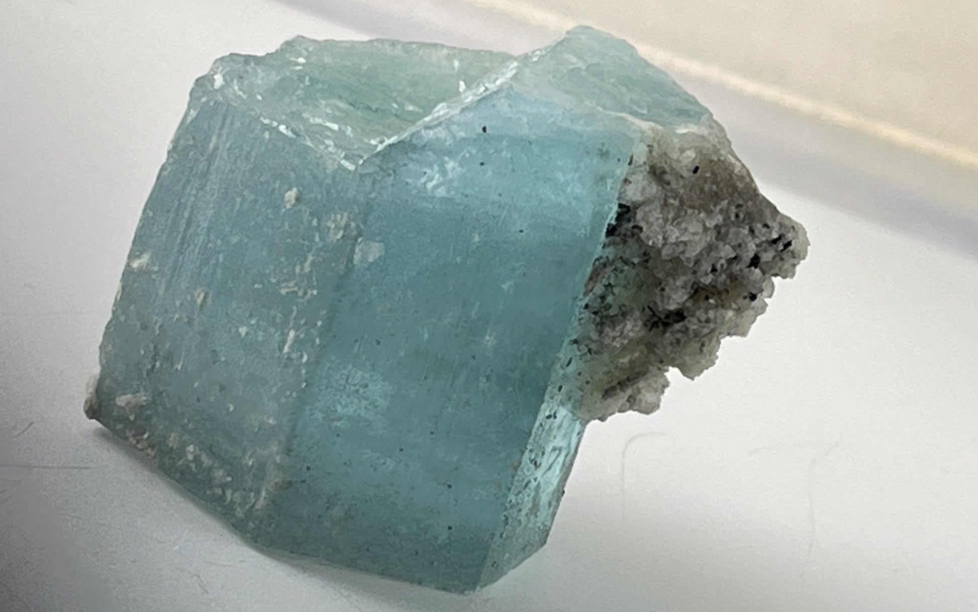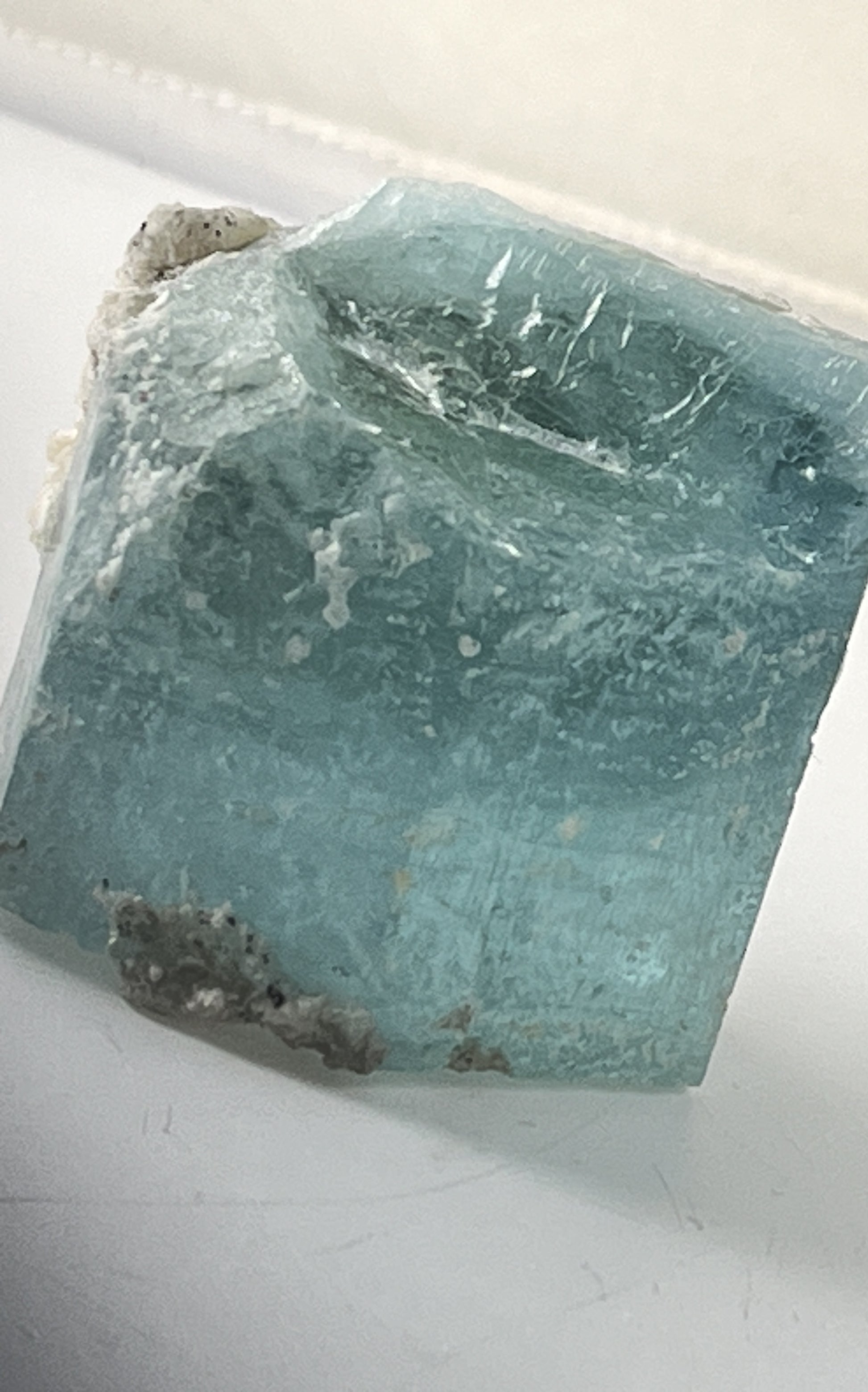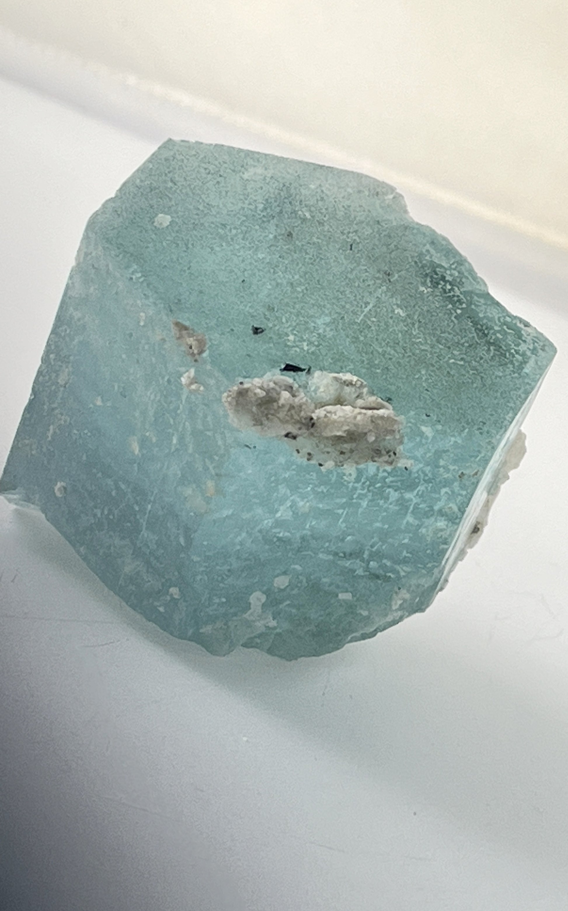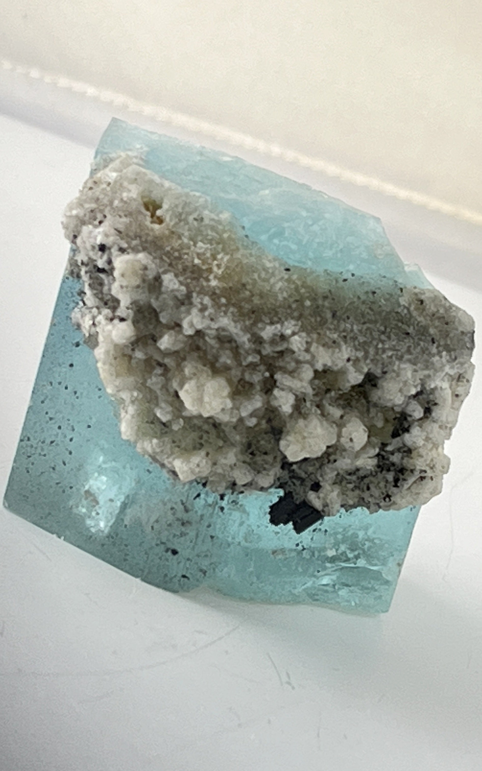This large, richly colored aquamarine crystal is studded with sparkly feldspar and miniature, delicate black tourmaline/schorl crystals. It sports a fully terminated base and what appears to be broken on the other end.