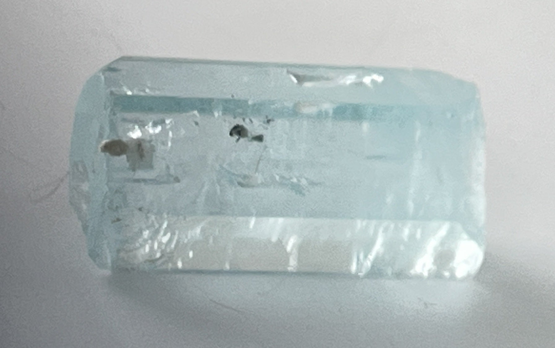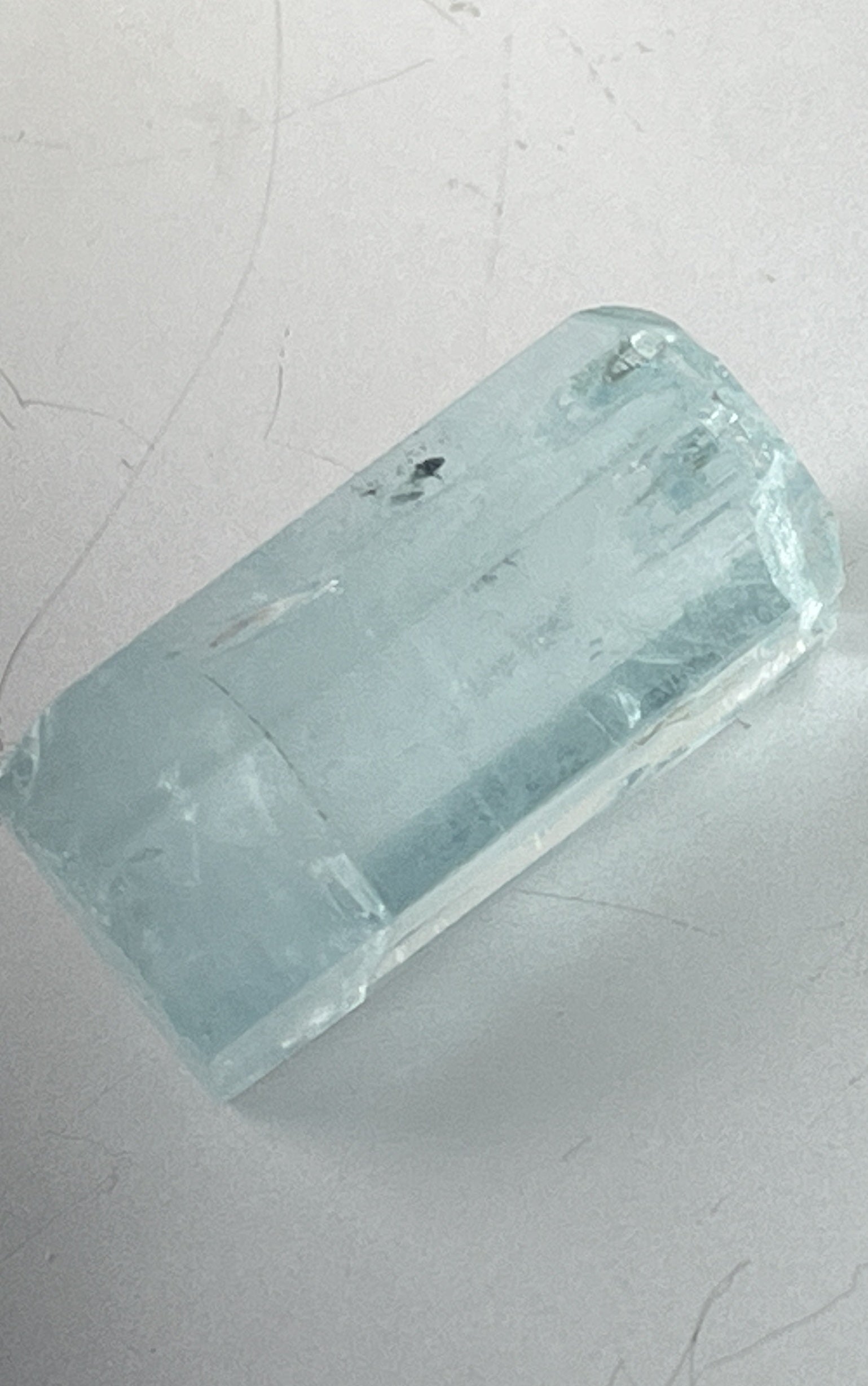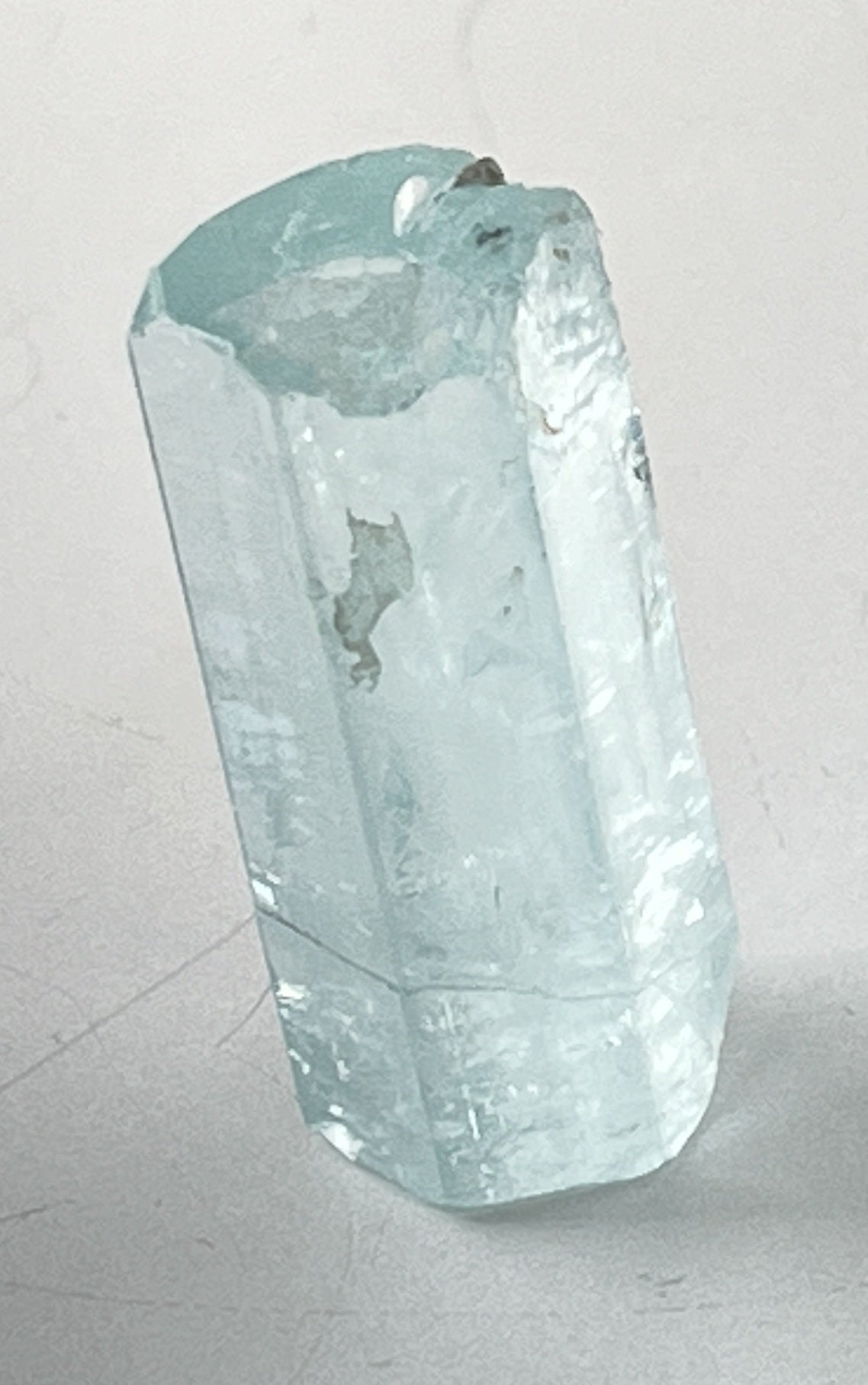 A single aquamarine crystal, almost double terminated. What the heck is almost terminated? One end has an imperfection in one spot. It isn't clear if this is a "blowout" or damage from another, external source.