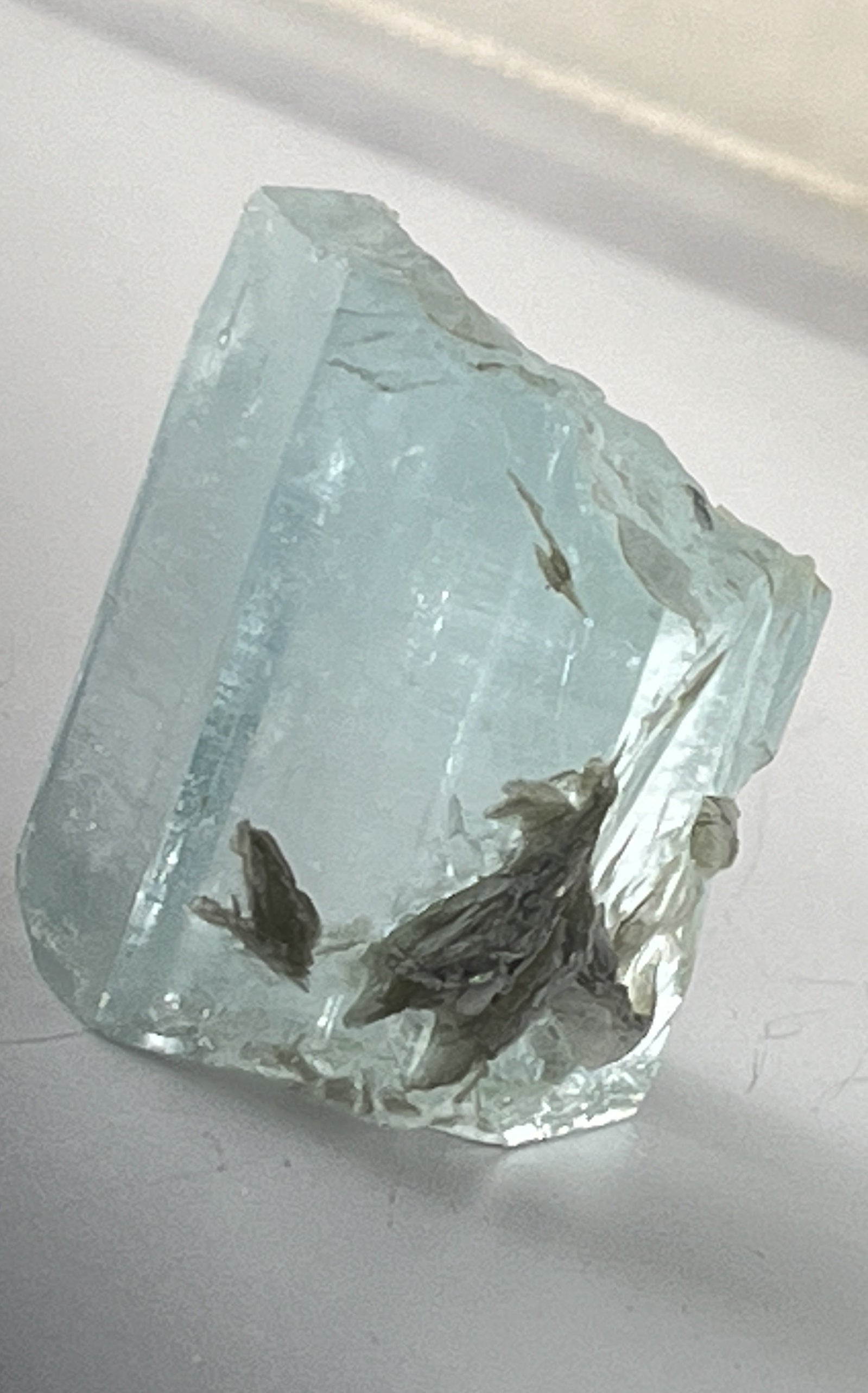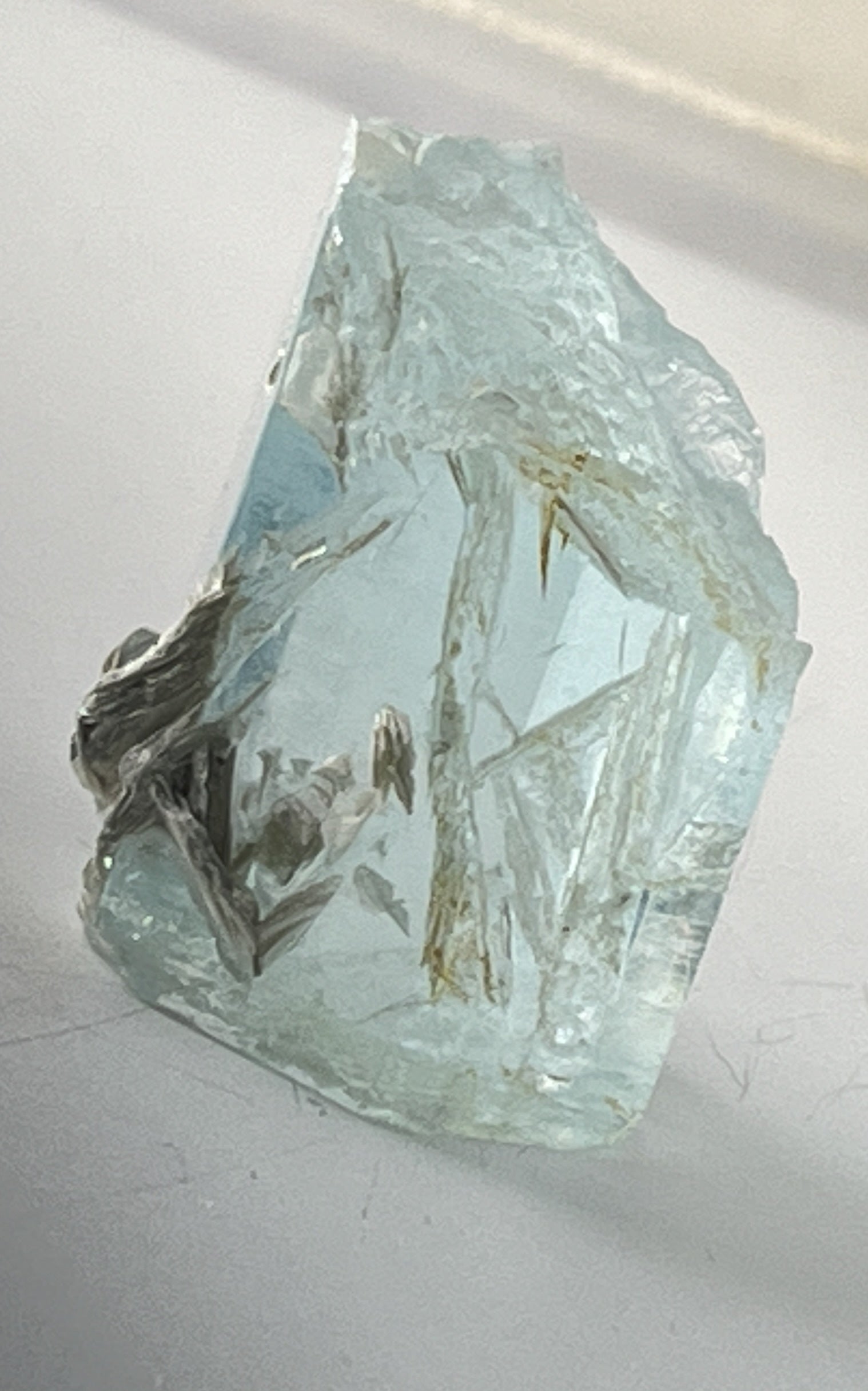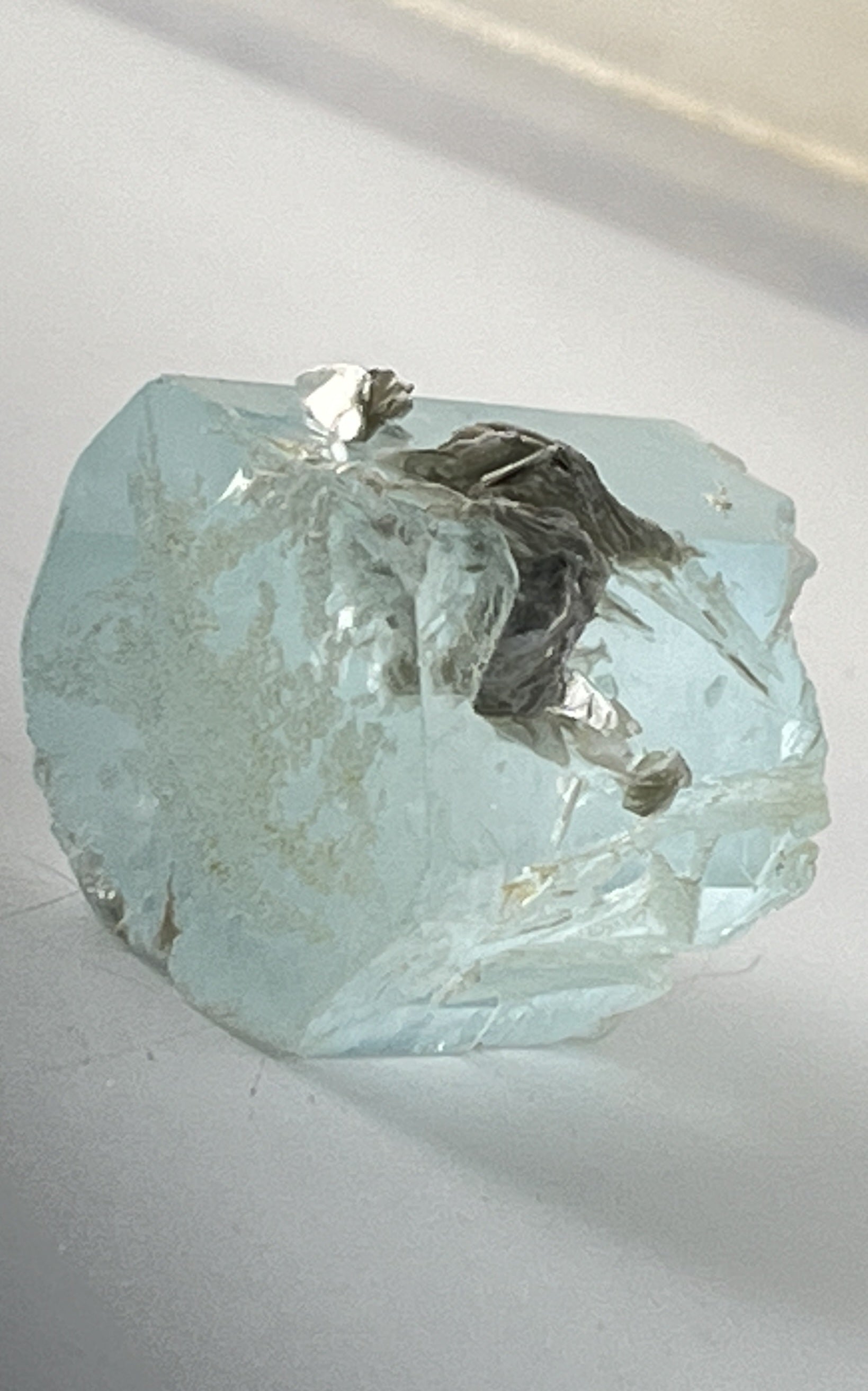 The delicate pale blue aquamarine is highlighted with wisps of silvery muscovite. Weighs 2.21 oz, the crystal is 1.5" at its tallest, with one terminated end.