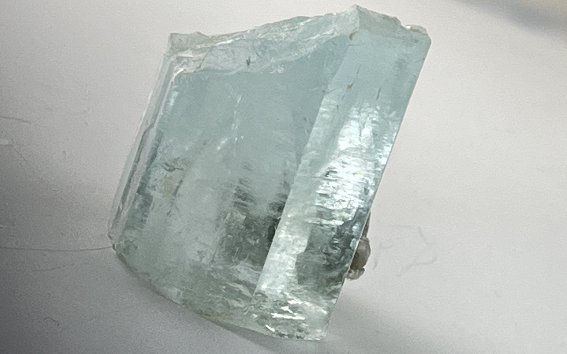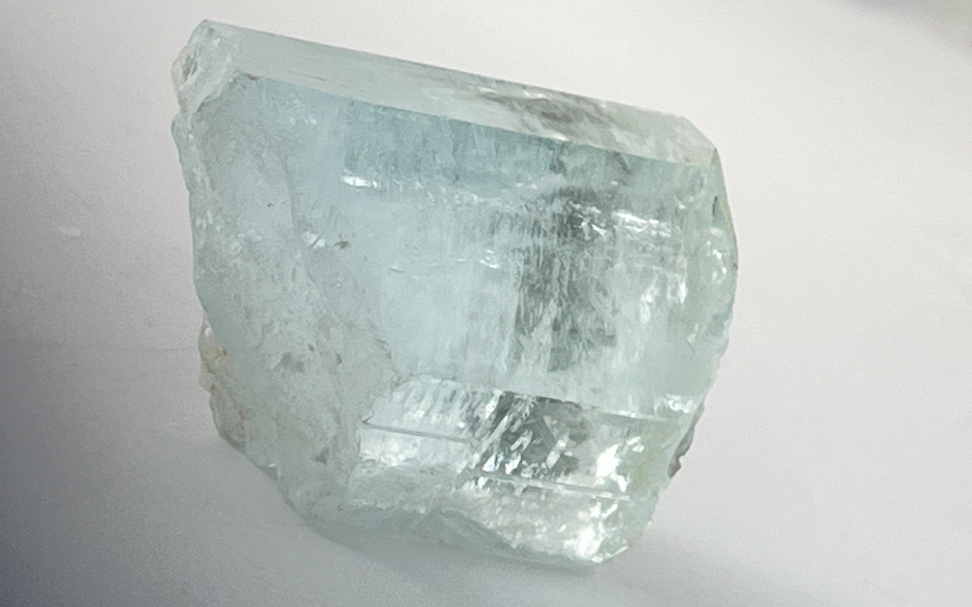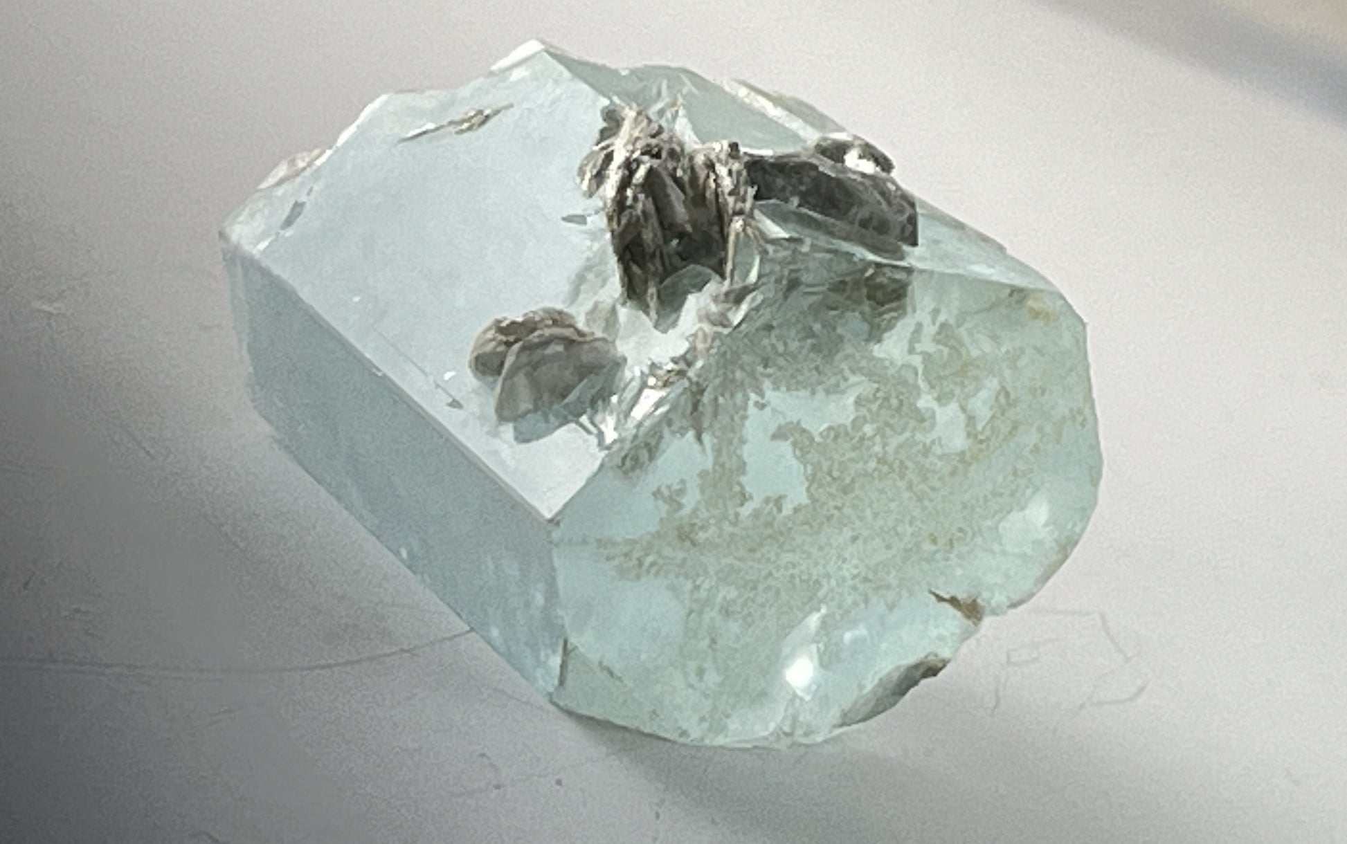 The delicate pale blue aquamarine is highlighted with wisps of silvery muscovite. Weighs 2.21 oz, the crystal is 1.5" at its tallest, with one terminated end.