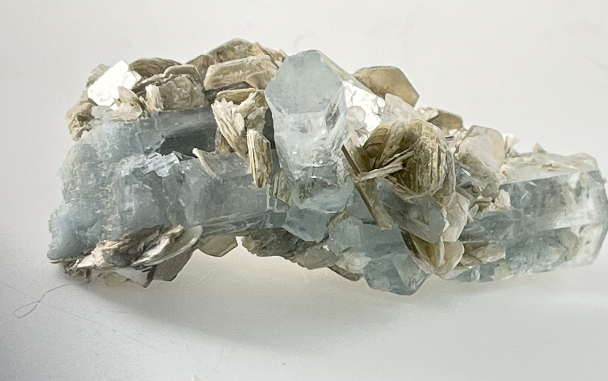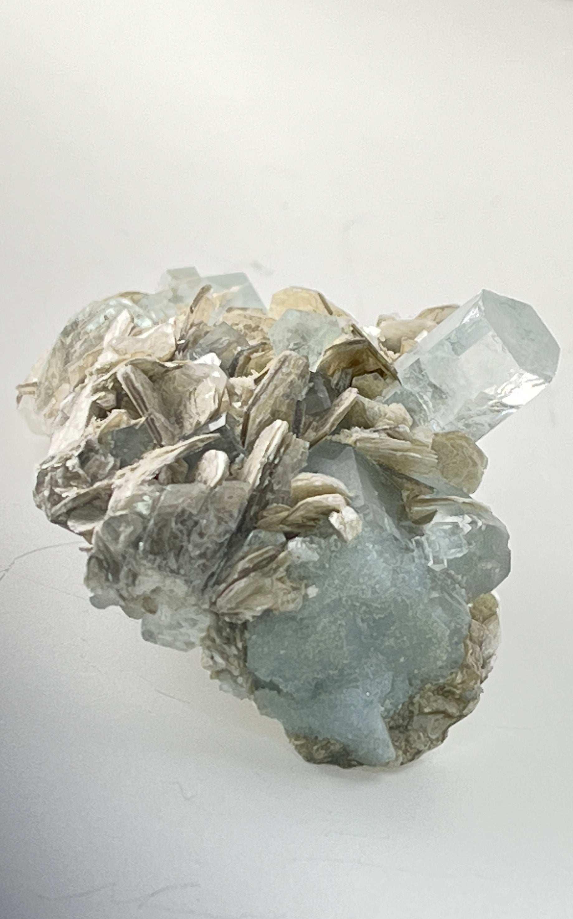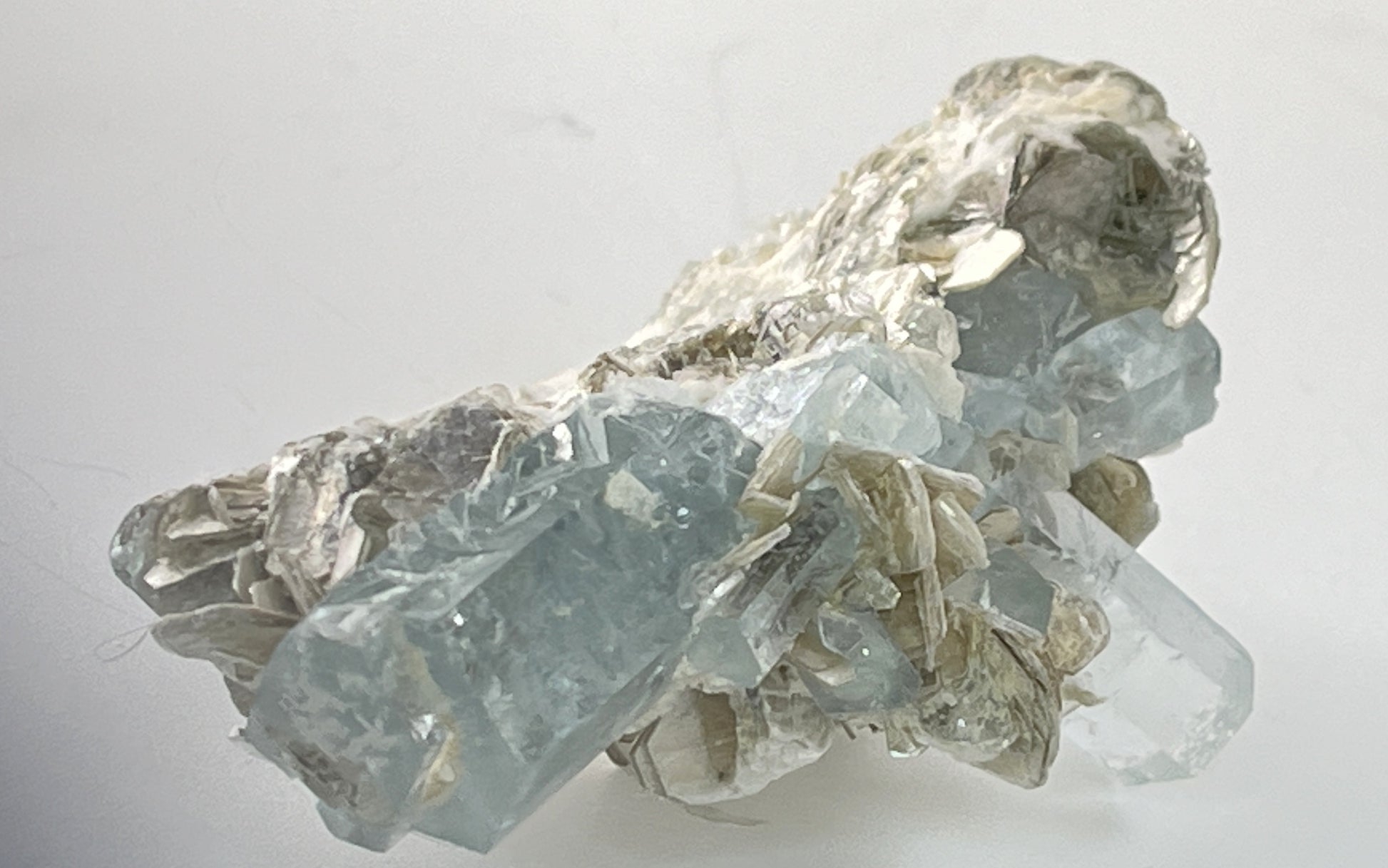 A magnificent cluster of aquamarine crystals intersecting with muscovite crystals on a feldspar matrix. The blue of the many, fully terminated aquamarine crystals is a striking, but delicate contrast with the silvery sheen of the muscovite.