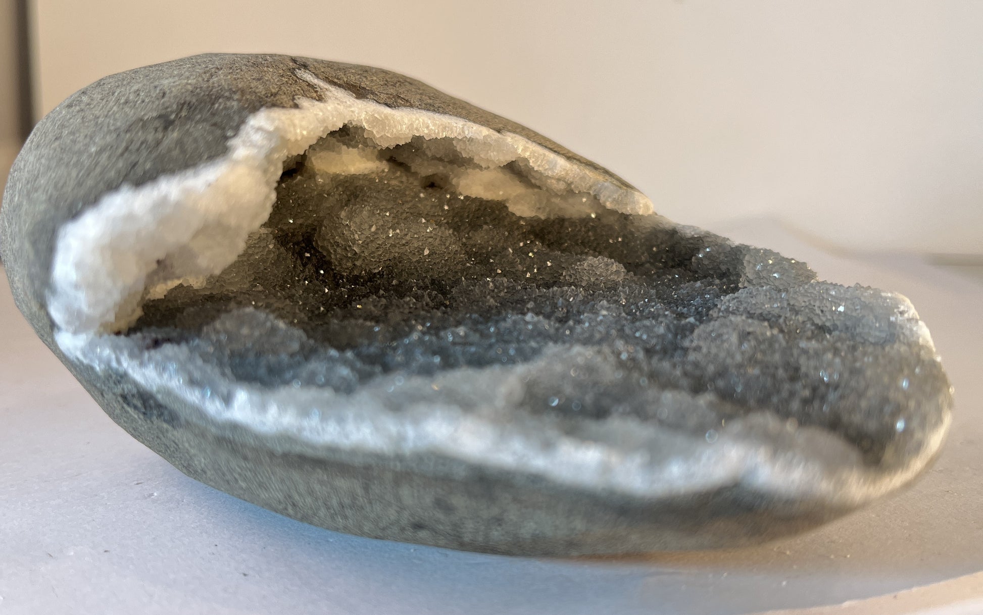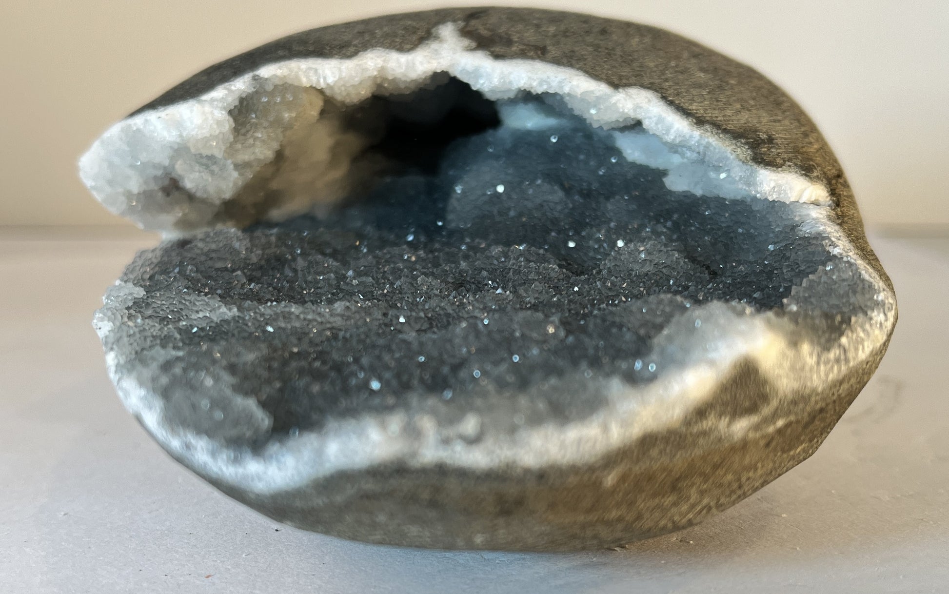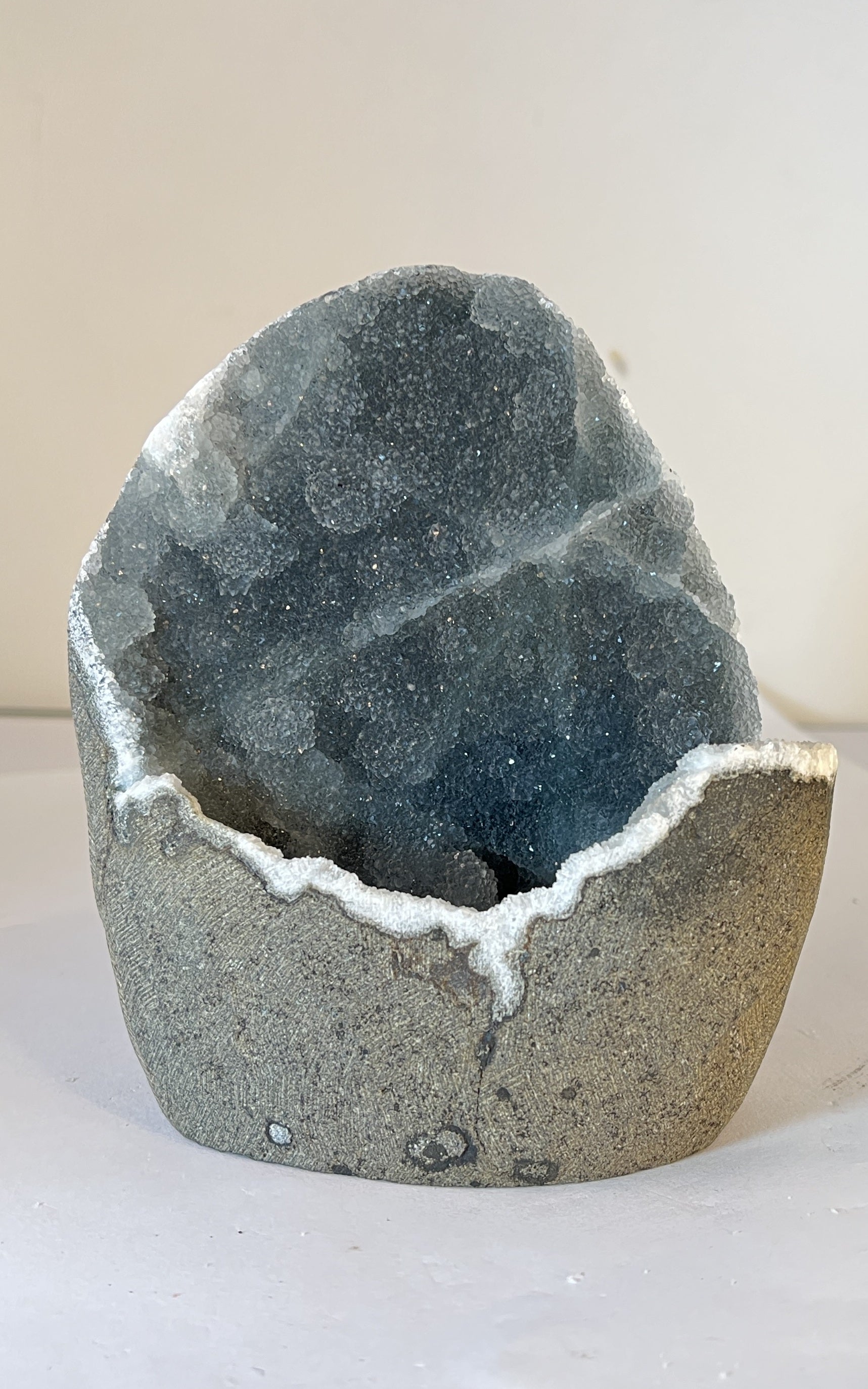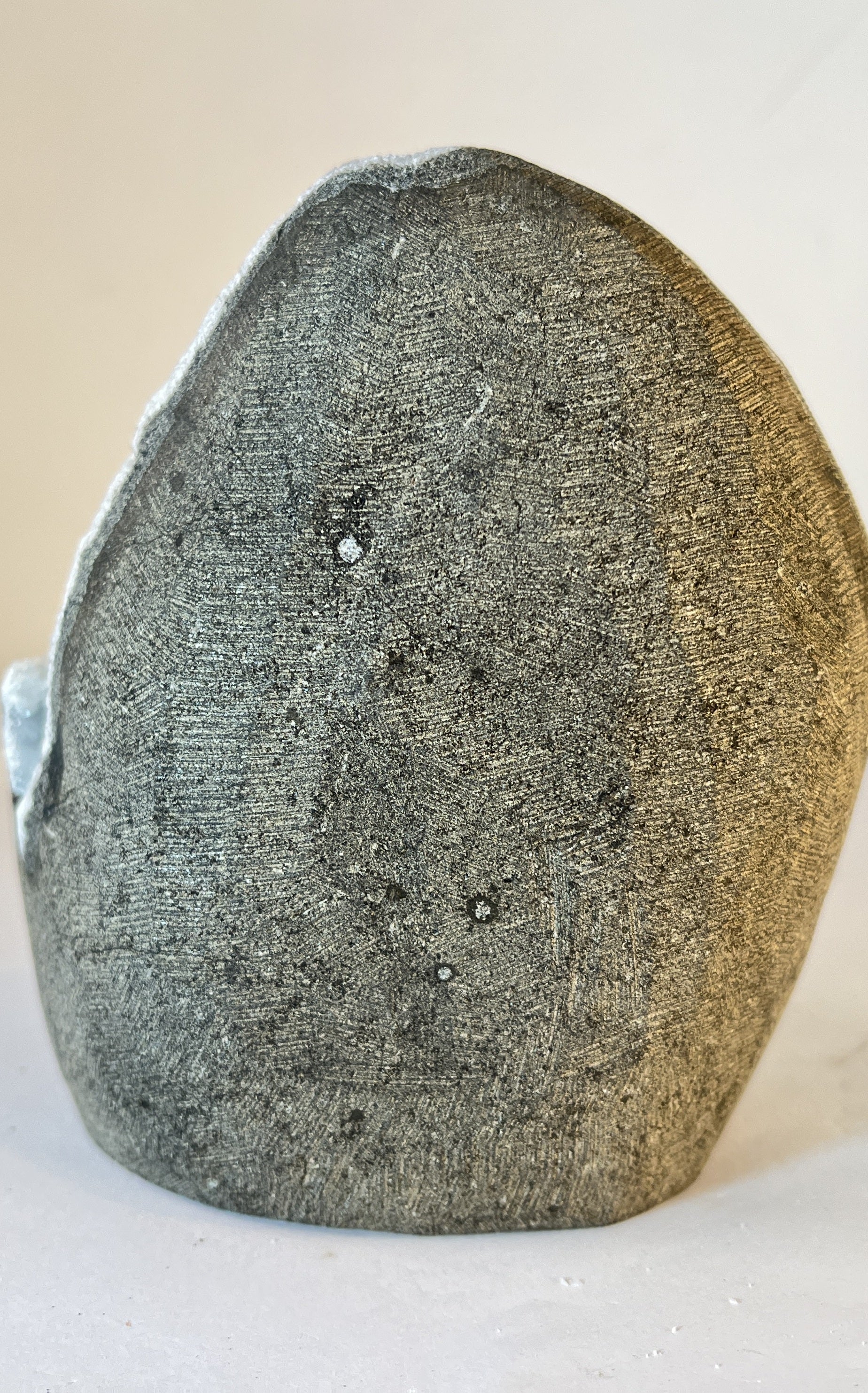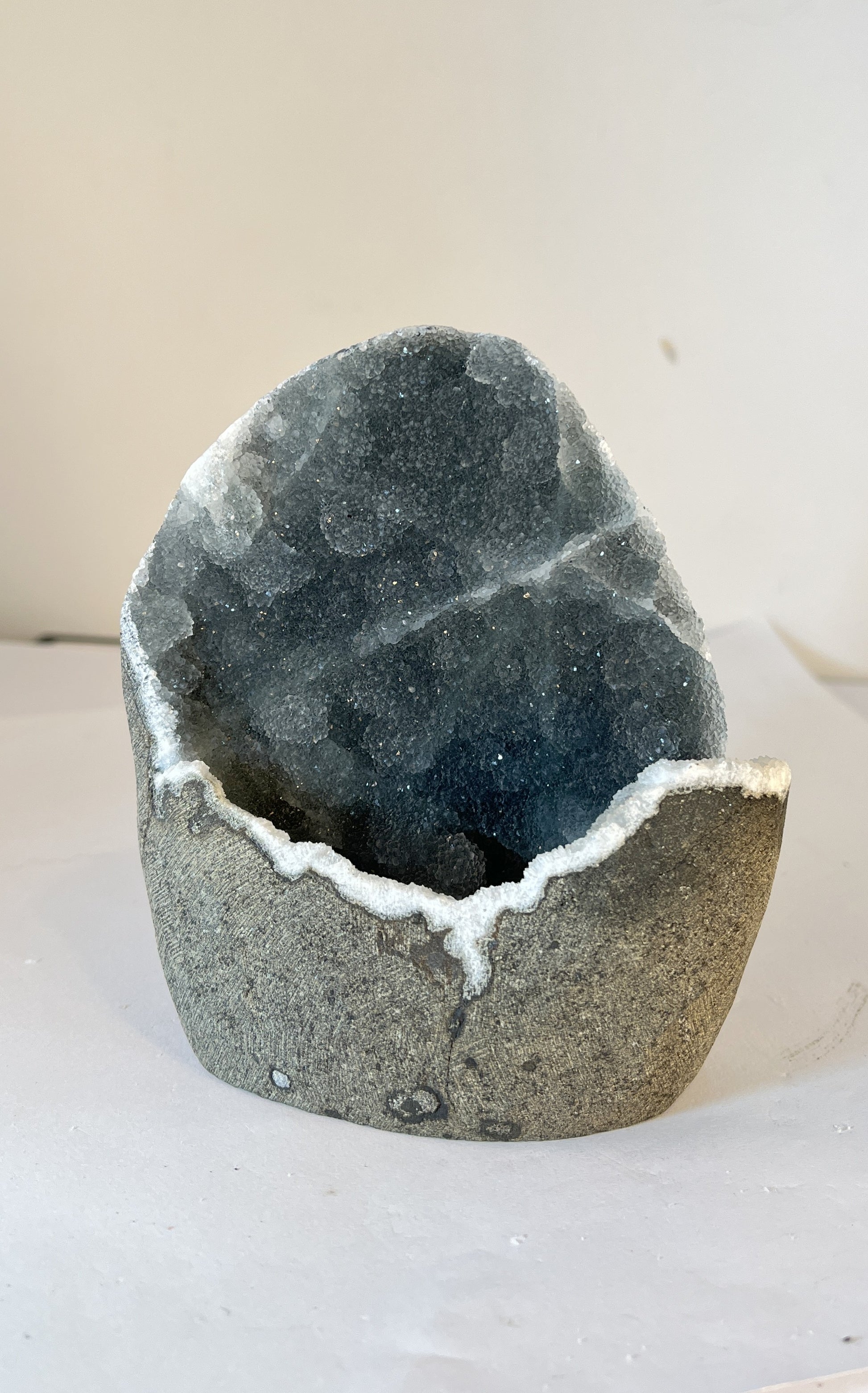 This Black Chalcedony is a beautiful and unique matrix specimen with a dazzling sparkle. Composed of entirely natural elements, this mineral is a rare find that is sure to make a statement. Make your collection stand out with this eye-catching black chalcedony. The matrix is cut flat on the bottom so it stands 1.24 lbs, 4" x 3.5"