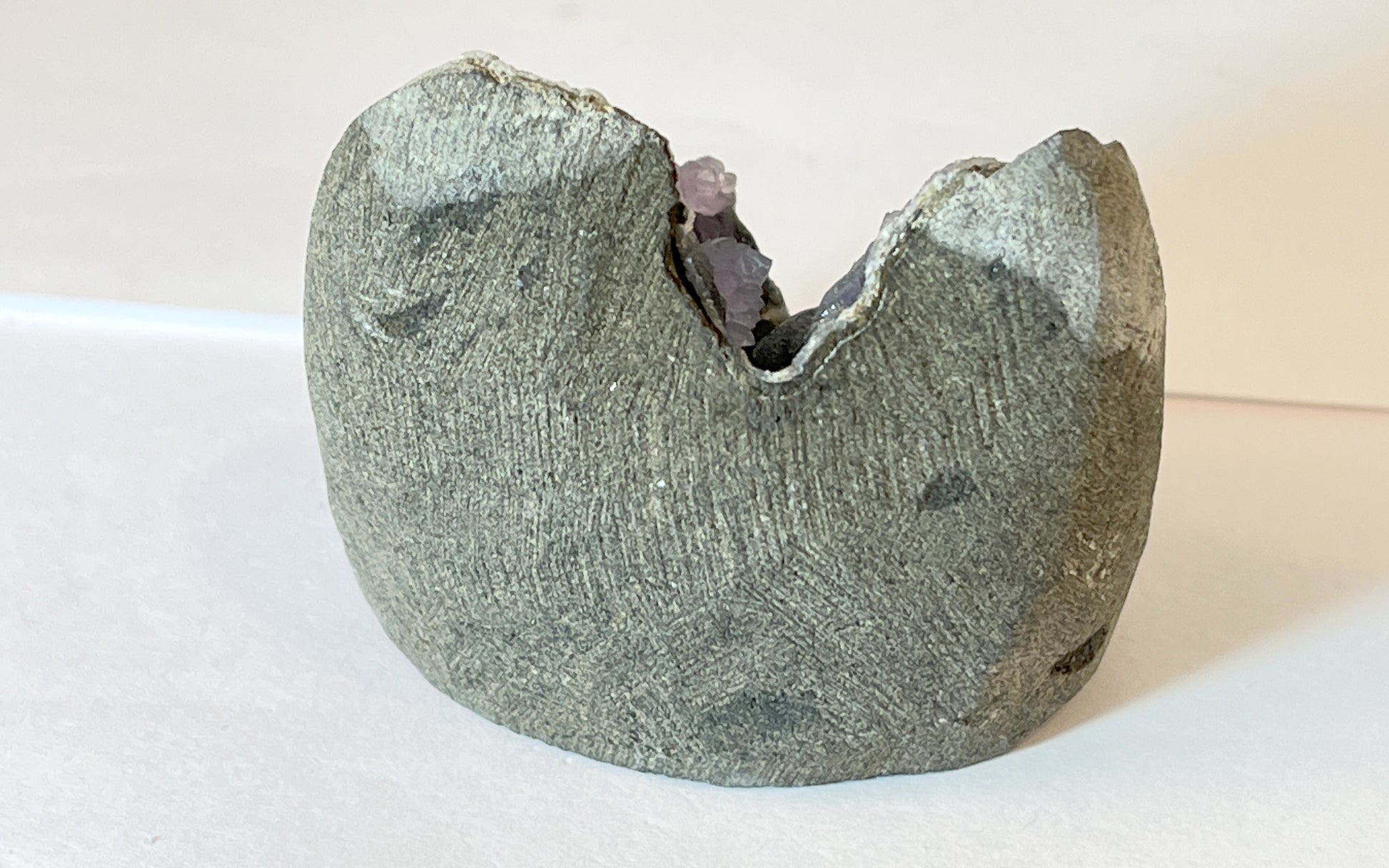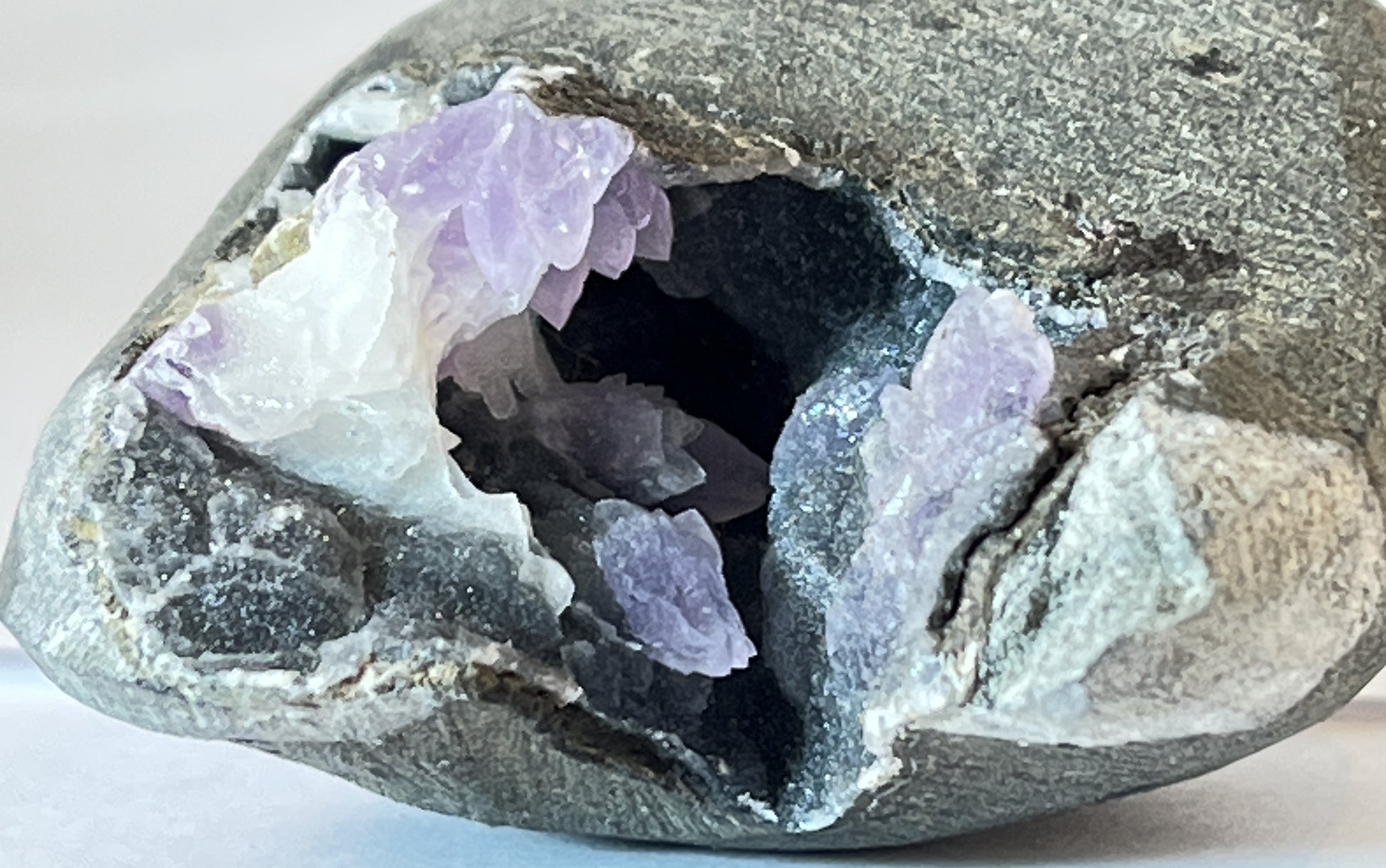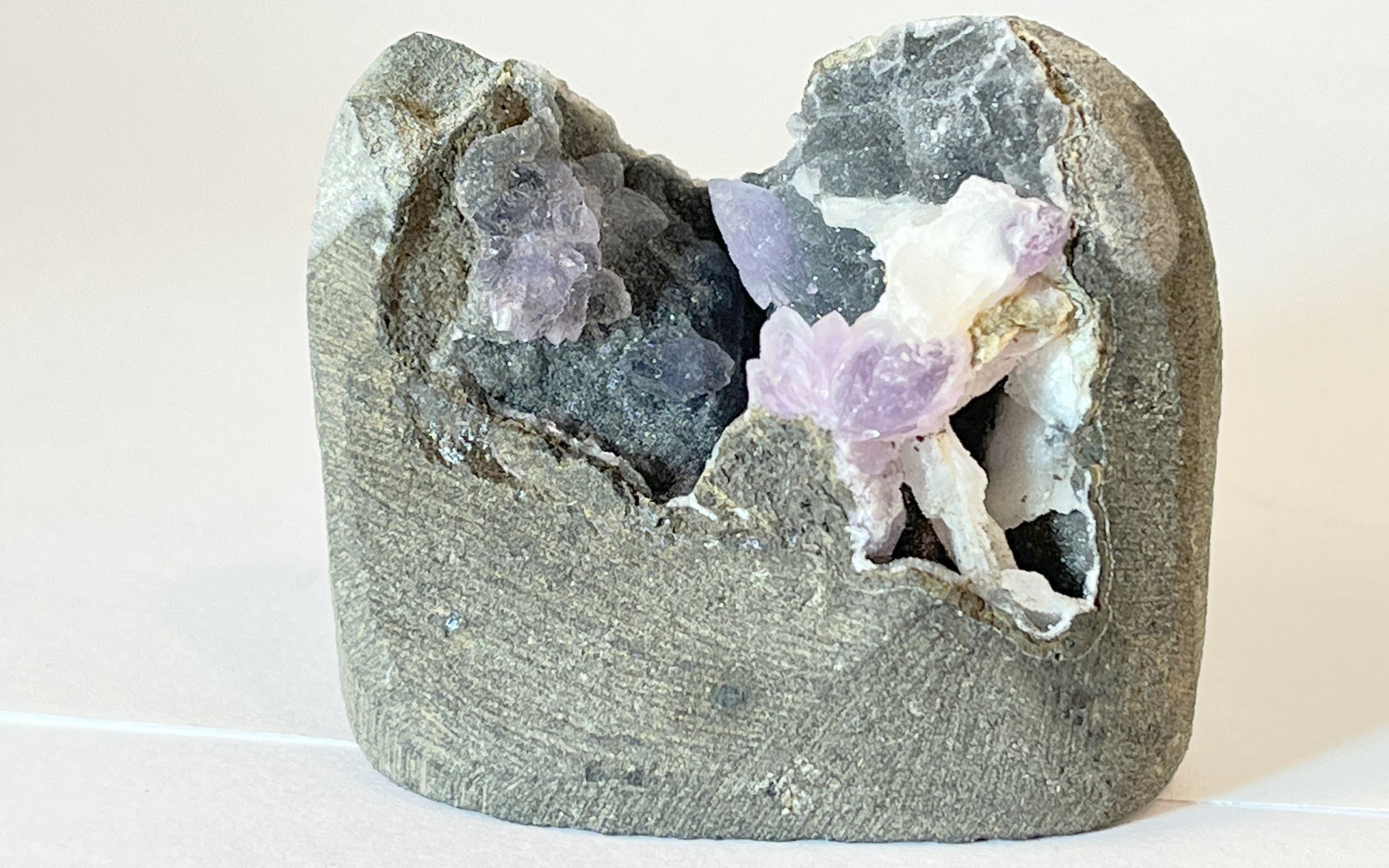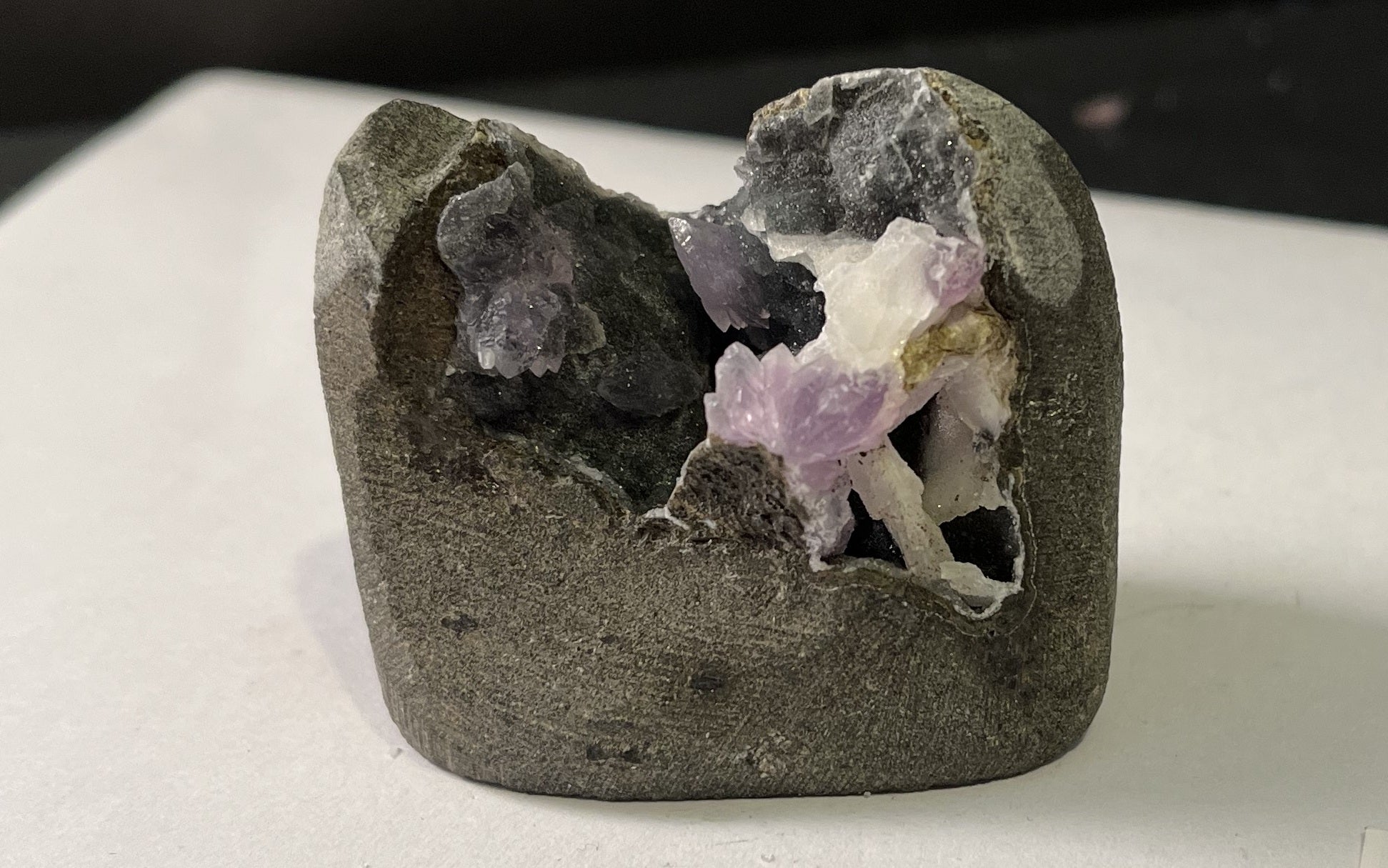 This premium black chalcedony is elegantly accented with miniature amethyst and basalt crystals for a stunning, singular presentation. The trio of materials integrate to form a tranquil aesthetic, making it a celebrated piece in any space. Its distinct twinkle is impossible to capture in two dimensions; photos do not adequately depict the effect of light playing off the facets of the chalcedony. Weighing almost 3 oz it measures 2" x 1.5". The bottom has been cut and polished so it stands on its own.