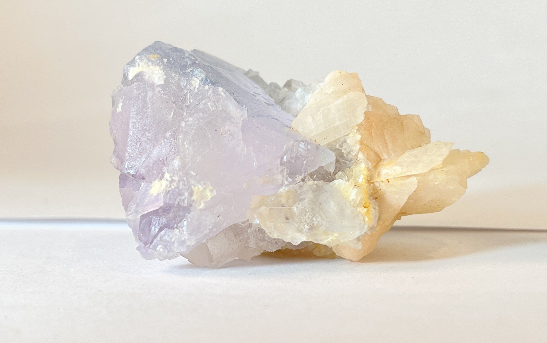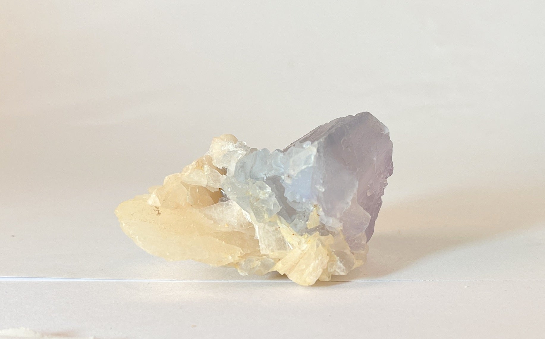 This exceptional specimen of fluorite from Bingham, New Mexico features pale soft blue coloration and impressive zoning. It is further accompanied by well-formed barite crystals, making it a unique and beautiful showcase piece. This is a rare, one-of-a-kind find. 2.43 oz, 2.5" x 2"