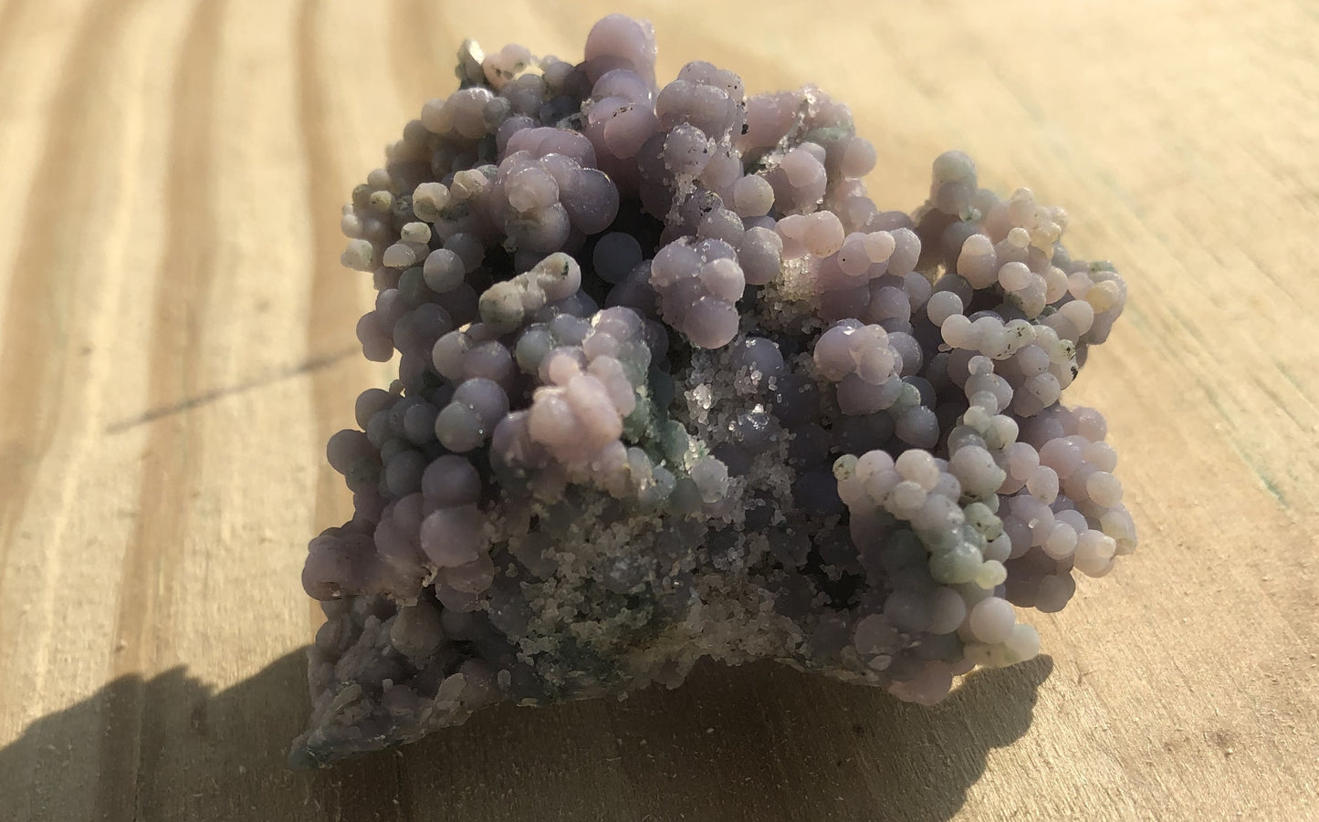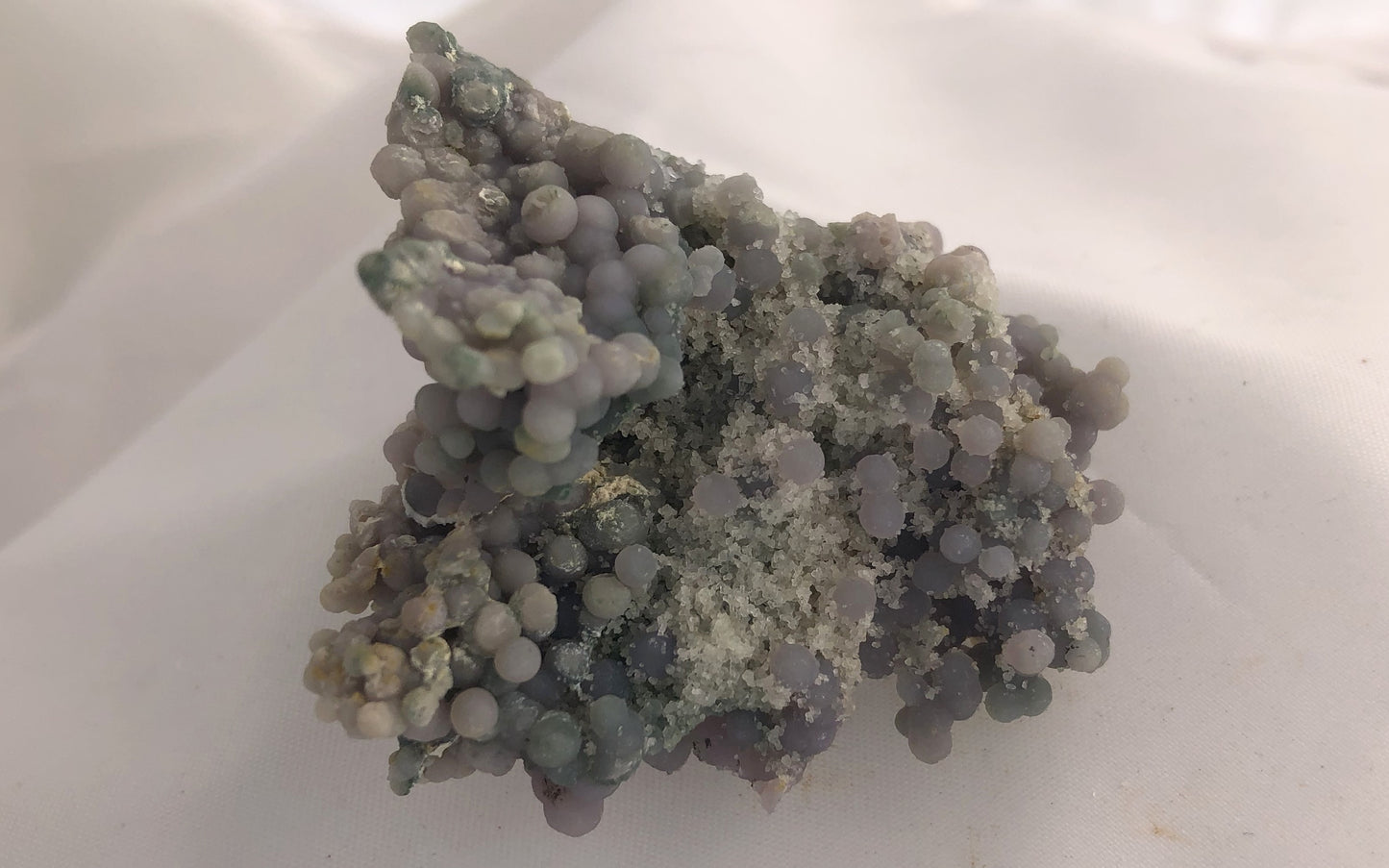 Botryoidal Chalcedony, aka Grape Agate, was recently discovered in Indonesia's coastal areas. Finally allowed to mine and export it, this material has gained popularity in recent years. A smaller, chunky little specimen - it has folds and divots filled with bots. Weighs in at 1.05 oz, 1.75"