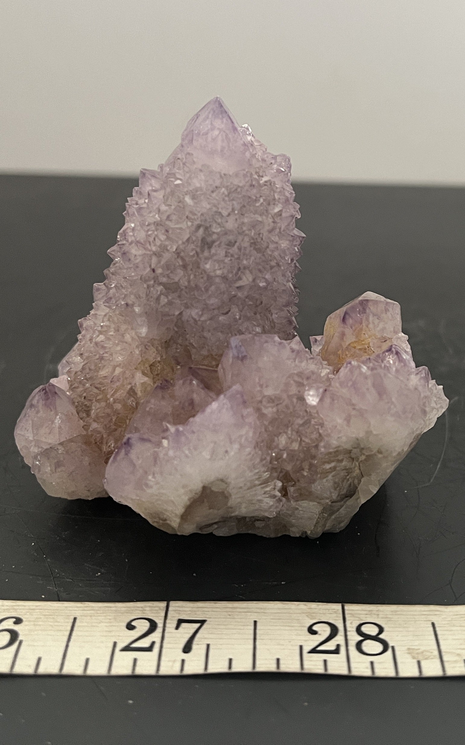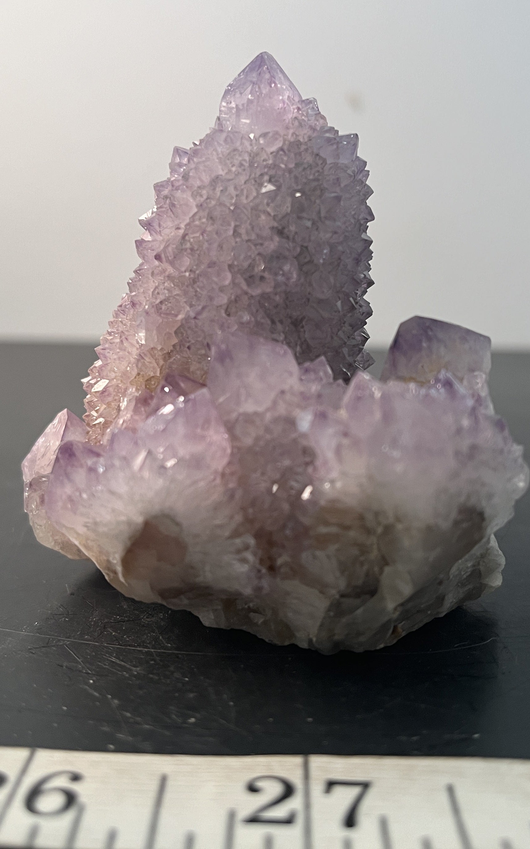 Experience the stunning beauty of Cactus Amethyst, aka Spirit Quartz, a unique member of the Quartz family that showcases a mesmerizing combination of amethystine coloring with a delicate, candle-shaped core adorned with hundreds of crystal termination points. Other variations may feature clear, smoky, citrine, or iron-stained hues, making each specimen truly one-of-a-kind. This is a must-have addition for any crystal collector or enthusiast looking to add a touch of elegance to their collection. This specimen is mostly a pale lilac color with multiple candle-flame terminations. Weighing in at 6.35 oz, it measures 2.75" at its tallest peak and 2.75" across.