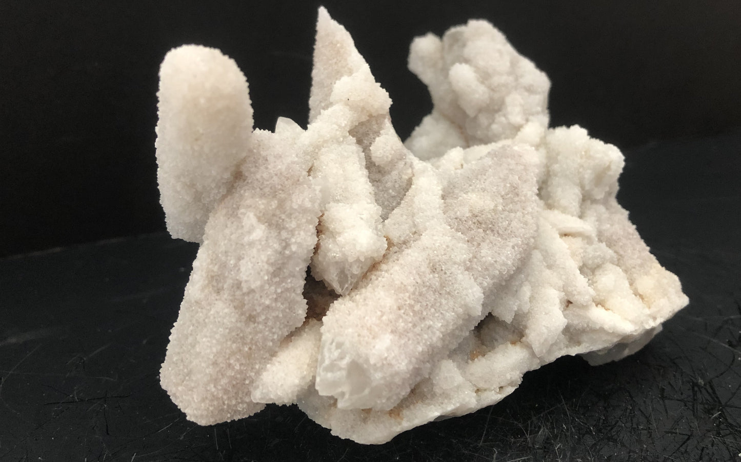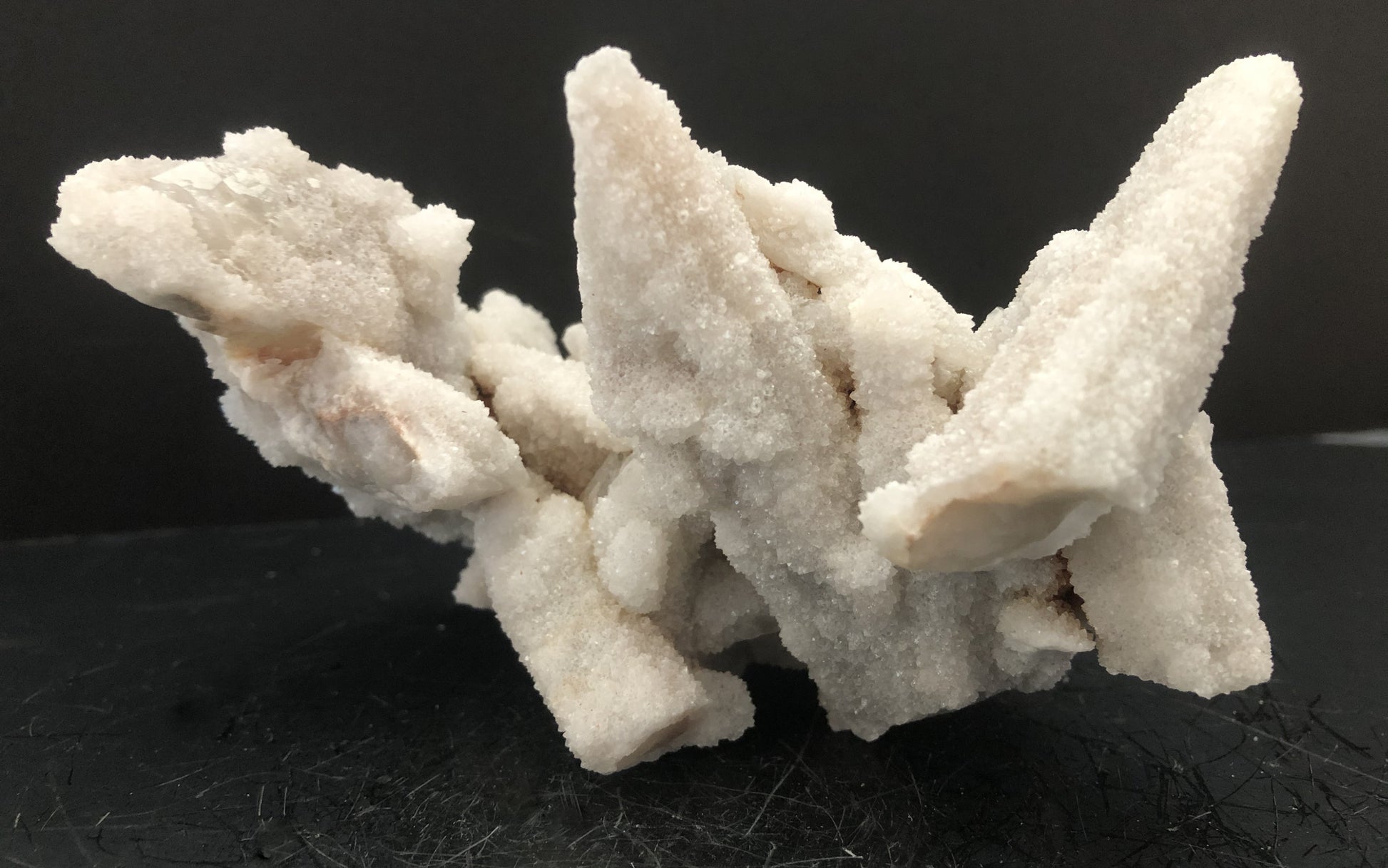 Not your typical cactus quartz - this one is white or gray. It has a very unique shape and a rough texture to it. There are places where it was sheared off or cut from the matrix where you can observe the fine, sandlike coating of crystals wrapped around the darker, inner core. 4" x 4" (at its longest points) 13 oz.
