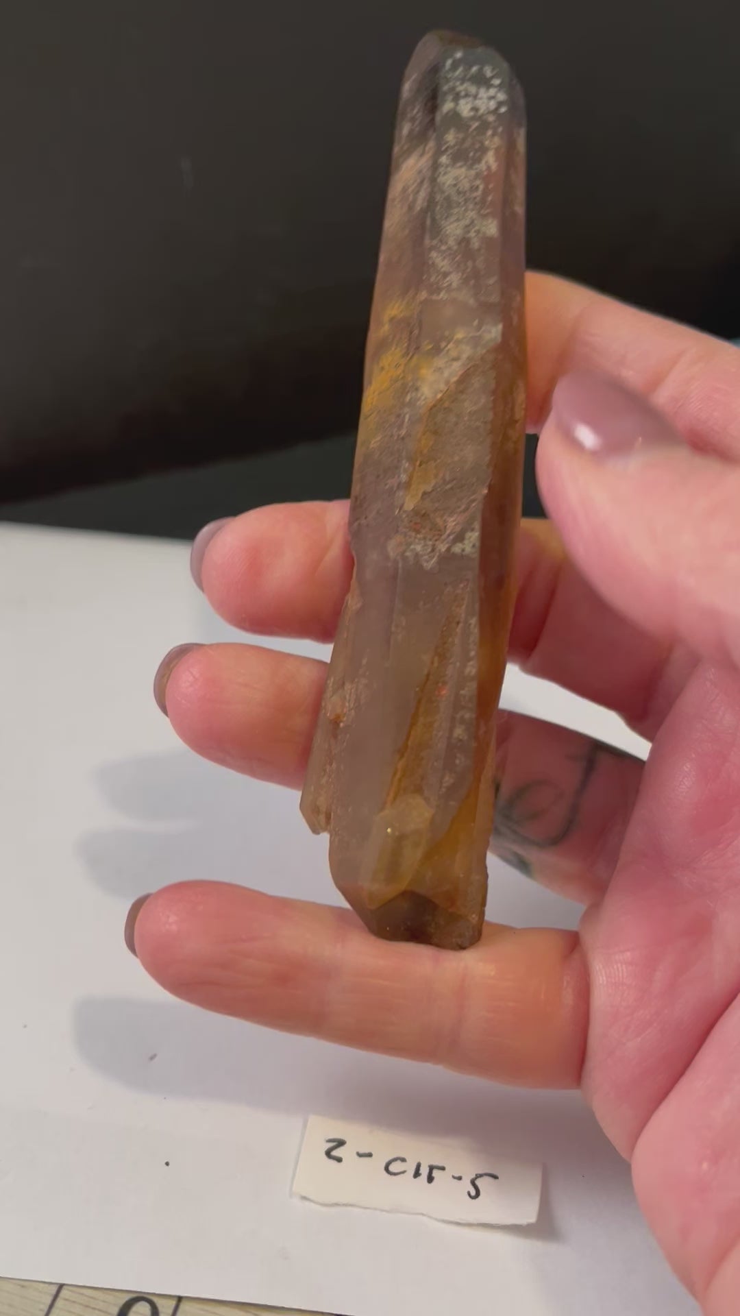 A long, thin, elegant crystal, with one smaller, paler crystal on the bottom with multiple contact points. It is a light smoky yellow color that darkens near the tip, weighs 1.96 oz, and measures almost 4.5" long.