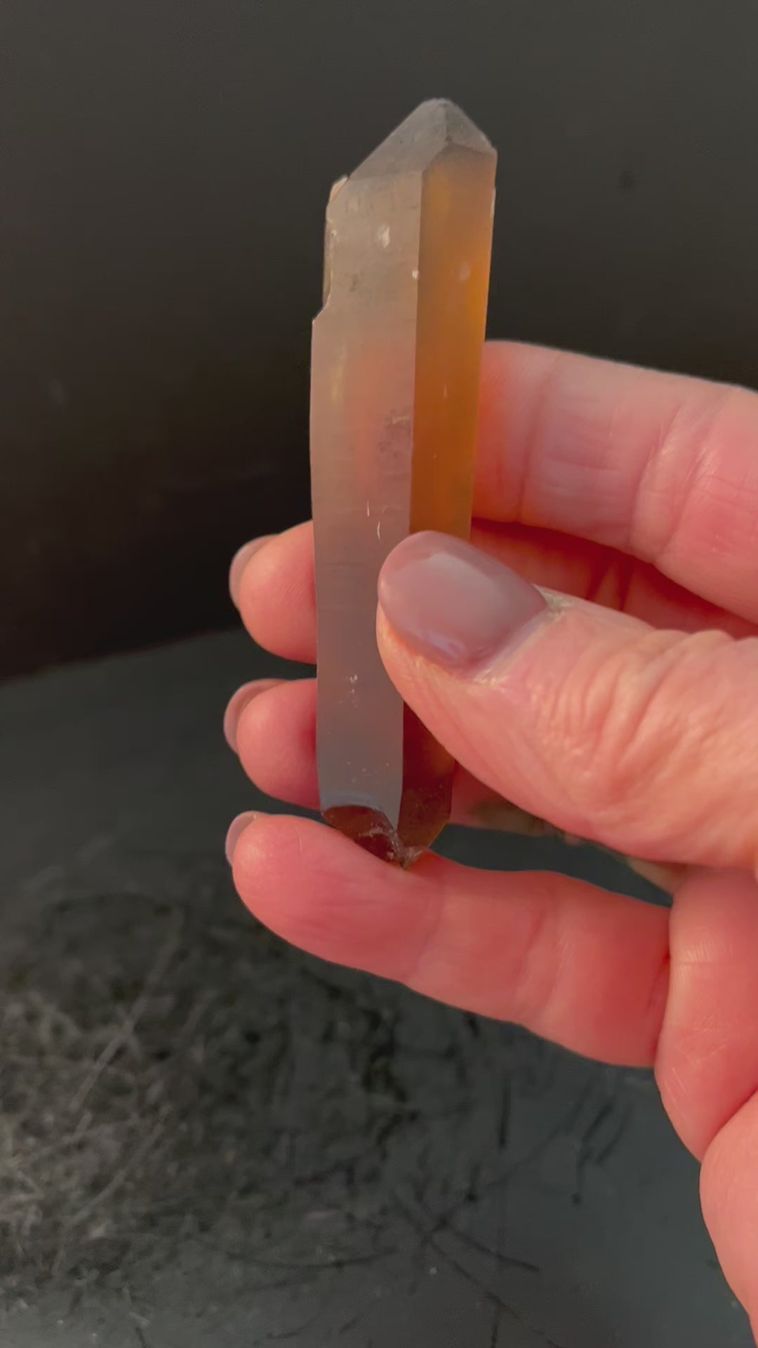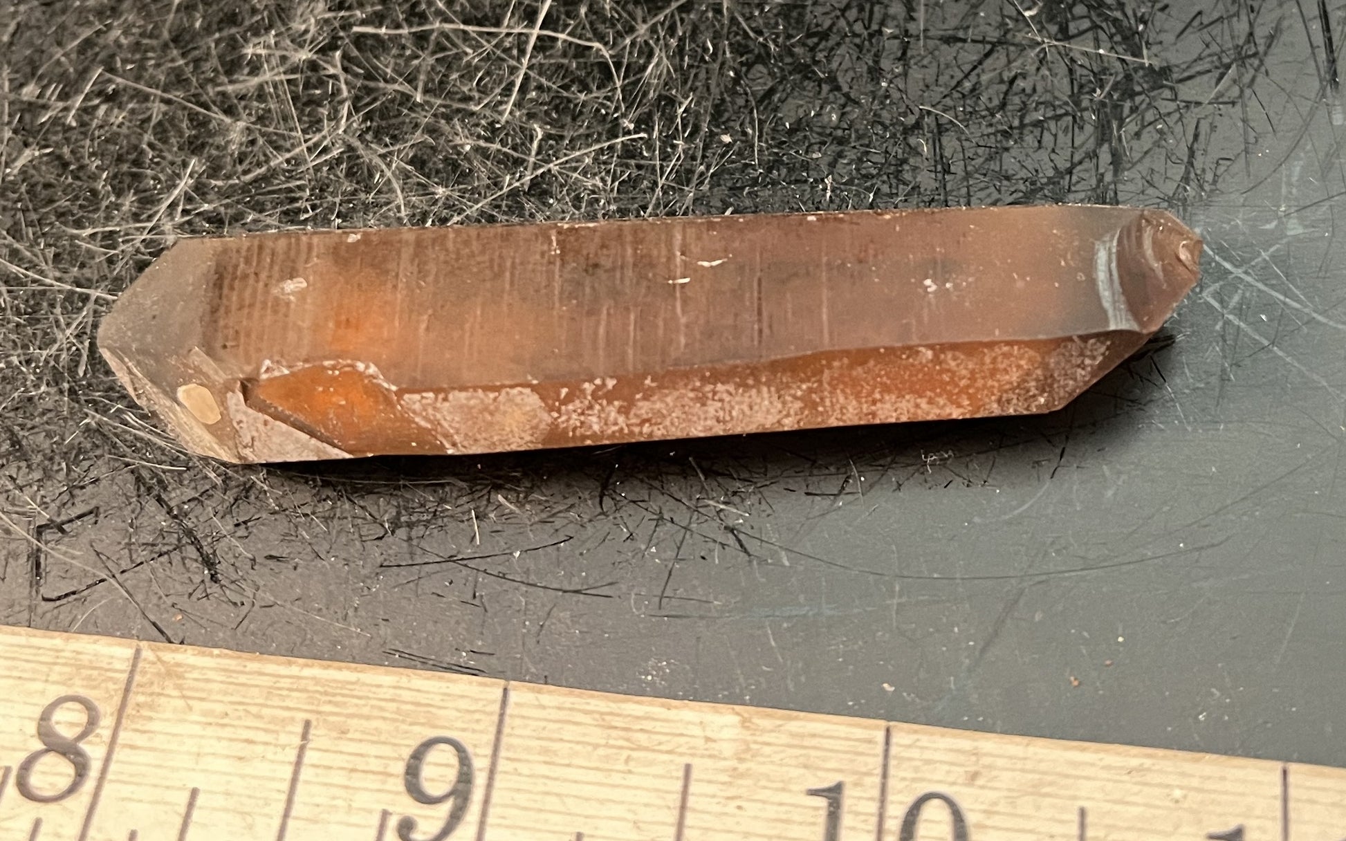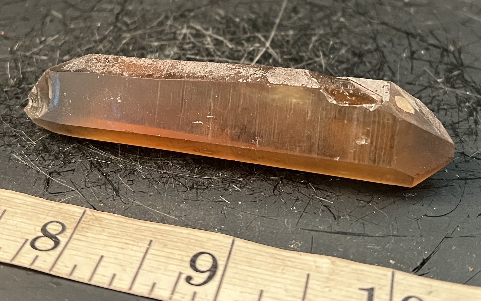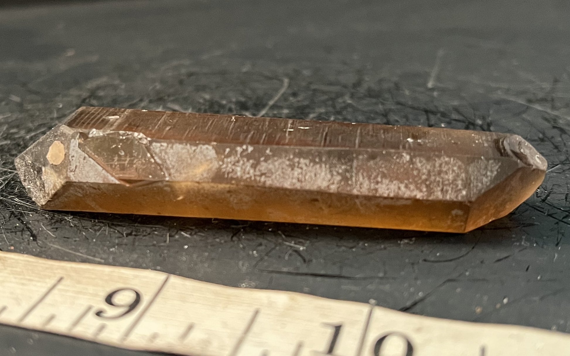 A perfect crystal that is double terminated. A minor chip disturbs the perfection of its tip on one end - but it has fabulous golden smoky color and one contact point. Weighing 1.07 oz, it measures3".