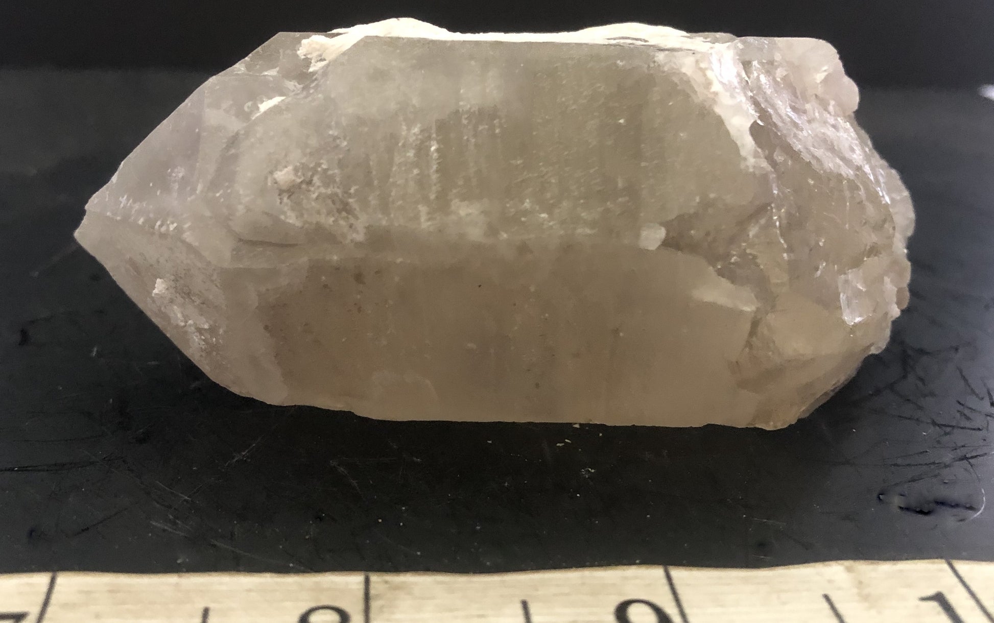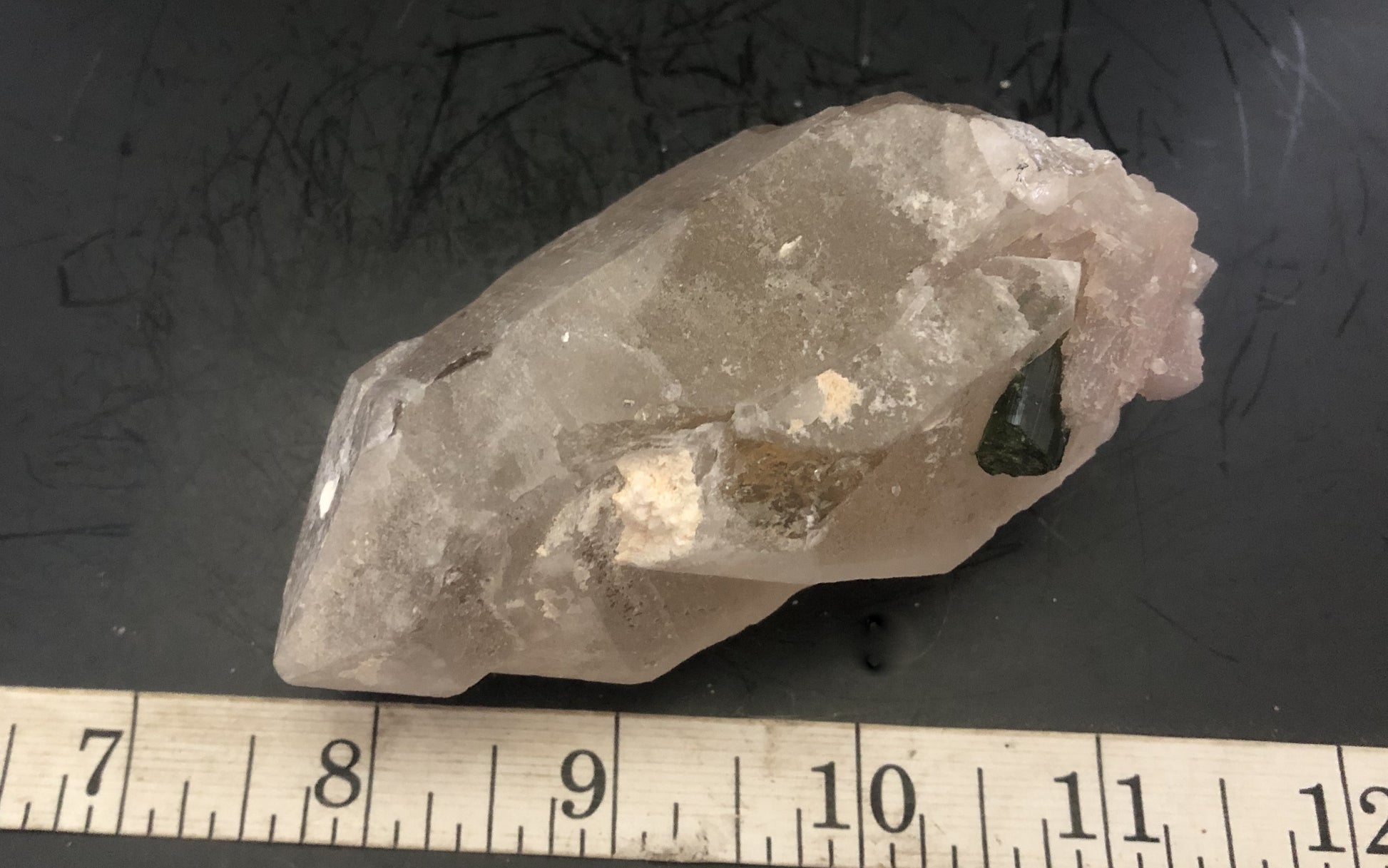 A well formed natural citrine crystal with a small green tourmaline embedded. The main crystal is speckled with mica. A fascinating specimen, it has almost a frosted look but is smooth in spots and clear in others. 8.95 oz, 4" long