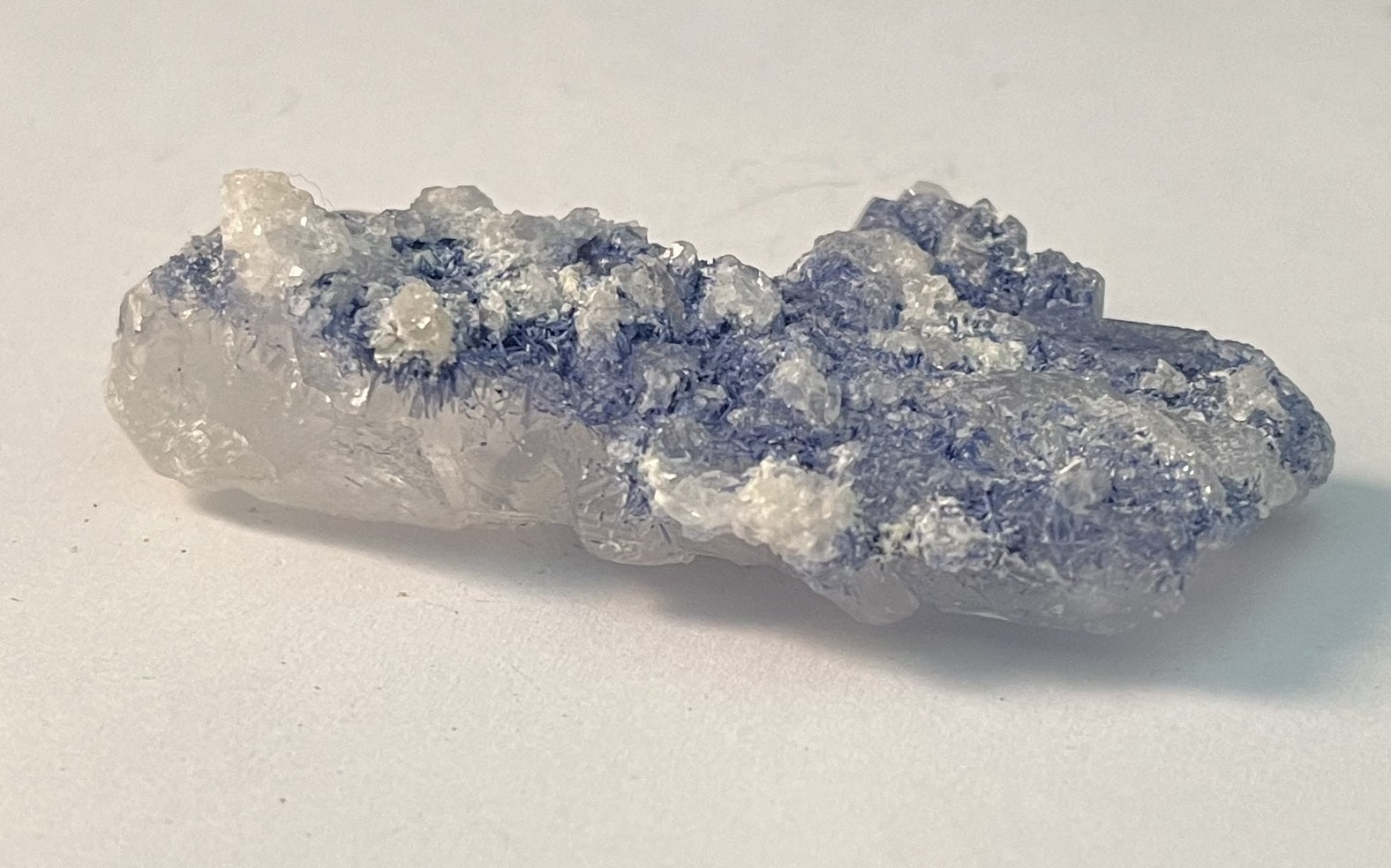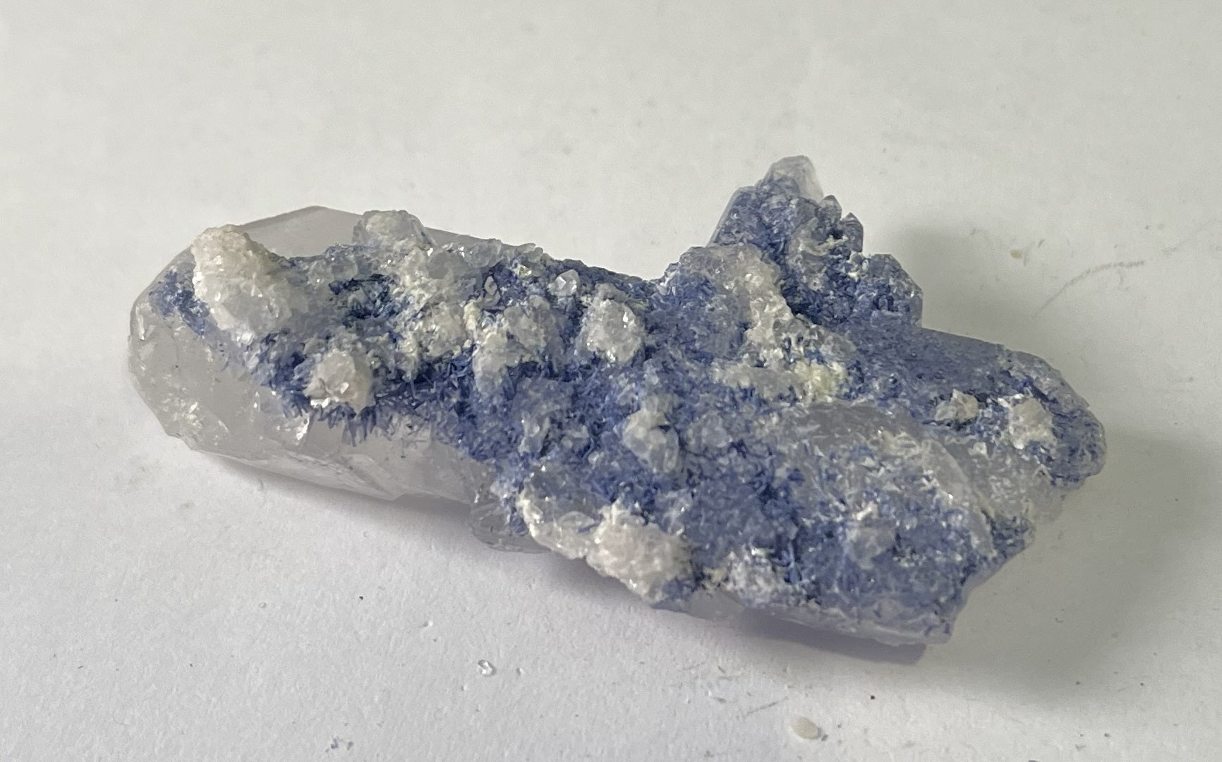 This specimen of dumortierite in quartz originates from Brazil and is a remarkable example. The bottom of the crystal is coated with pale blue dumortierite crystals. Weighing 22.4g and 2" long. Dumortierite is a very rare aluminum borate silicate mineral that appears in masses, small prismatic crystals, or fibrous inclusions within Quartz.