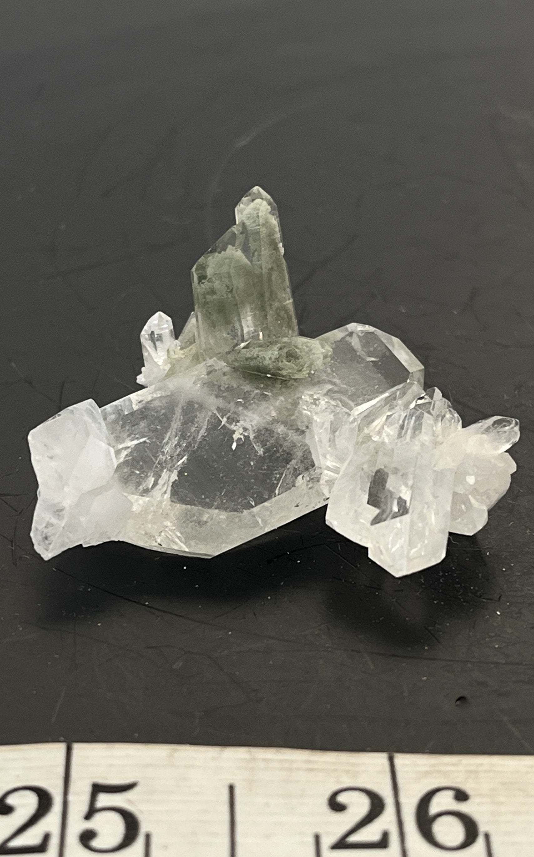 Faden Quartz is a unique deposit that forms connections with metamorphic rocks and is usually found in a vein with open spaces. This type of crystal is described as a group of tabular quartz crystals with a white thread-like or string-like zone running through its interior. The crystals within the host rock will break when exposed to a silica-rich solution, but will quickly heal, attaching to opposing rock walls and creating bridges in the new opening. As the fissure continues to open, the crystal will continue to crack and heal. This process occurs in areas with low-grade metamorphism, where cavities in the rock are growing. The growth of these zones results in the repeated breaking and healing of quartz crystals, incorporating fluid and gaseous inclusions (the white threads). The edges of the crystals grow faster and incorporate the liquid inclusions in the center of the crystals. The repeated rupturing and healing leaves a scar of liquid and gas inclusions in the crystal: a white thread, the "faden". In rare cases, the faden is covered by chlorite, which demonstrates beautifully that a now platy specimen did indeed start as a thin thread.