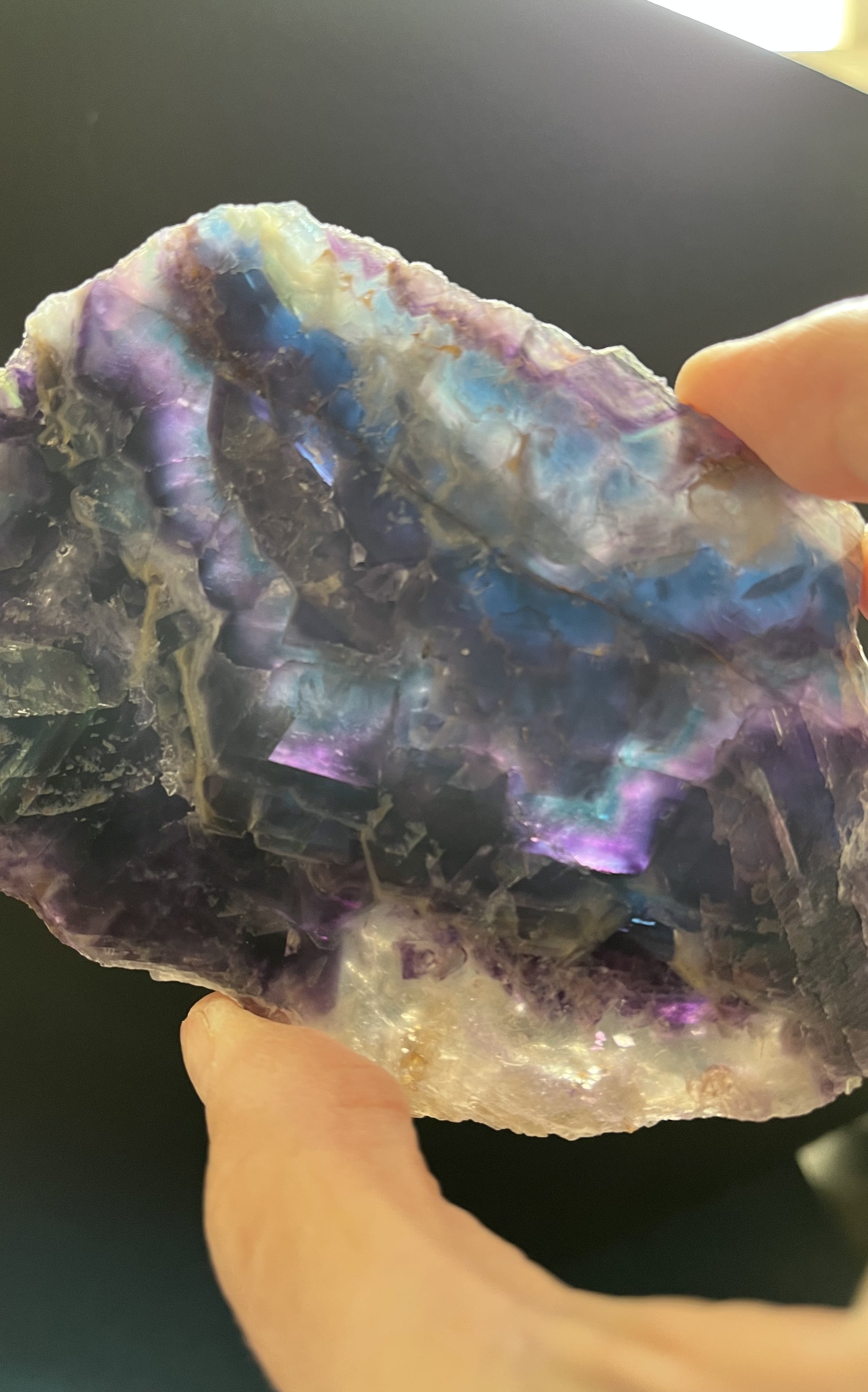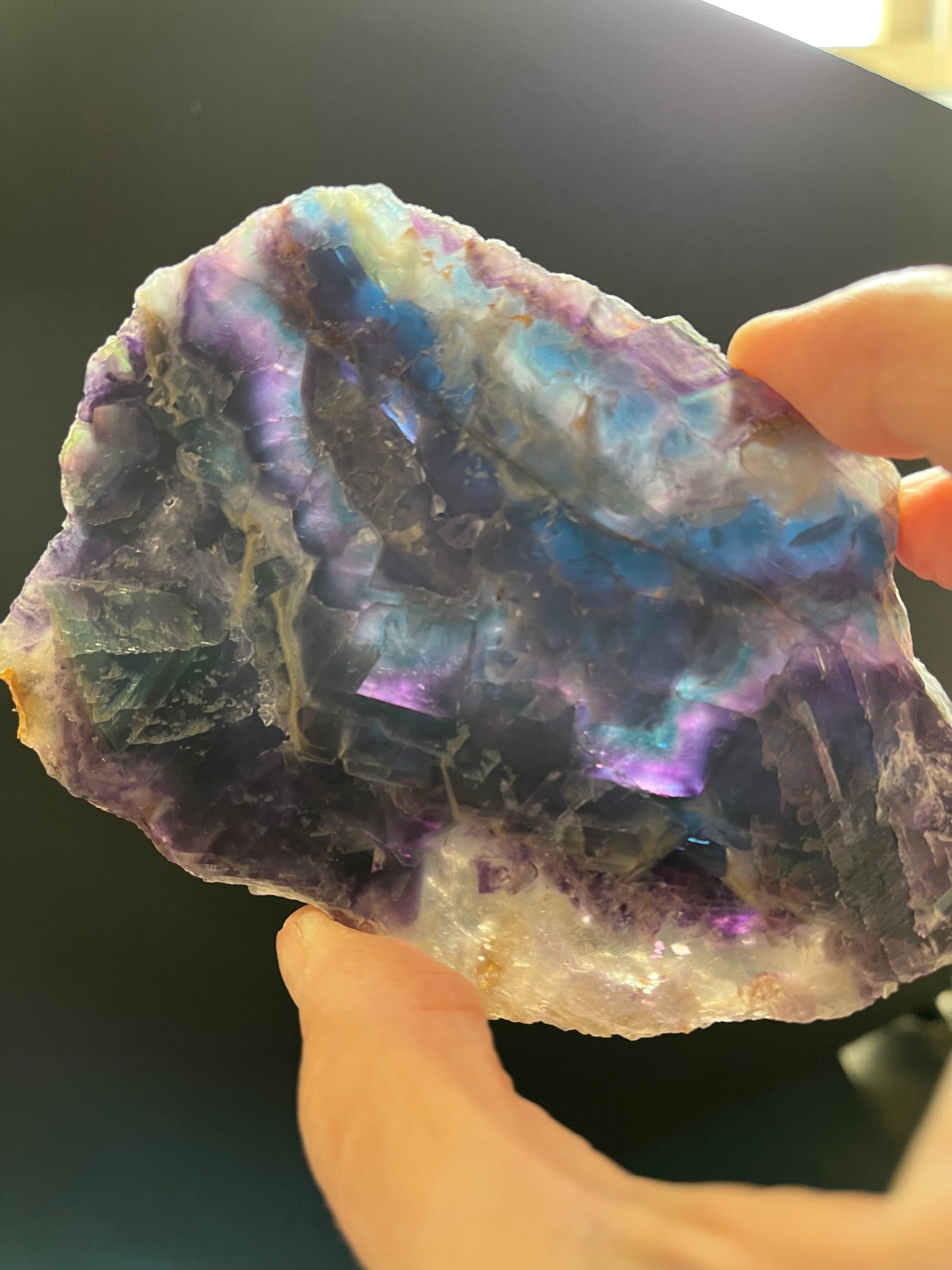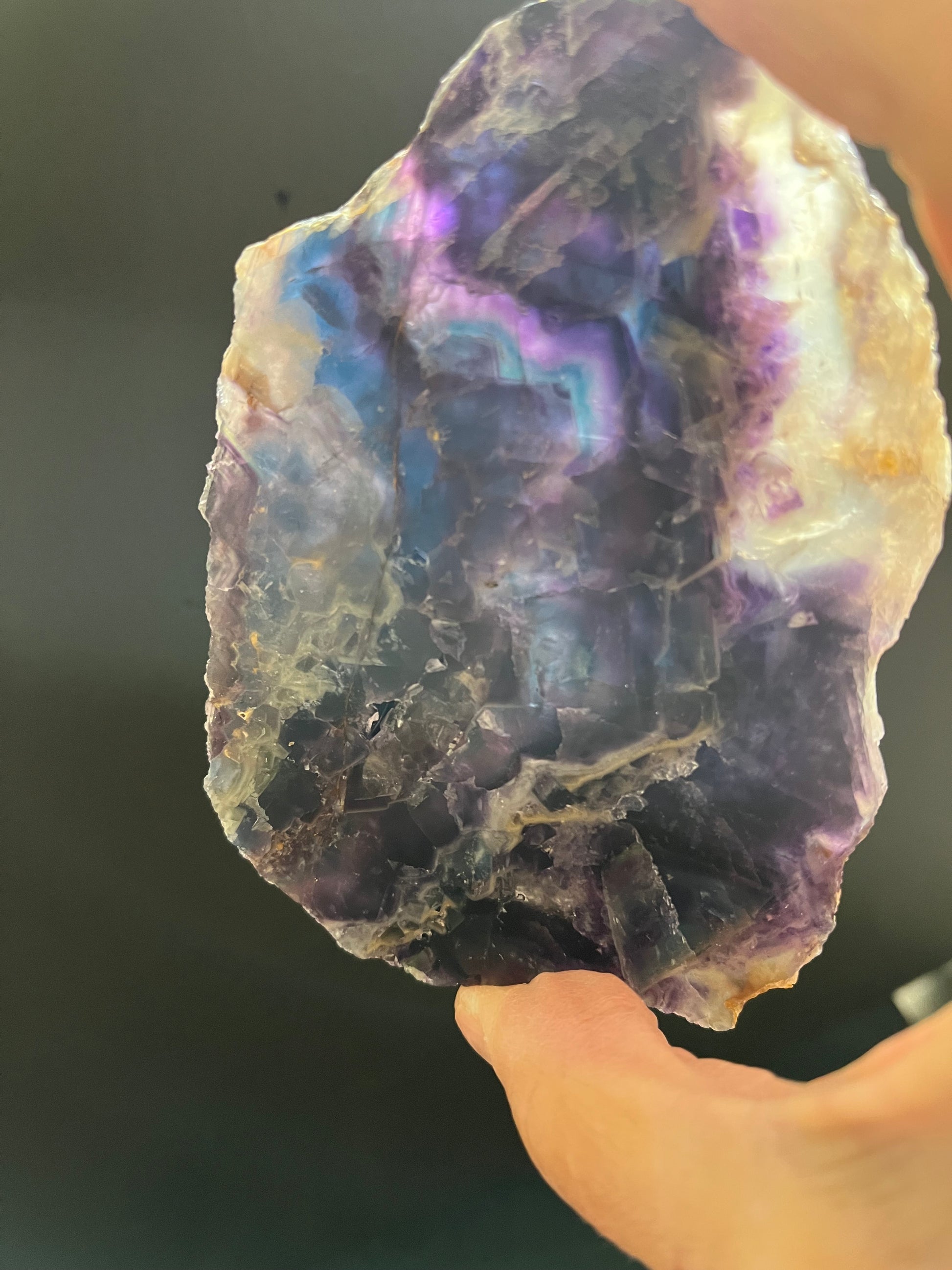 An awesome slab of fluorite with varying shades of teal, green, purple, and clear.