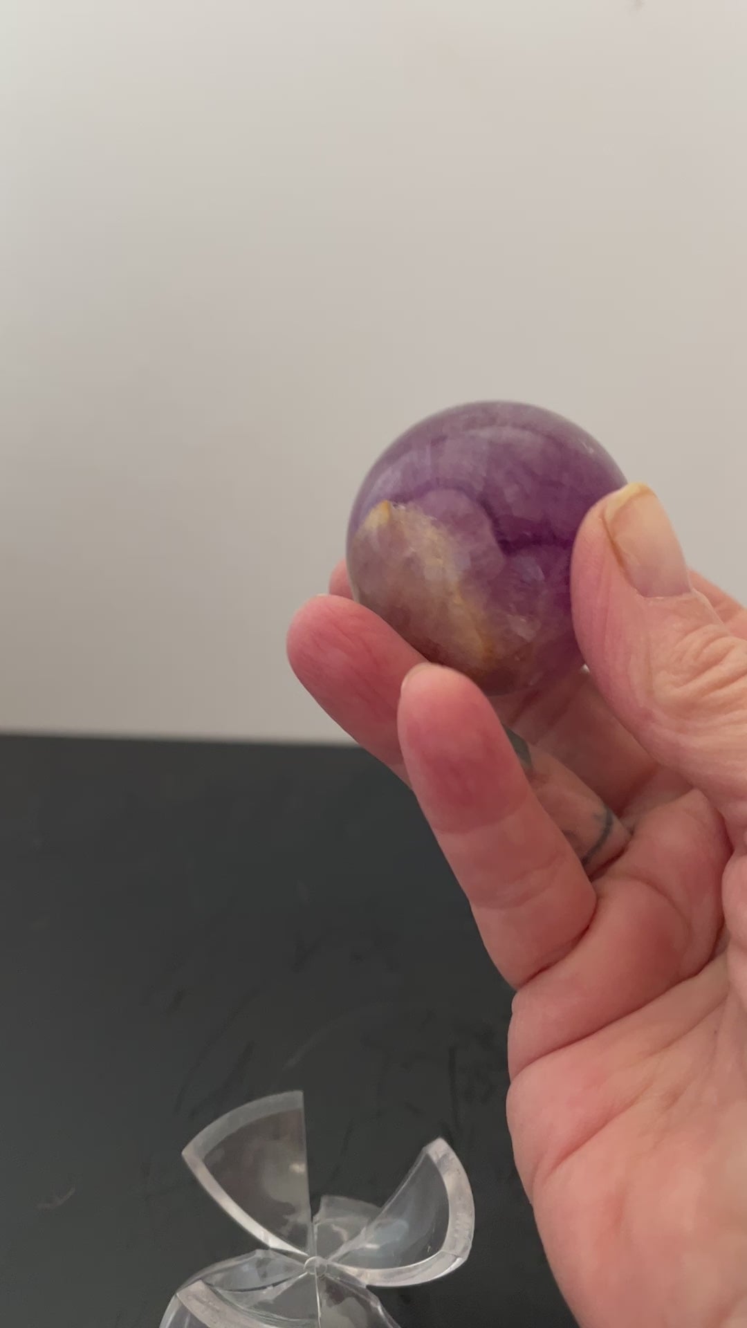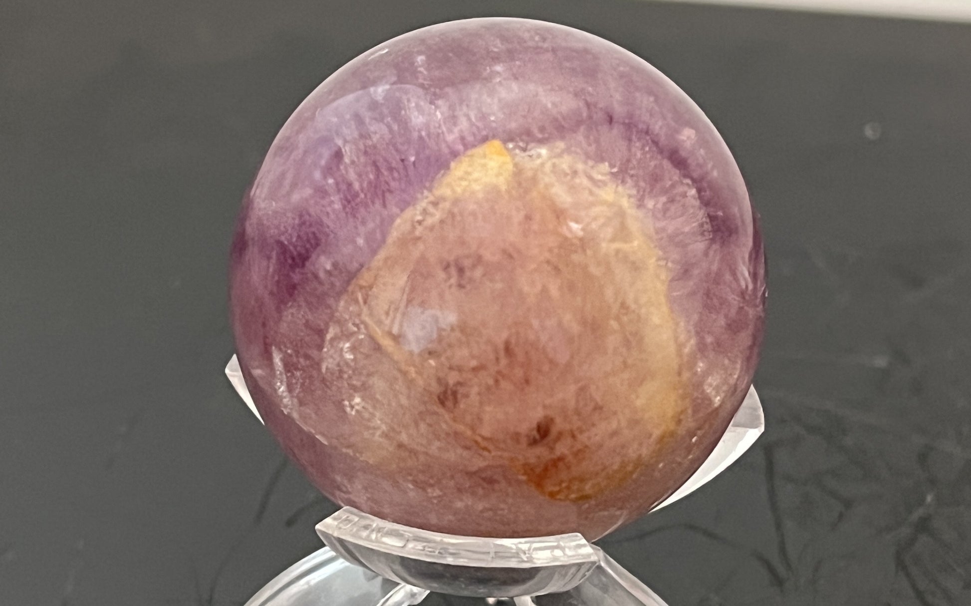 This particular sphere features various shades of purple with a striking splotch of golden hues.