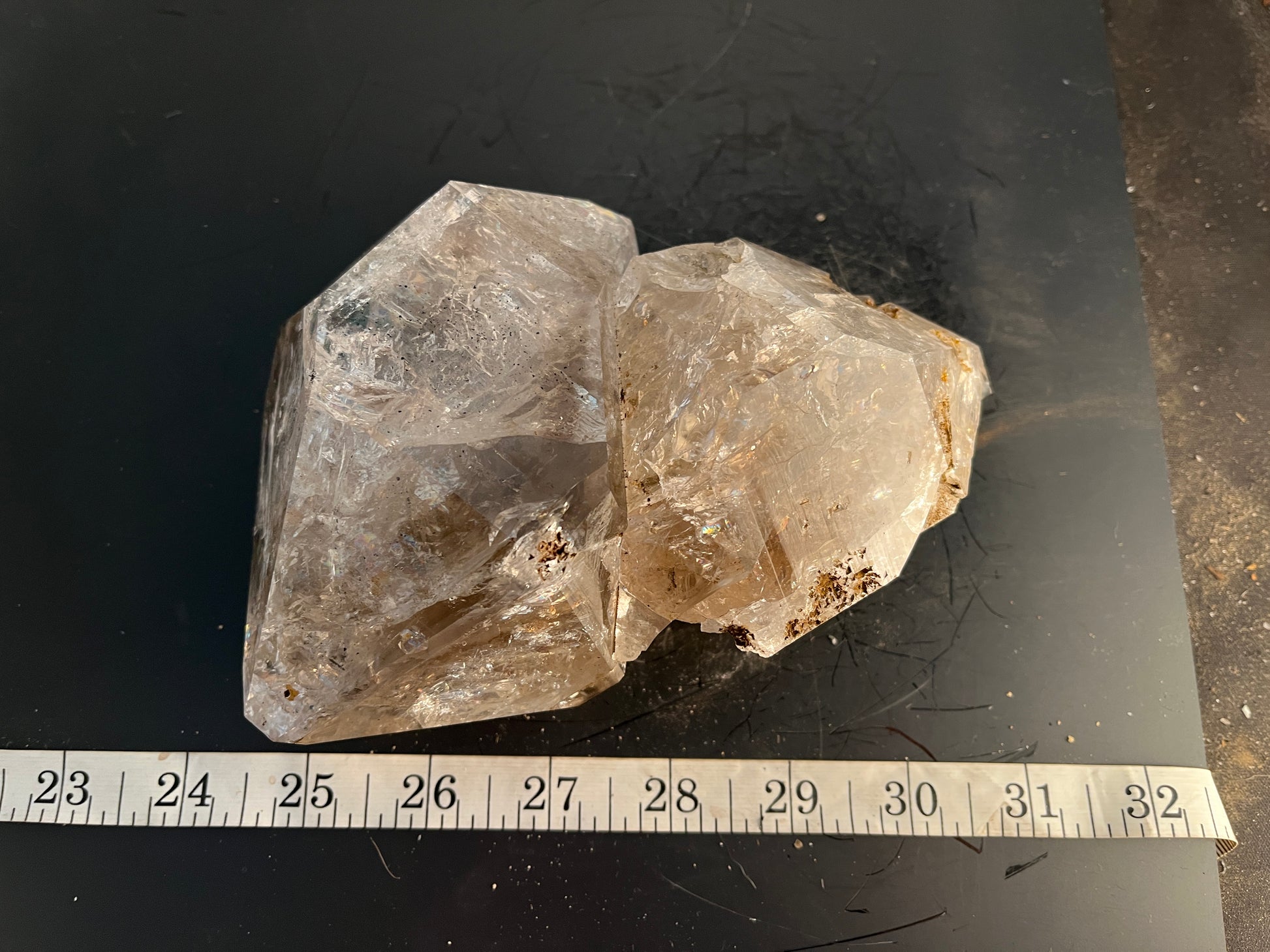This reconstructed Herkimer Diamond cluster displays remarkable features: its specks of rainbow reflections shine brightly, its classic matrix pitting is visible at the bottom and on the sides of the smaller crystal, and it weighs 2.63 lbs. and measures approximately 7" at its longest points. Its aesthetics are sure to captivate.