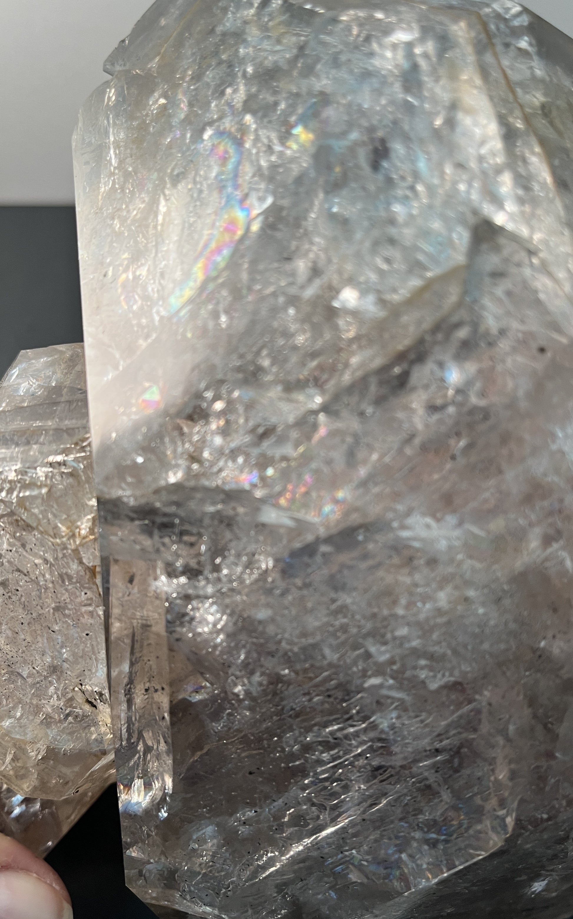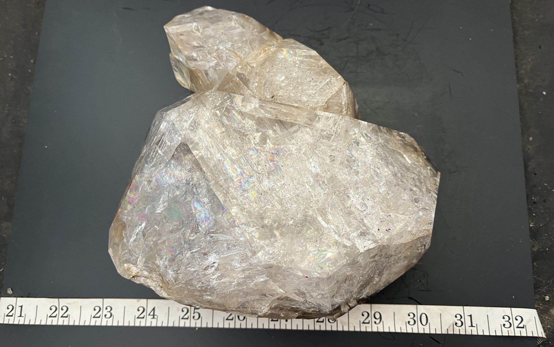 This reconstructed Herkimer Diamond cluster originates from a recently opened goonie pocket (2023). Its crystal structure is intact, with only minor surface imperfections, making it a remarkable find. This triple collection of crystals presents a unique combination of brilliant form and structure. It weighs 3.35 lbs. and measures approximately 7" in length.