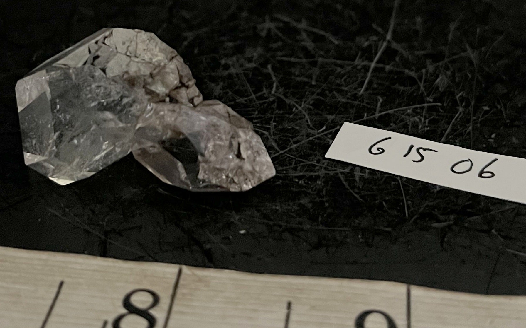 This drusy cluster detached from the roof of the pocket, exhibiting the telltale anthraxolite speckles of its origin. Weighs .35 oz, 1.5"