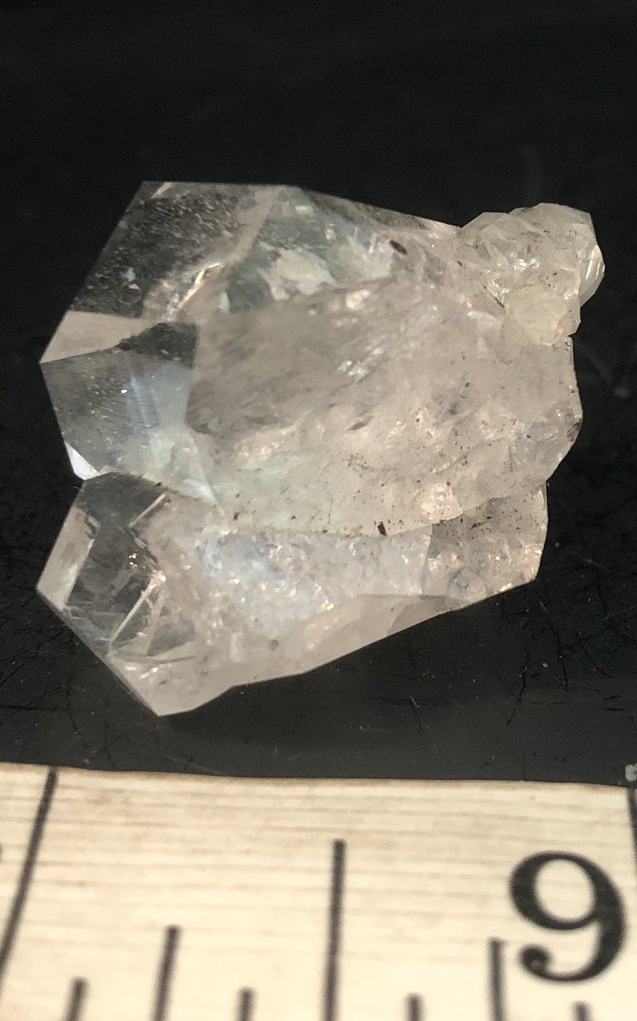 Although not perfect, this cluster has many interesting features. It boasts two larger crystals bordered at the bottom by smalls. There appears to be a crystal missing between the two largest ones and you can see on the base where it broke off. The really cool part is on one side the so-called "meltage" that happens when it forms on a bed of anthraxolite. Of course, it isn't really melted but it appears to be. 1.14", .6 oz