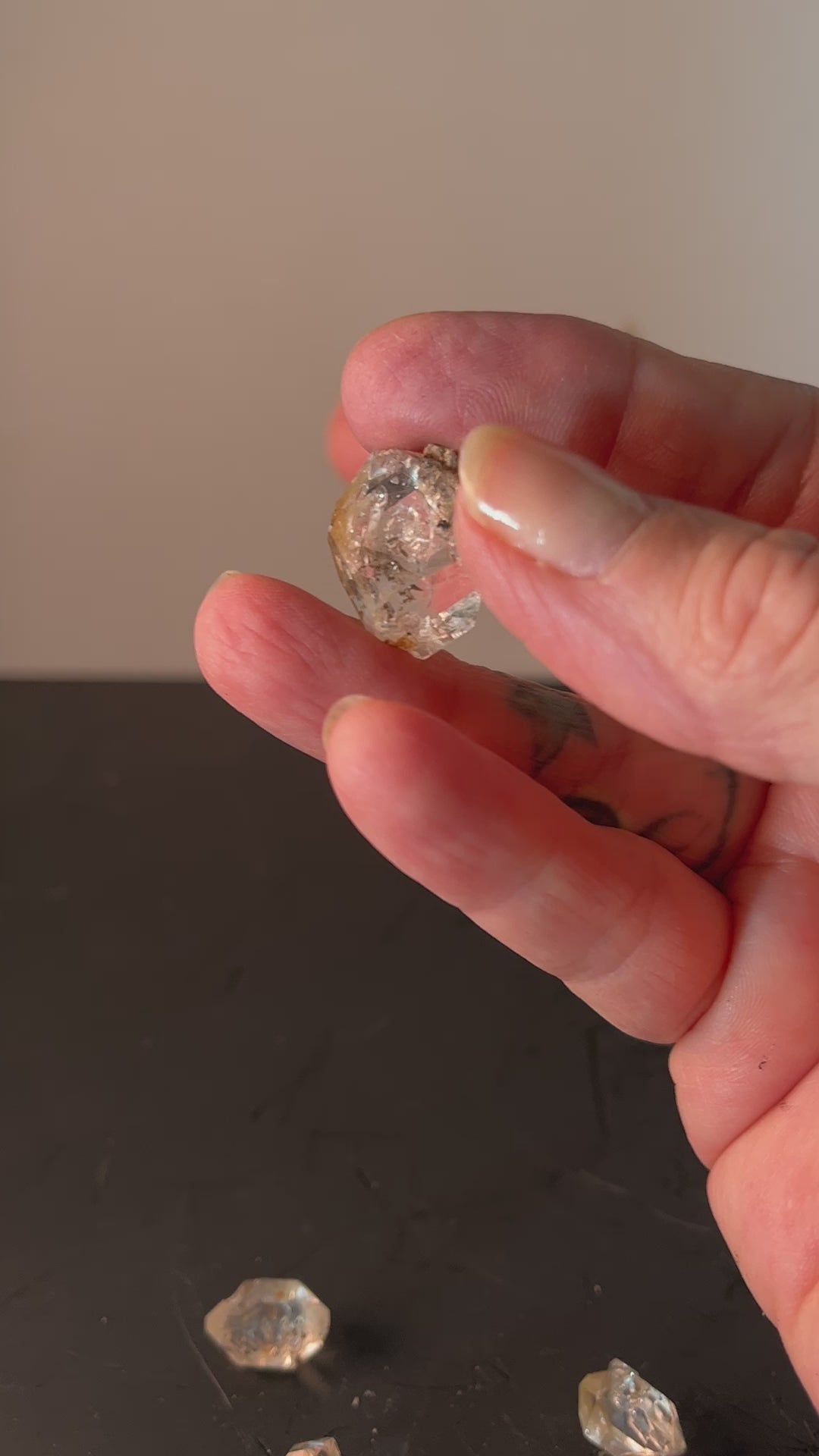 This Herkimer Diamond Mini Pocket contains four double-terminated crystals, with the largest one being a tabby with a small amount of matrix remaining.