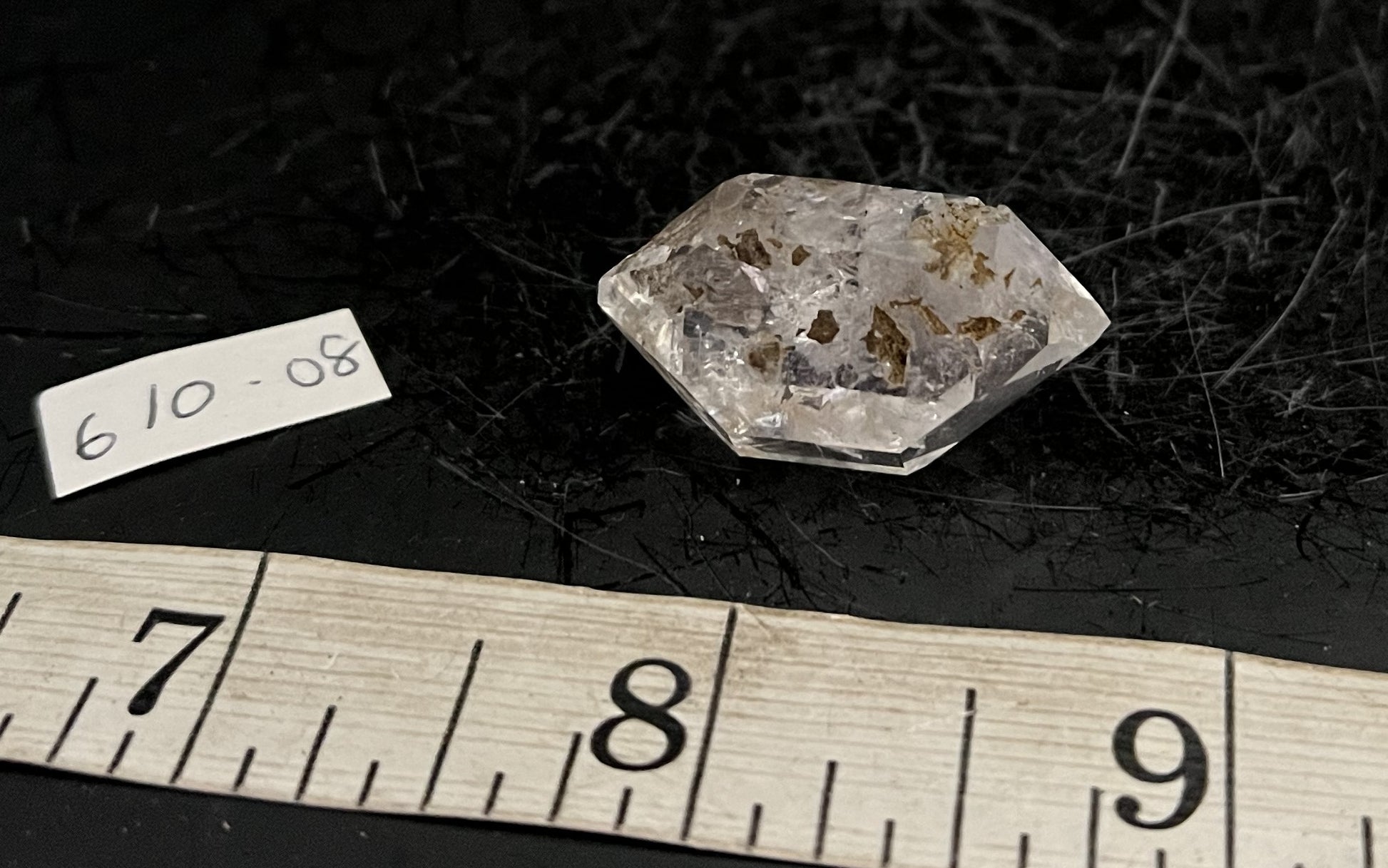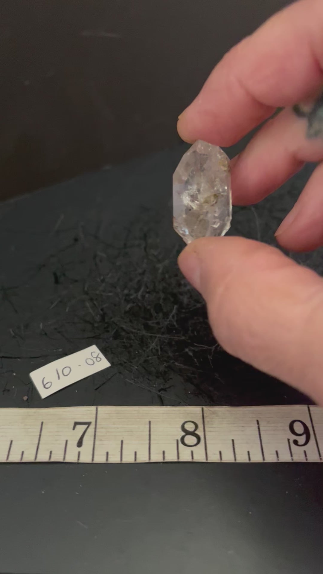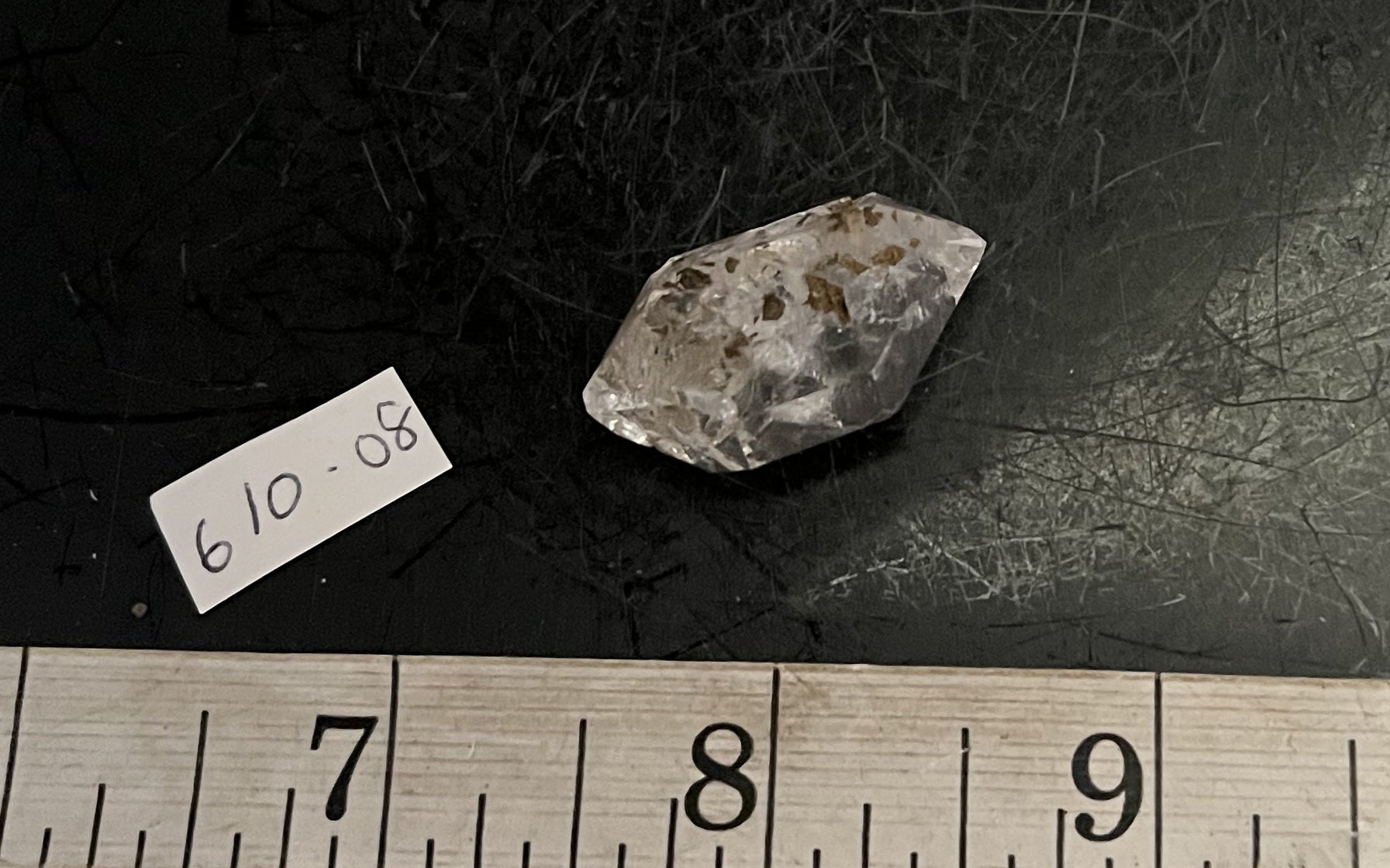 This double terminated Herkimer Diamond crystal has one little blowout but it hardly matters. The back is speckled with anthraxolite, making it shimmer and glow. .23 oz., 1"