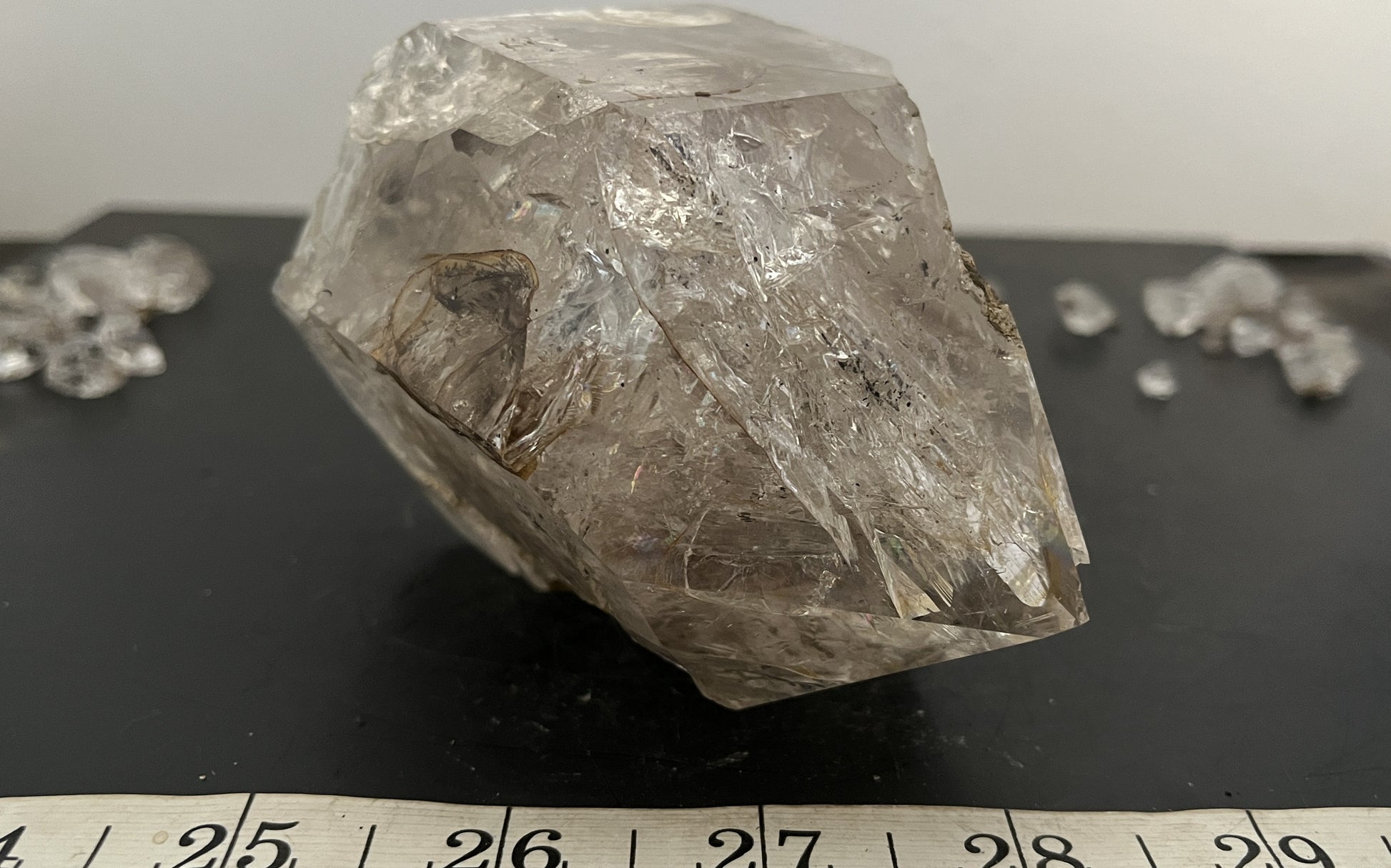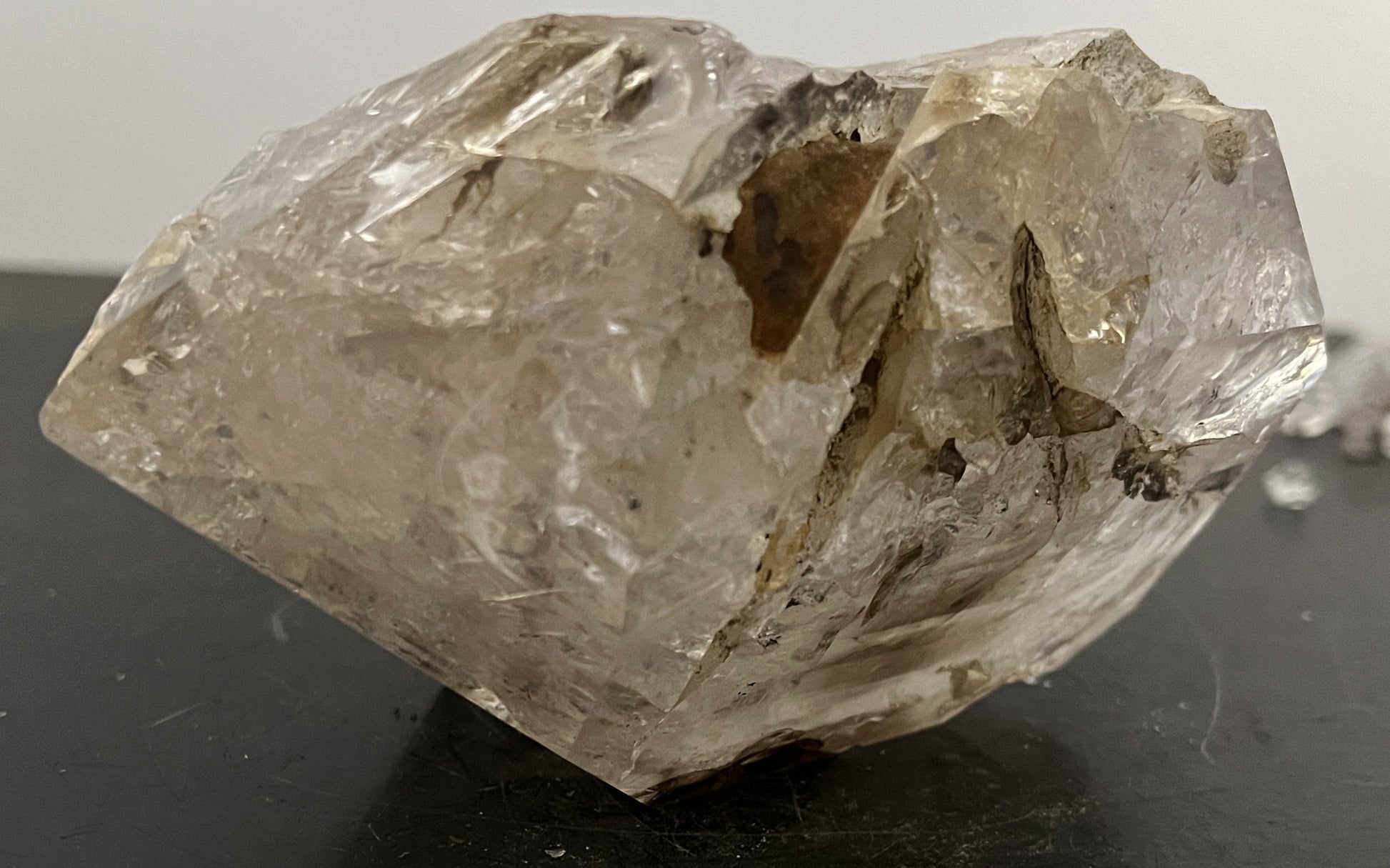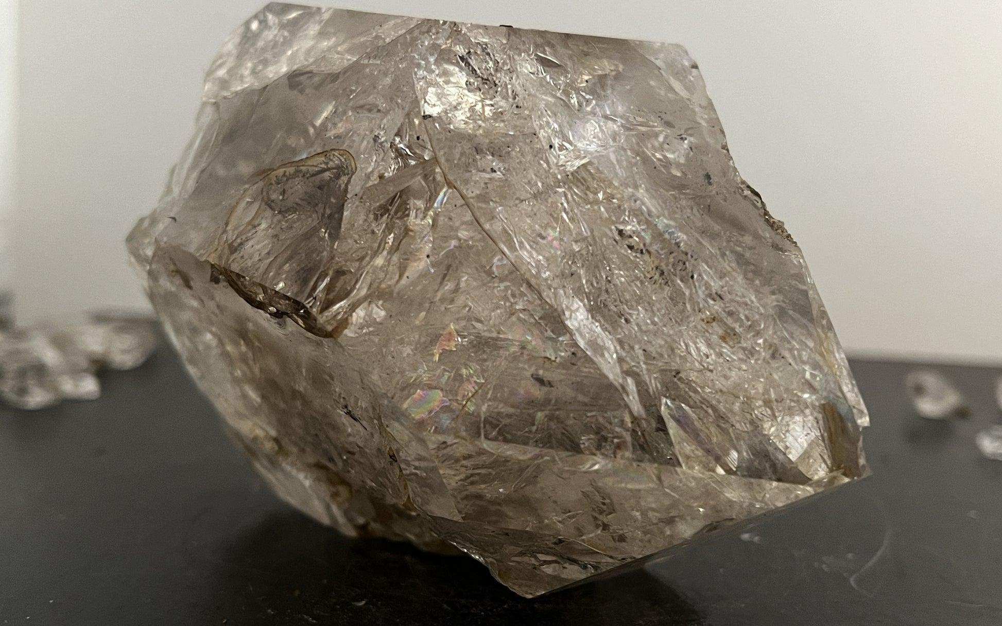 This goonie is a classic with a single blowout and a typical goonie base. Its smooth faces and crackly interior enhance the reflections and rainbows. Additional interest is added with cave muck* and anthraxolite inclusions. This fascinating specimen weighs 1.4 pounds and measures roughly 5" x 2.75".