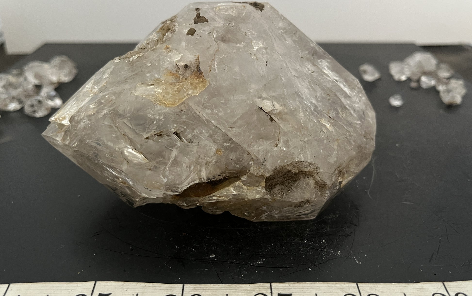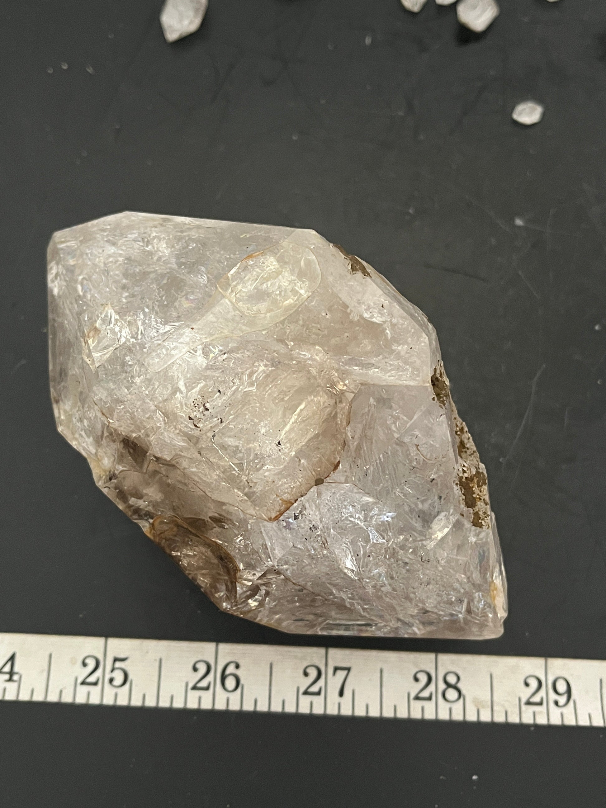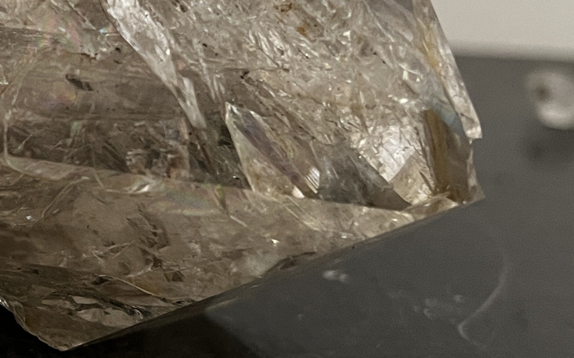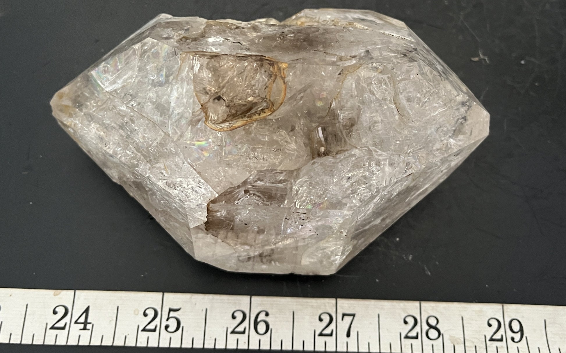 This goonie is a classic with a single blowout and a typical goonie base. Its smooth faces and crackly interior enhance the reflections and rainbows. Additional interest is added with cave muck* and anthraxolite inclusions. This fascinating specimen weighs 1.4 pounds and measures roughly 5" x 2.75".