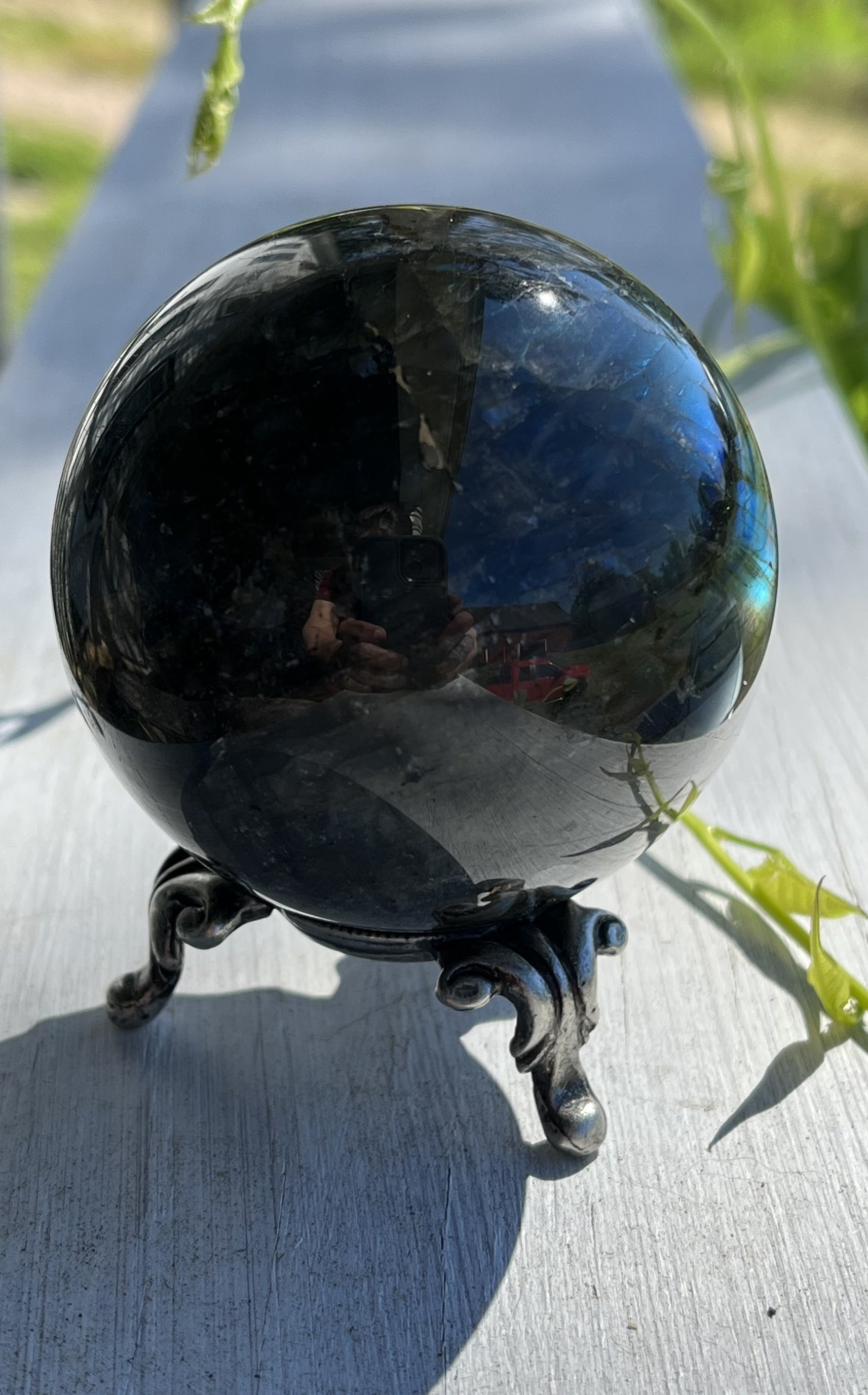 The sphere comes with a plain lucite stand, however, we offer pewter, agate, and wood stands.