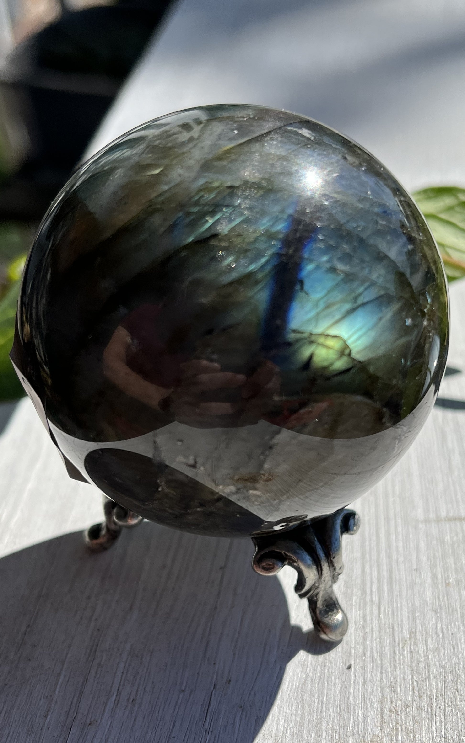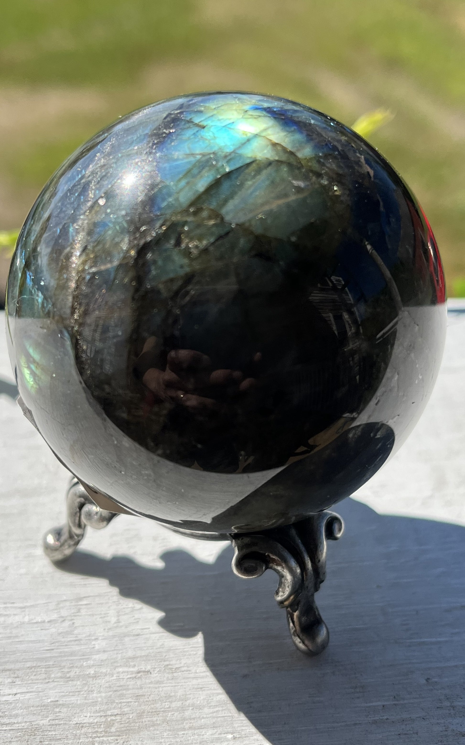 This sphere does not disappoint - loaded with blue, gold, and flashes of green sparkle in the light. 2.25" 10.45oz