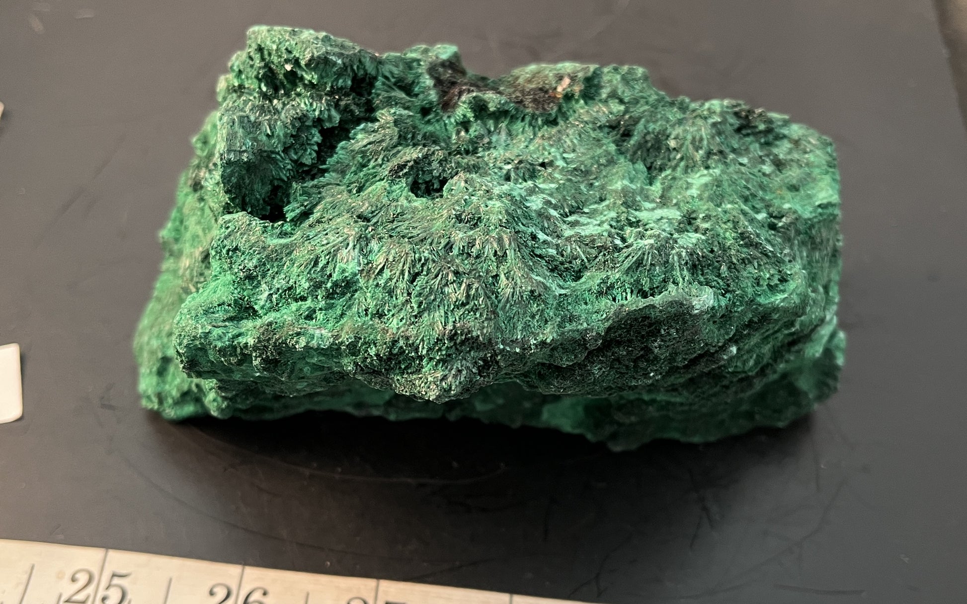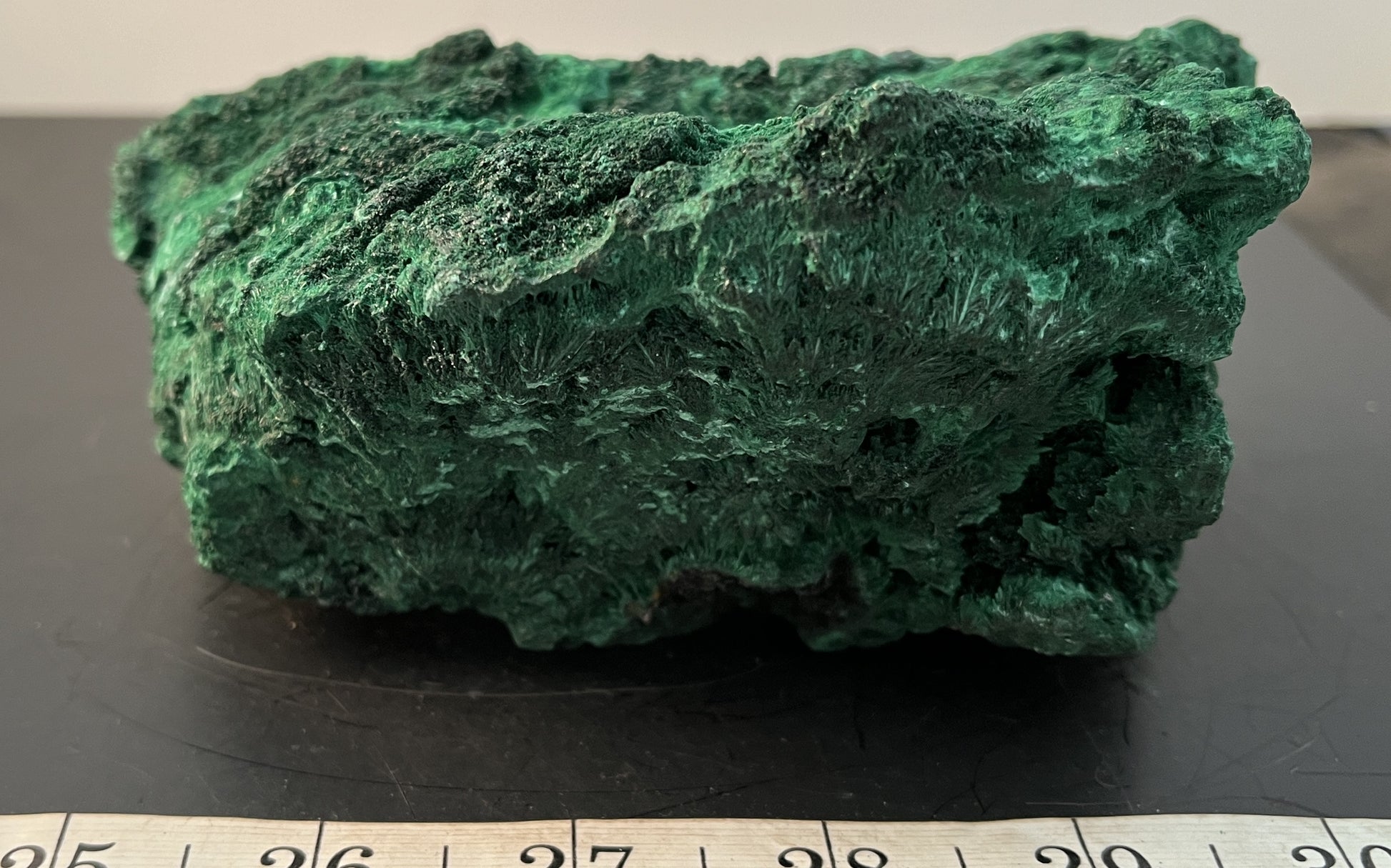 Malachite usually appears in botryoidal, fibrous, or stalagmitic formations within fractures and subterranean cavities, where chemical precipitation occurs due to the presence of a water table and hydrothermal fluids. Its fibrous appearance consists of strands that are often grouped in clusters, with multiple clusters facing varying directions. This specimen boasts a distinctive shimmer and a range of green hues. Measuring approximately 5" x 5" and weighing 2.55 lbs.