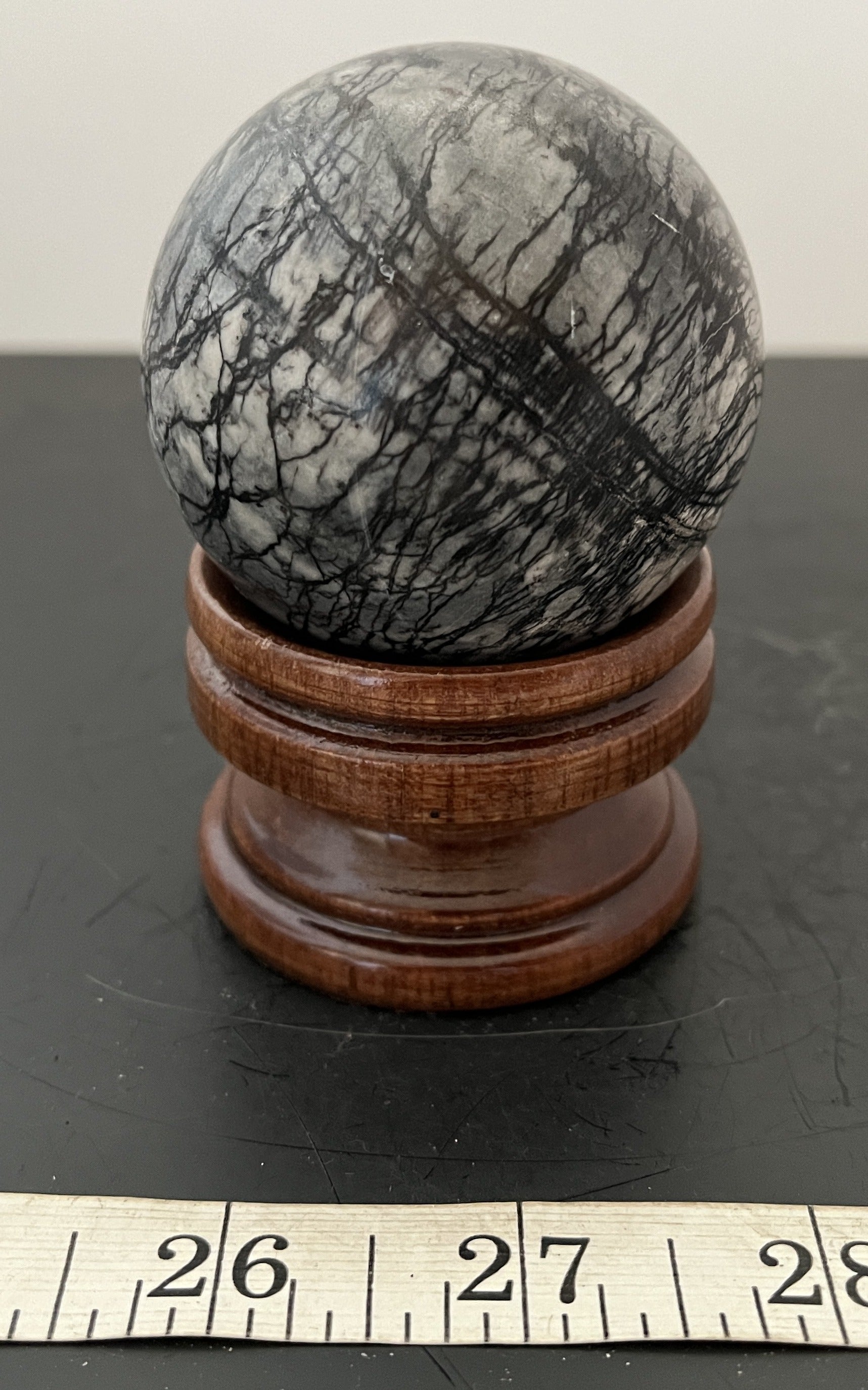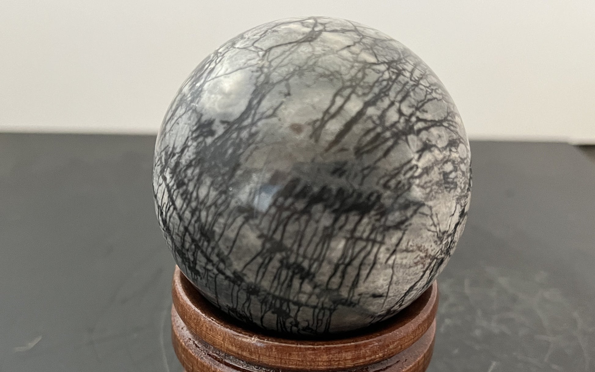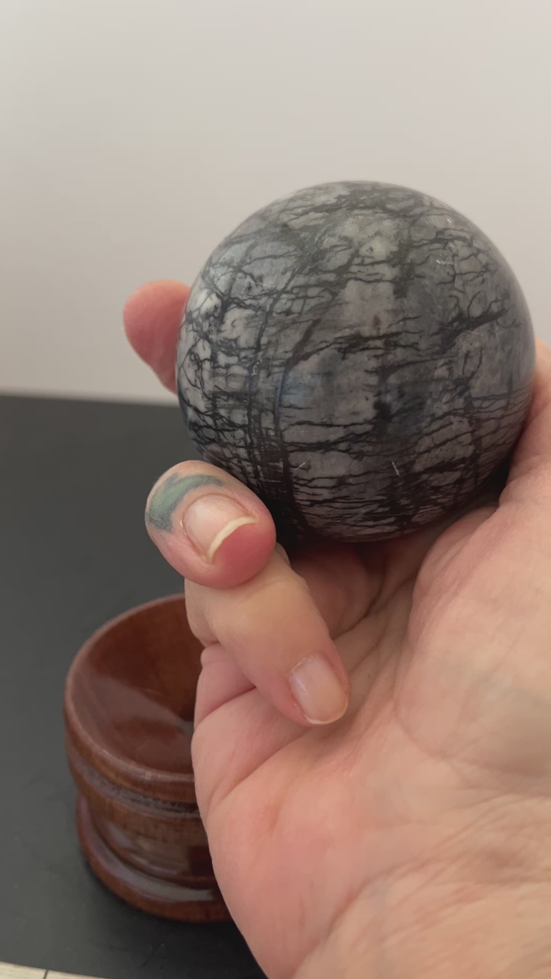 Picasso jasper, which can also be referred to as Picasso stone, is a metamorphic limestone rather than a jasper. Its defining features, including the mesmerizing layers and colors, are the products of intense heat and pressure within the Earth, while the linear patterns are created by iron oxides. This 61mm sphere is a beautiful combination of black and light gray, creating a dramatic effect.