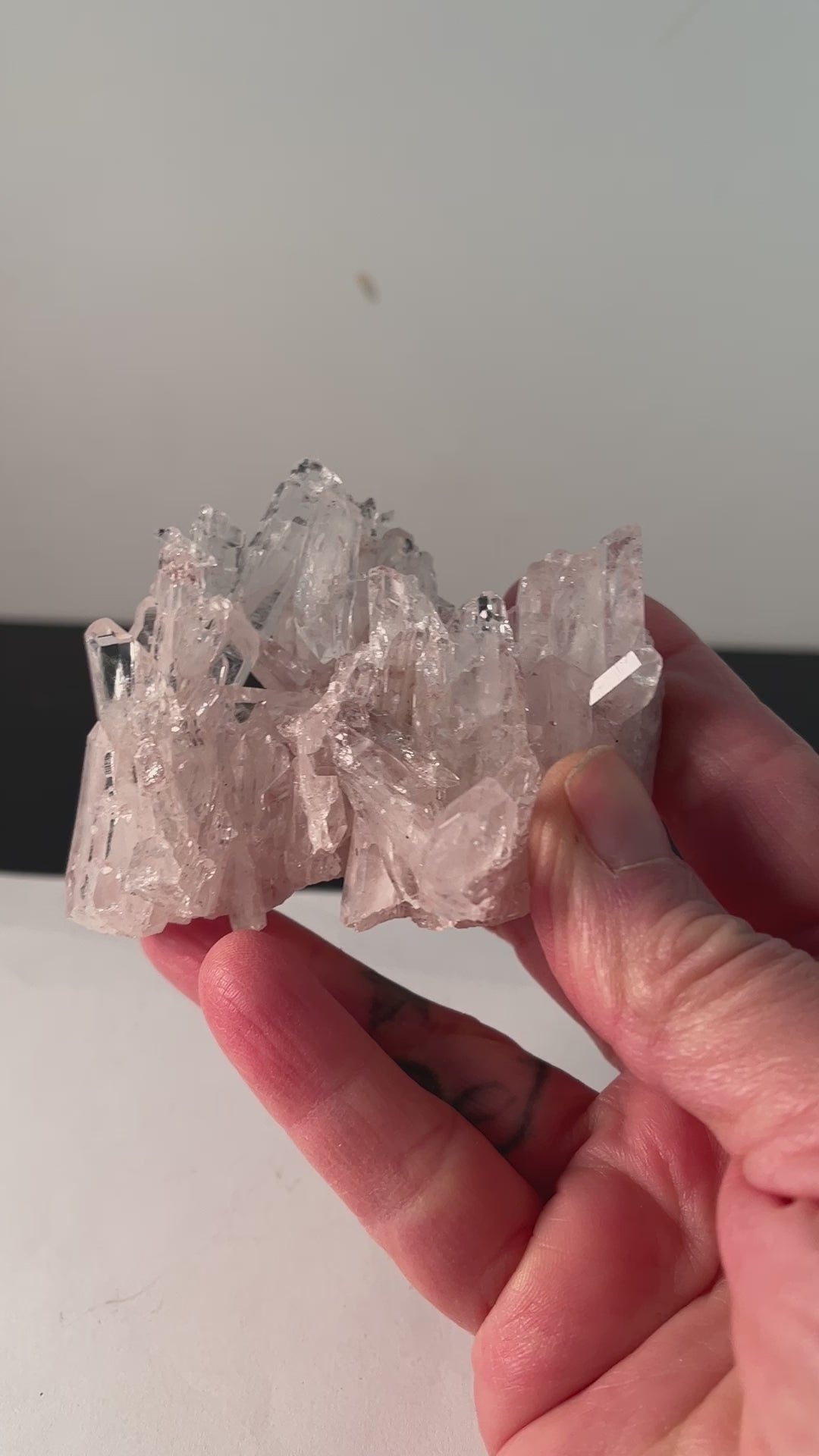 This cluster of small, soft pink Lemurian Faden Quartz crystal points has excellent clarity and reflects light beautifully. The pink hues are owed to Hematite, while the white thread-like lines are caused by fractures in the quartz formed by tectonic movement that heal as the crystal continues to grow.