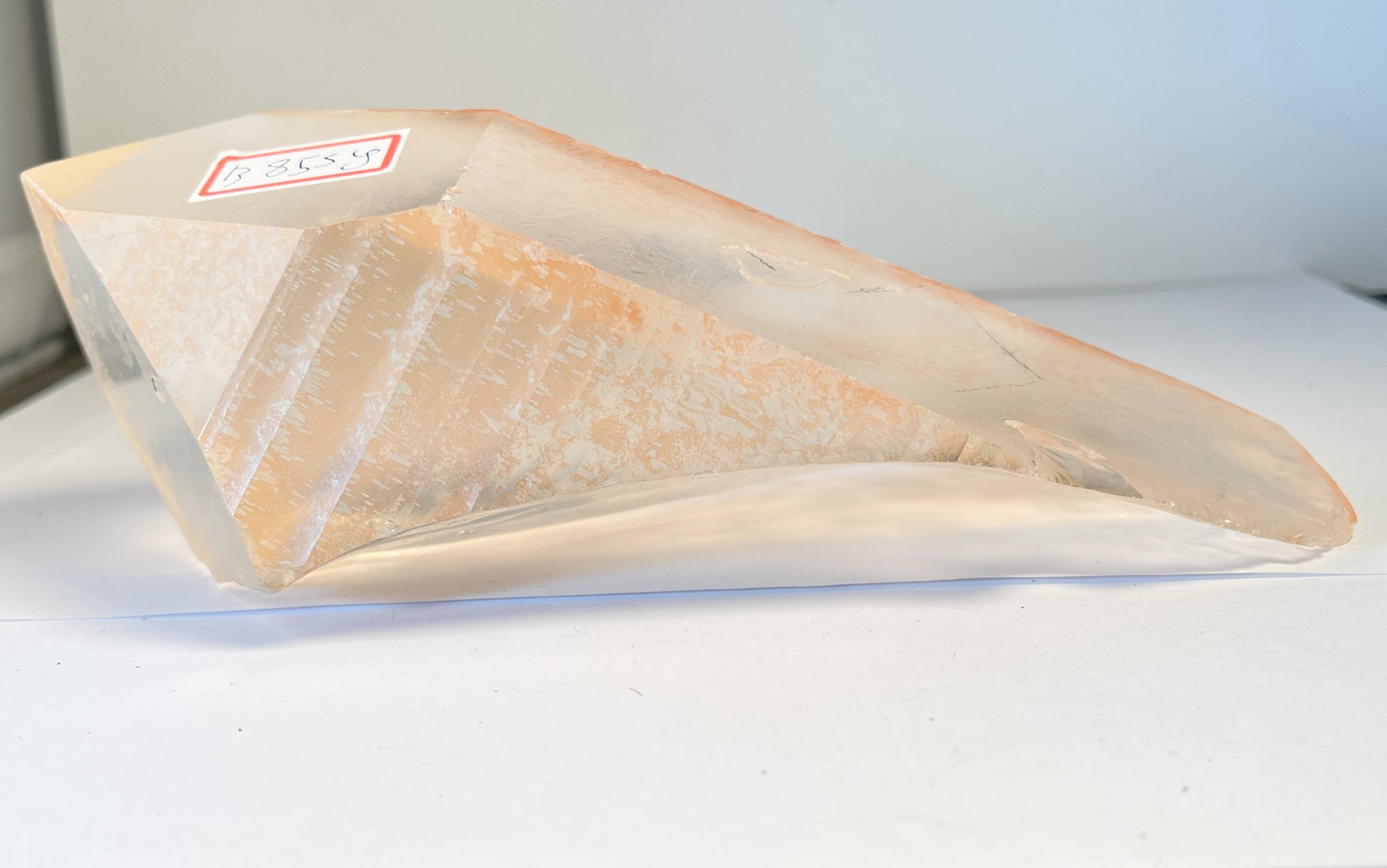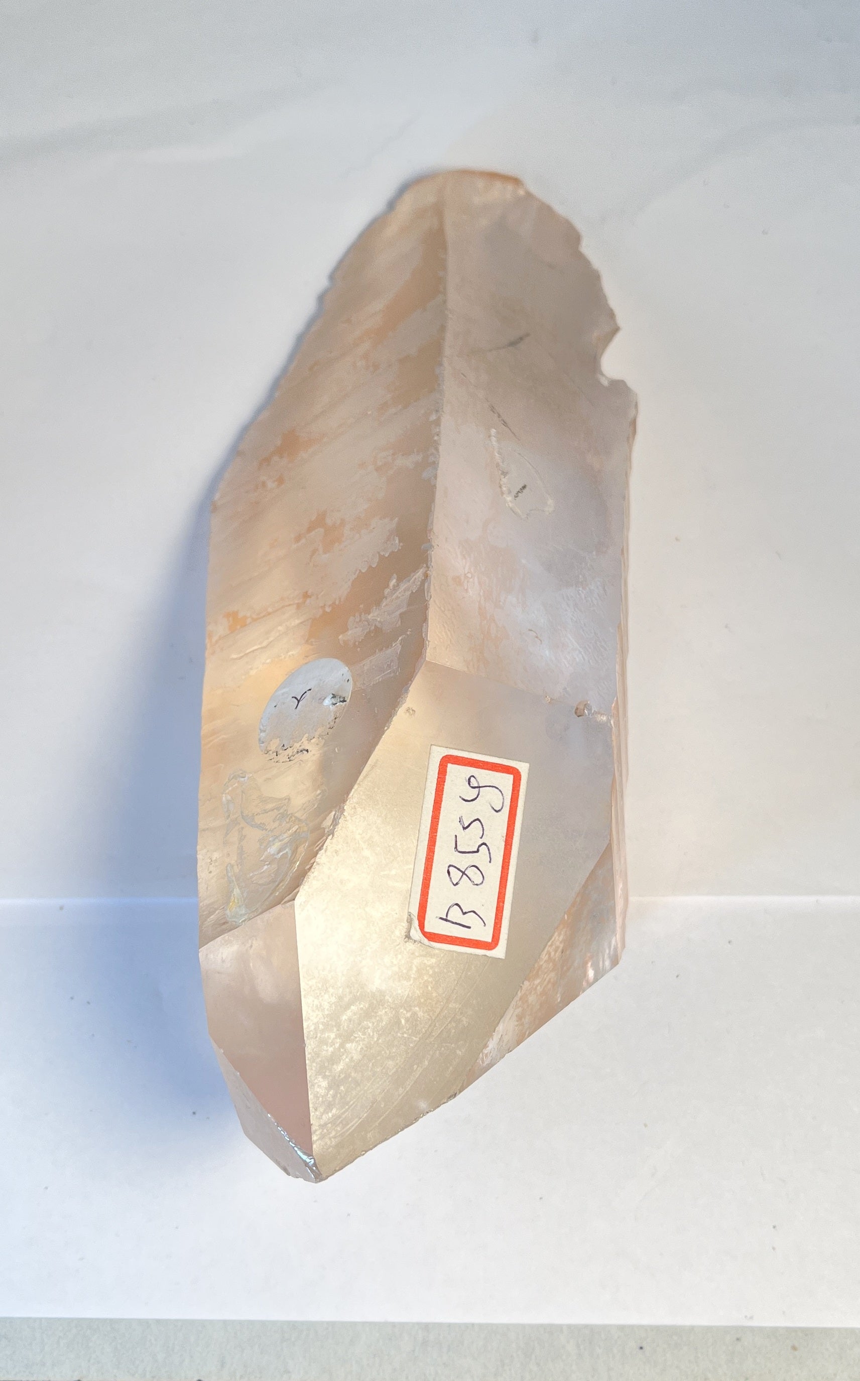 This Pink Lemurian Quartz 005 from Brazil features hematite striations and a unique shape. The quartz is known for its magnified healing properties and can provide a more powerful release of energy and concentration while meditating. Its distinct shape and pattern bring a unique and tranquil look to any space. 708 grams, 8"