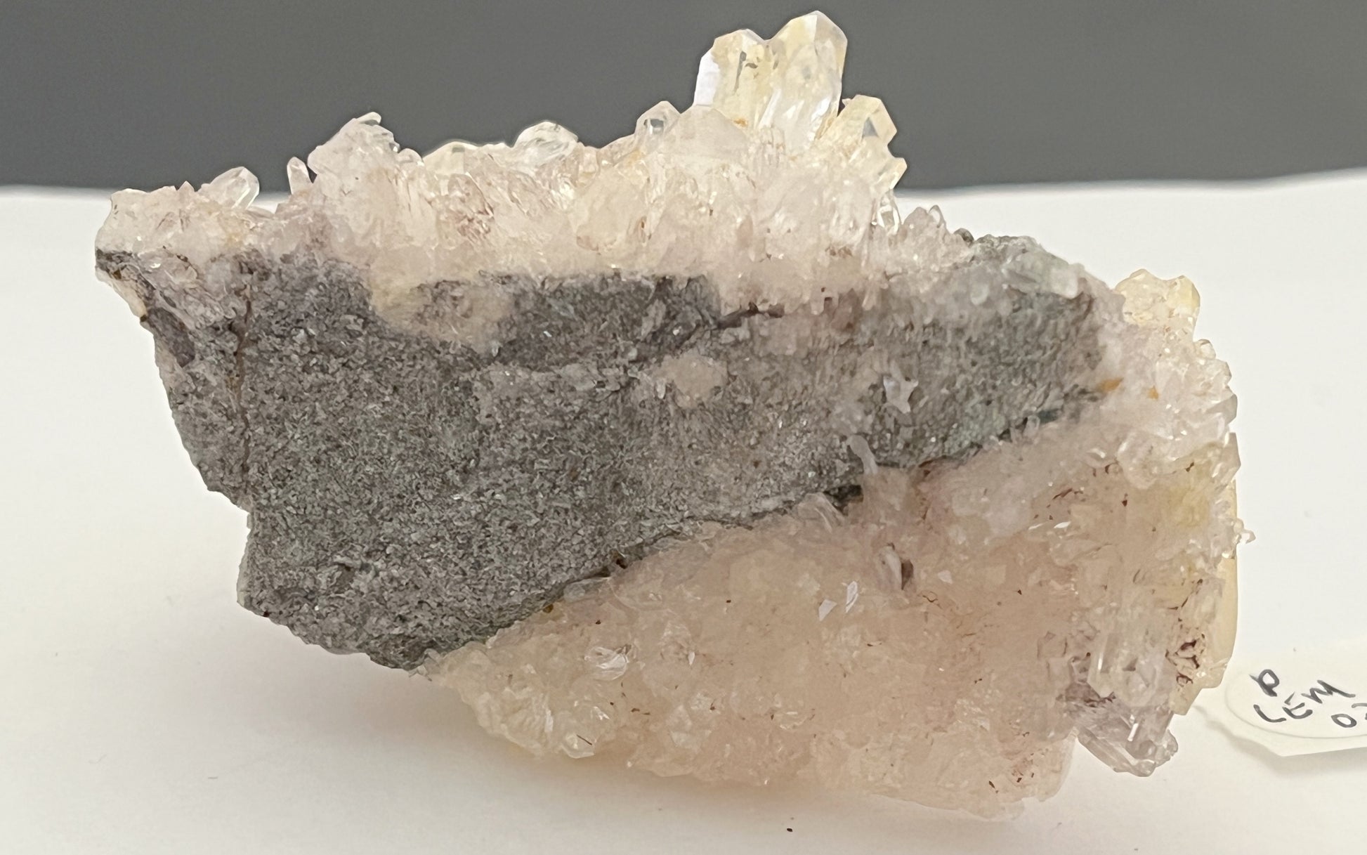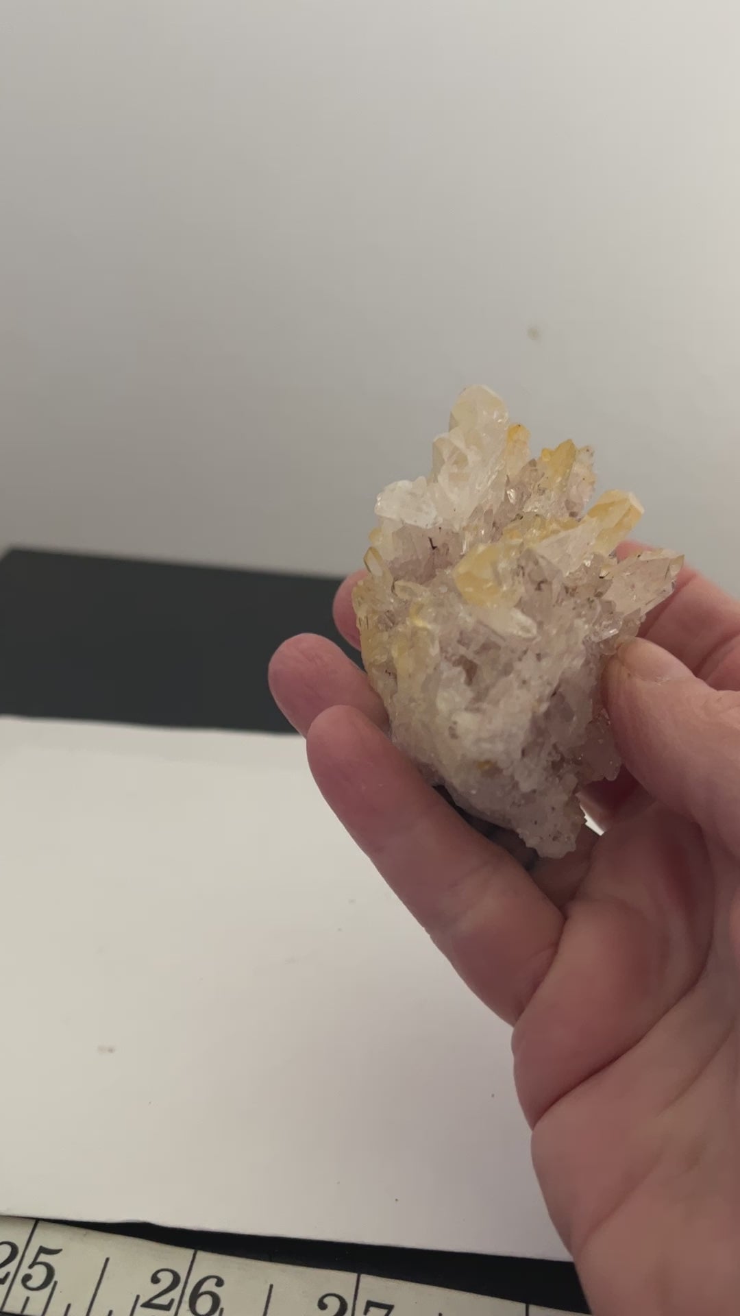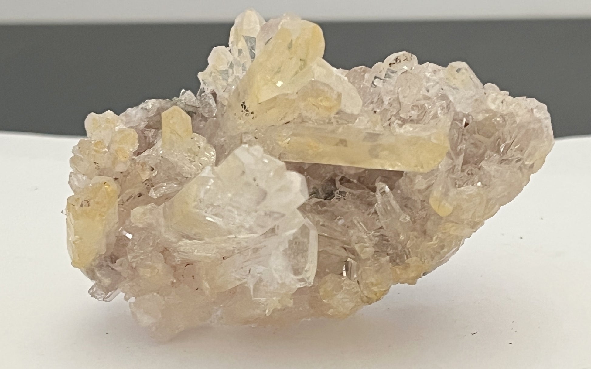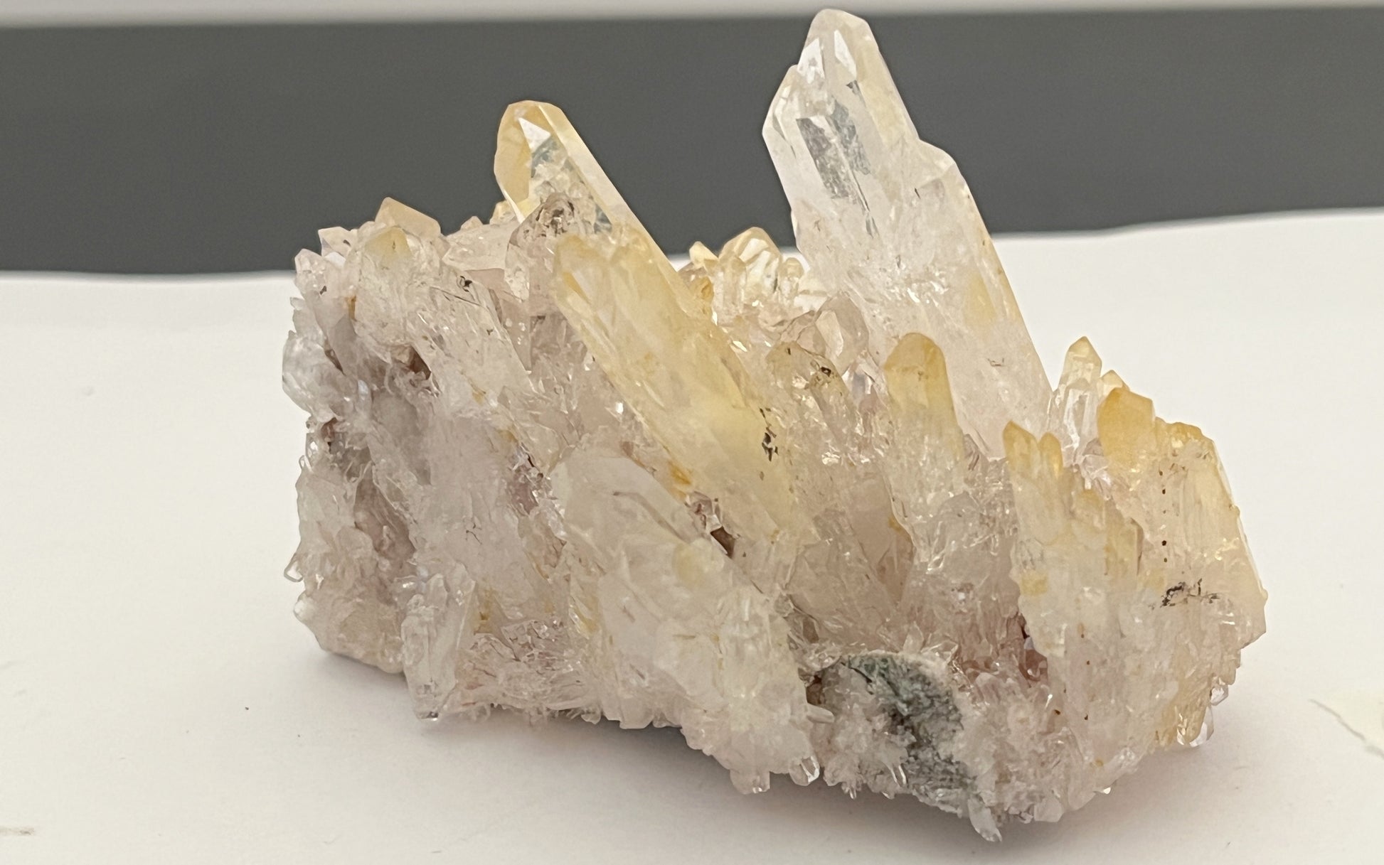 This Pink Lemurian Quartz specimen is taken from the Santander rainforest located in Colombia, an area well-known for its rare and valuable Lemurian Quartz. It features several minimized and expansive terminated points. A remarkable specimen, this Pink Lemurian Quartz is accurately balanced on its matrix, weighing 4.66 oz with dimensions of 3" x 1.5" x 2.5". There is a tinge of yellow on some of the points due to impurities included in the quartz.