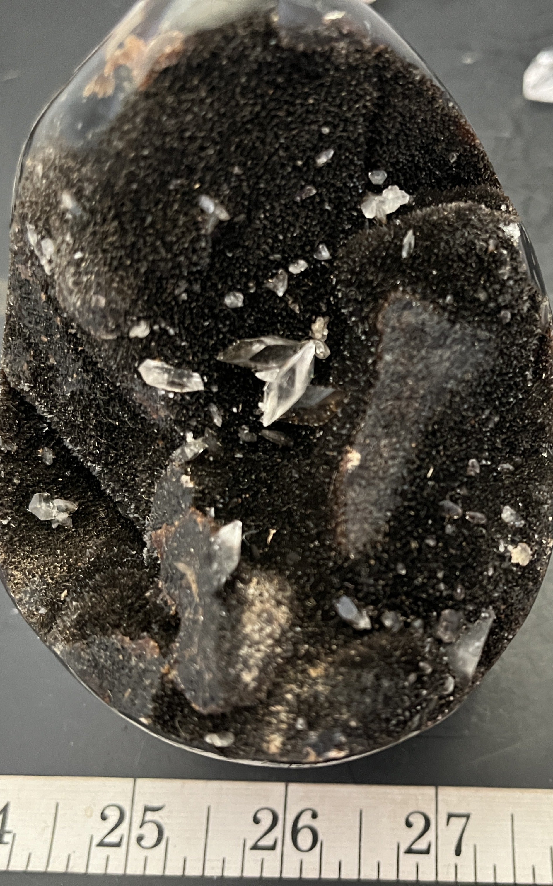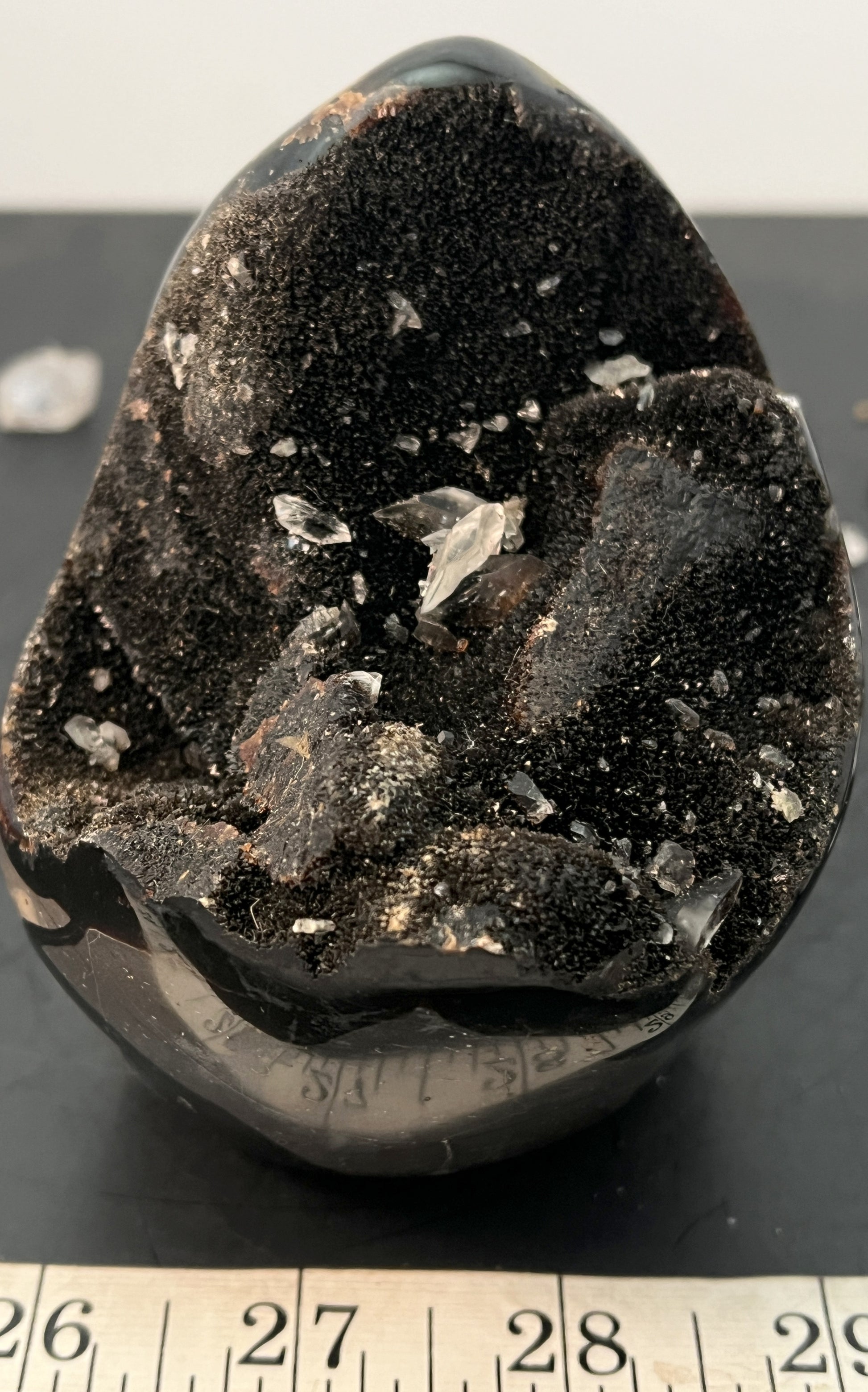 At 4" tall and 3.5" wide, this Septarian Geode is partially polished and features sparkling black drusy with Barite and Calcite crystals. It weighs a 1.70 lbs and is sure to make a unique addition to any collection.