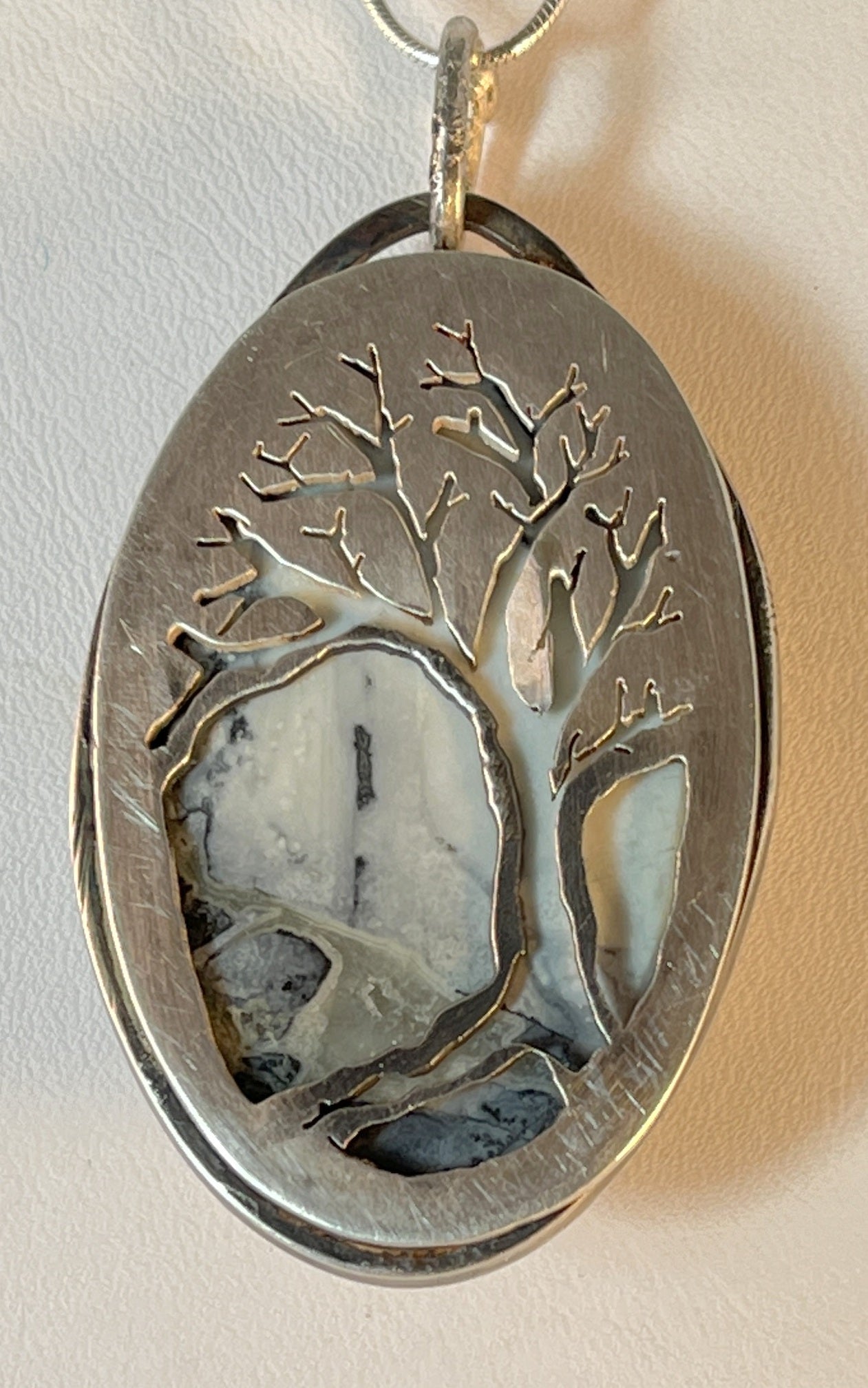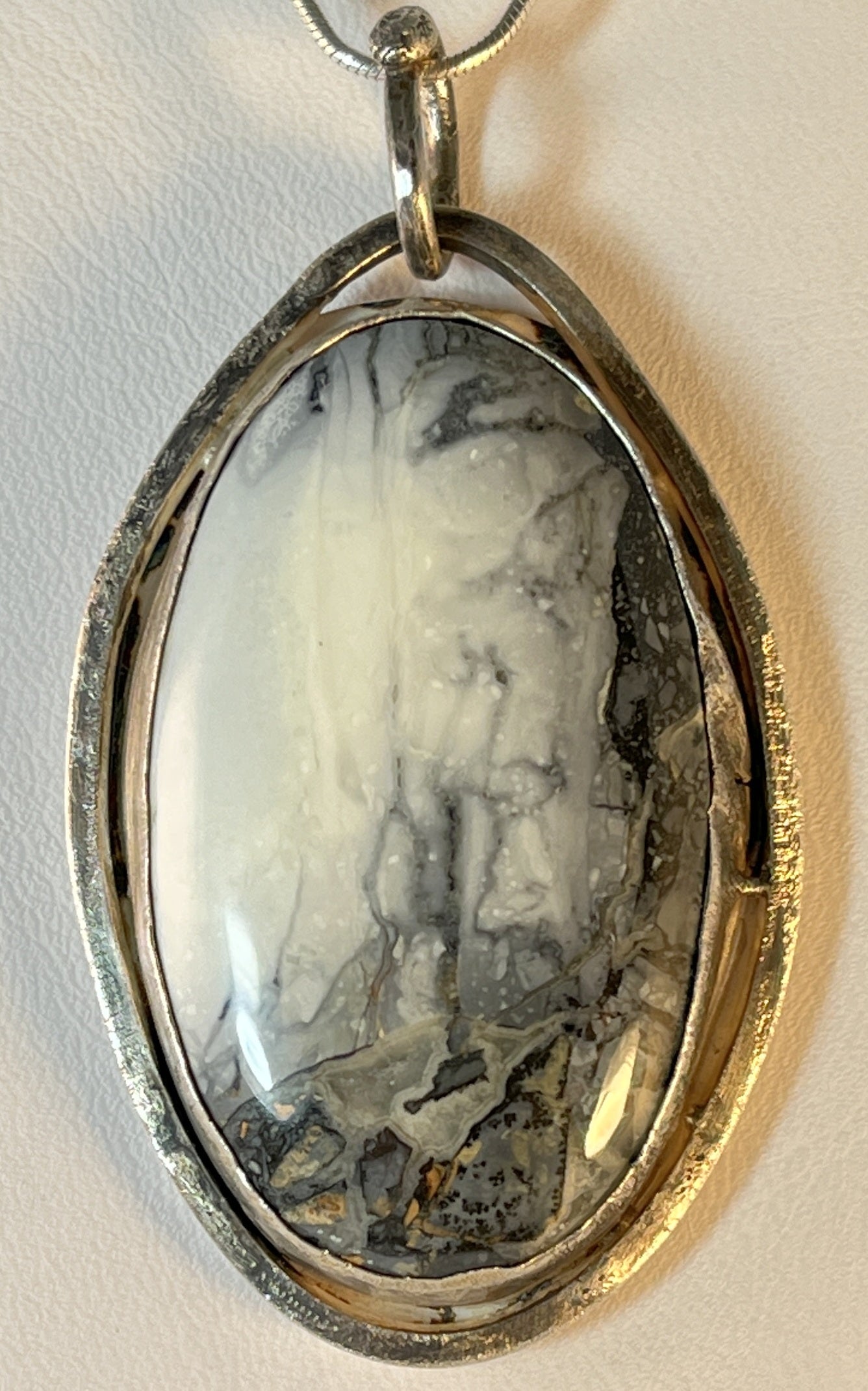 This Maligano Jasper's black and white composition symbolizes a tree in winter, resetting internally to weather the cold and emerge anew in the spring. It encourages a reminder of inner renewal and the understanding that joy comes from within. The right side of the bezel is crafted to mimic the tree's natural curves and bumps, creating a lifelike representation that inspires hope and a return to clarity.